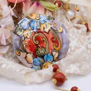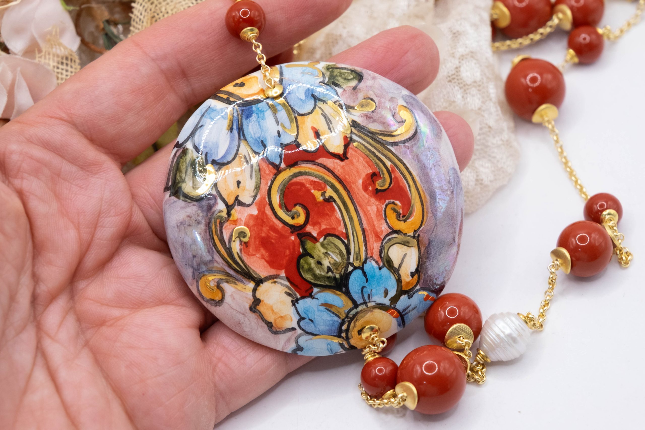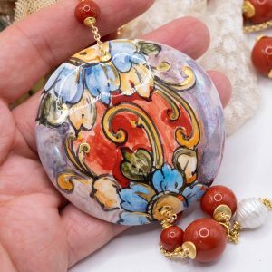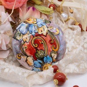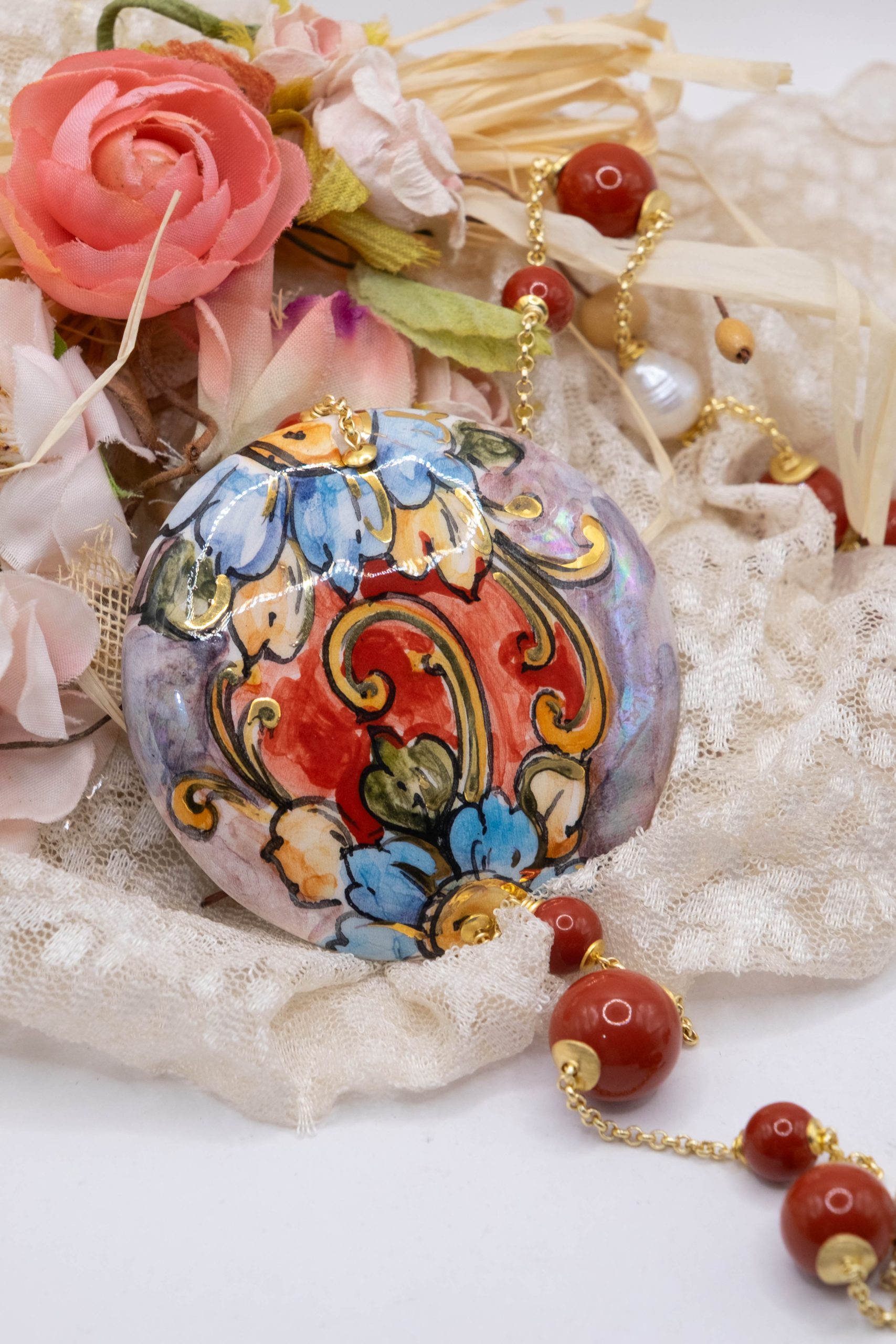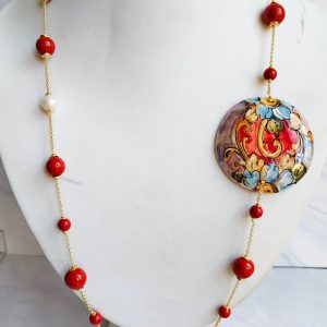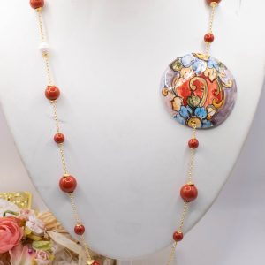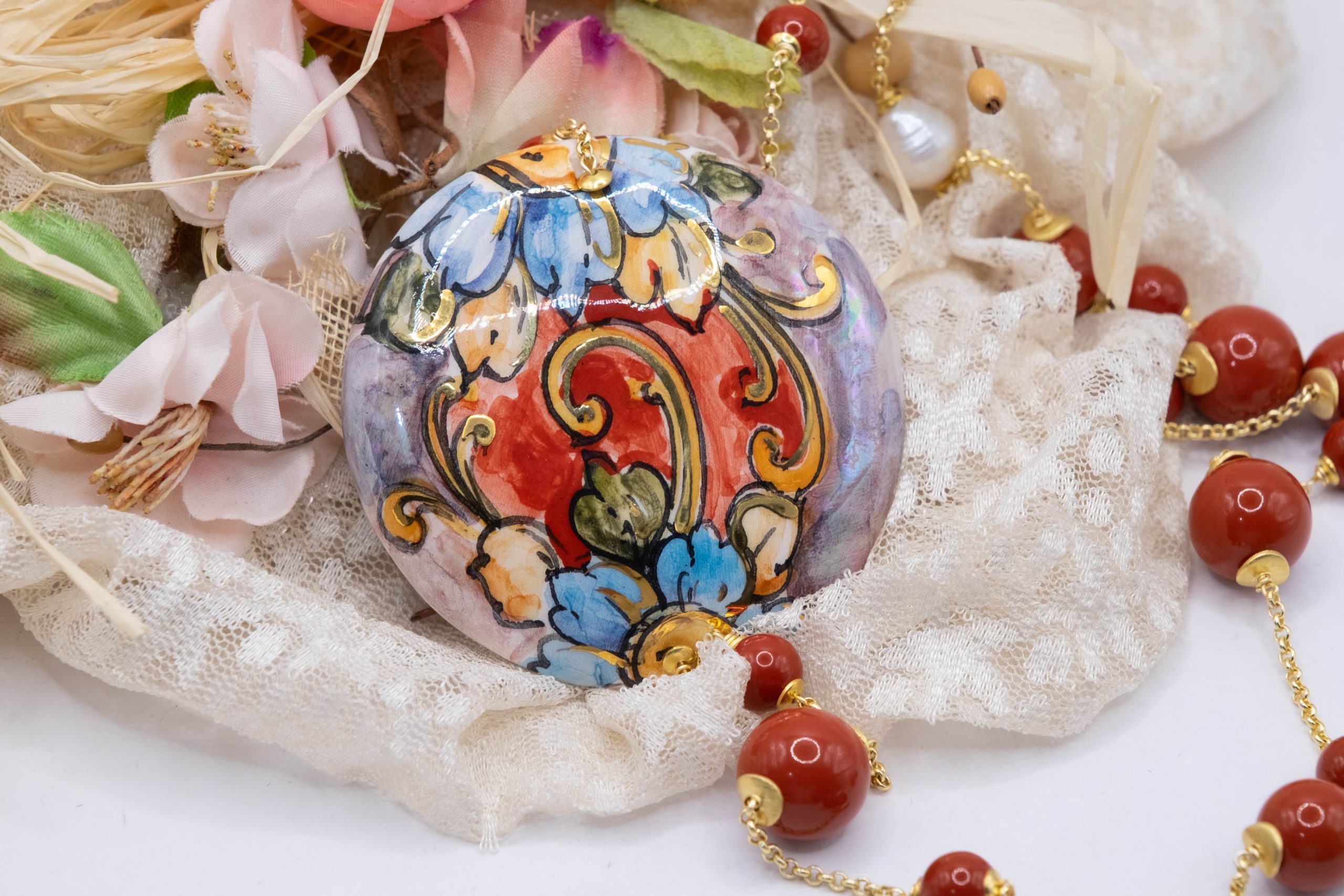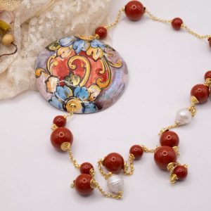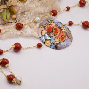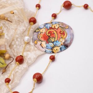 Necklace made entirely by hand, with a 6 cm Caltagirone ceramic plate, finely hand-decorated with pure gold with stylised flowers, with coral paste and genuine pearls