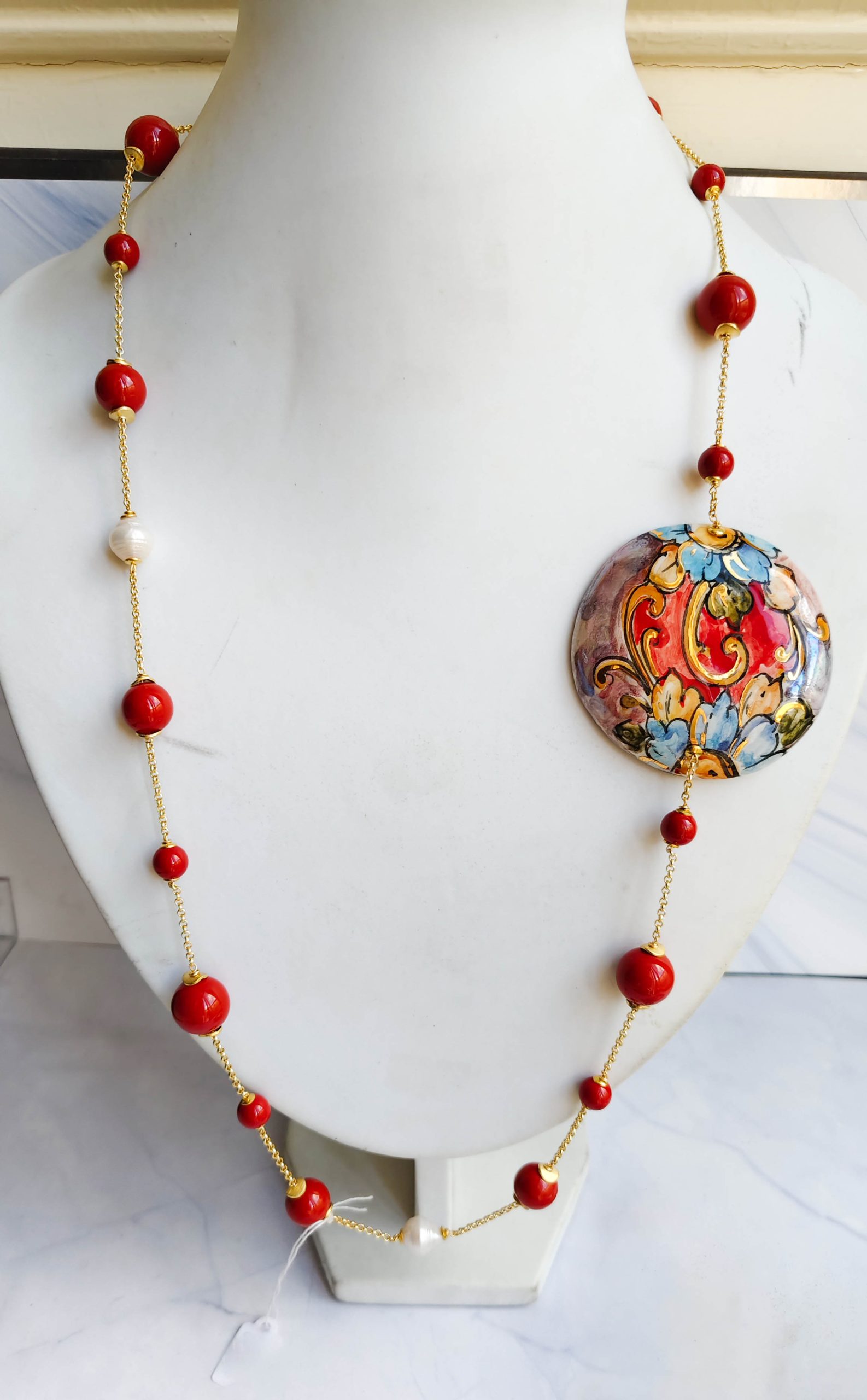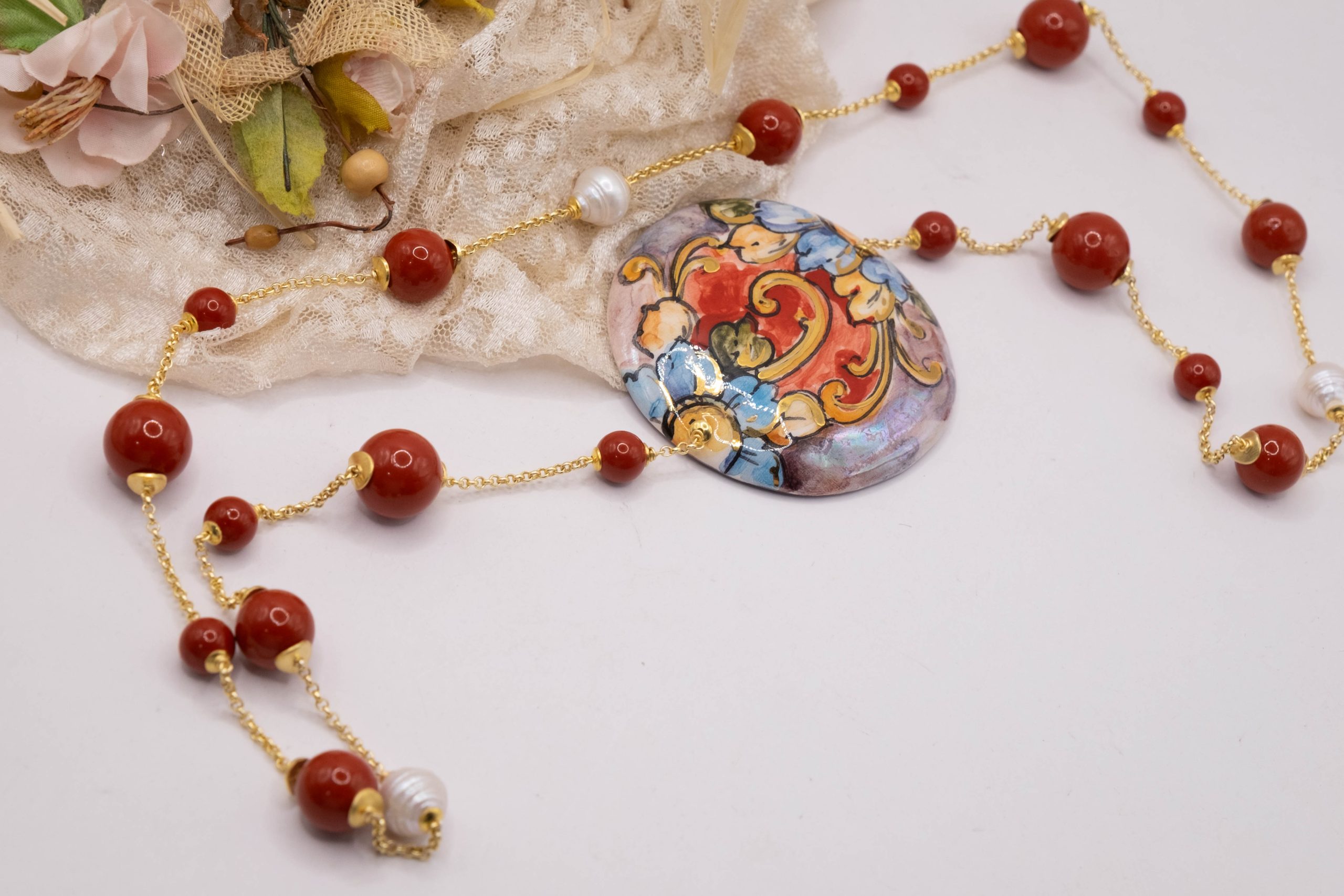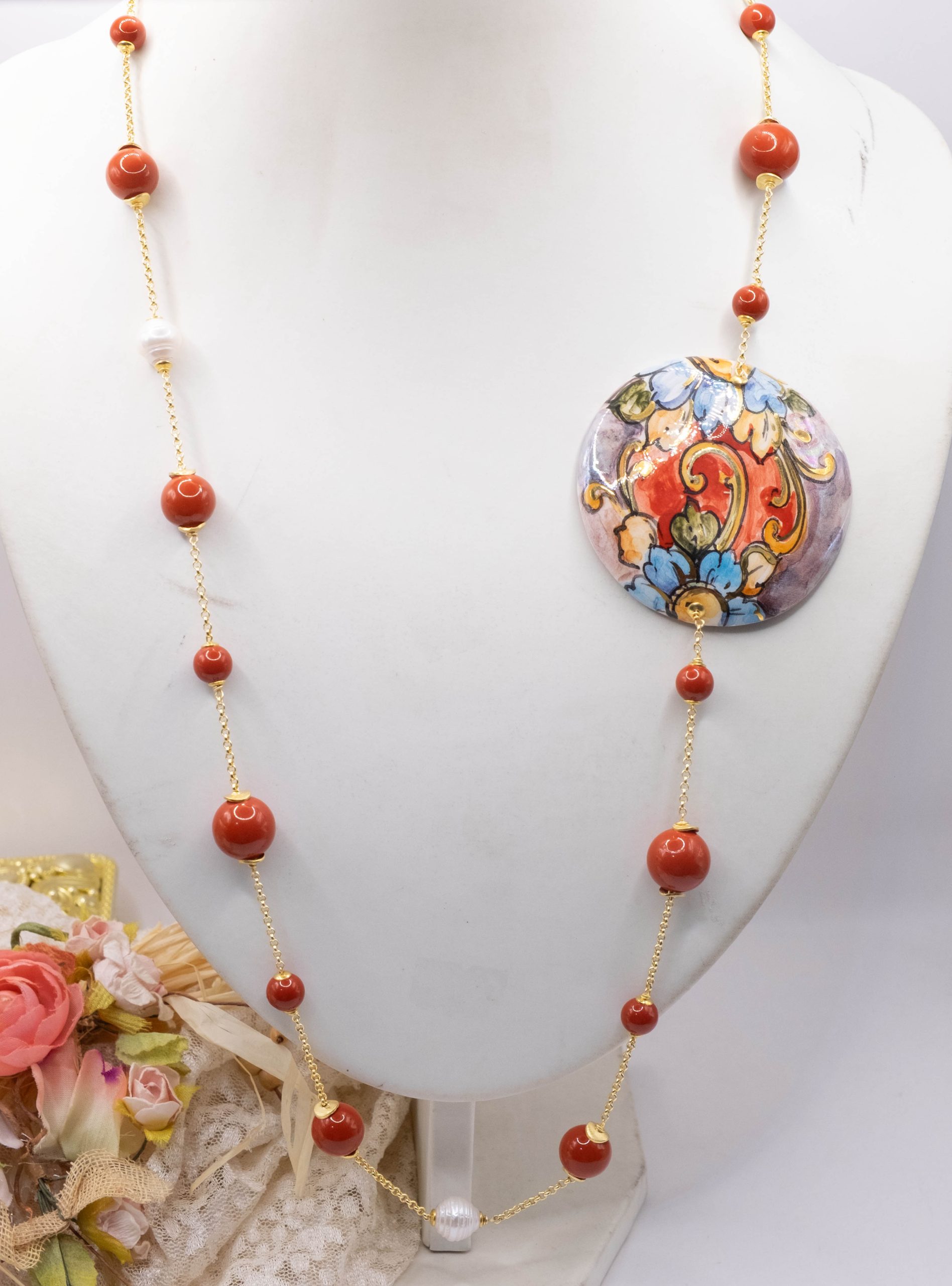 Caltagirone Ceramic Necklace with Coral Paste and Pearls