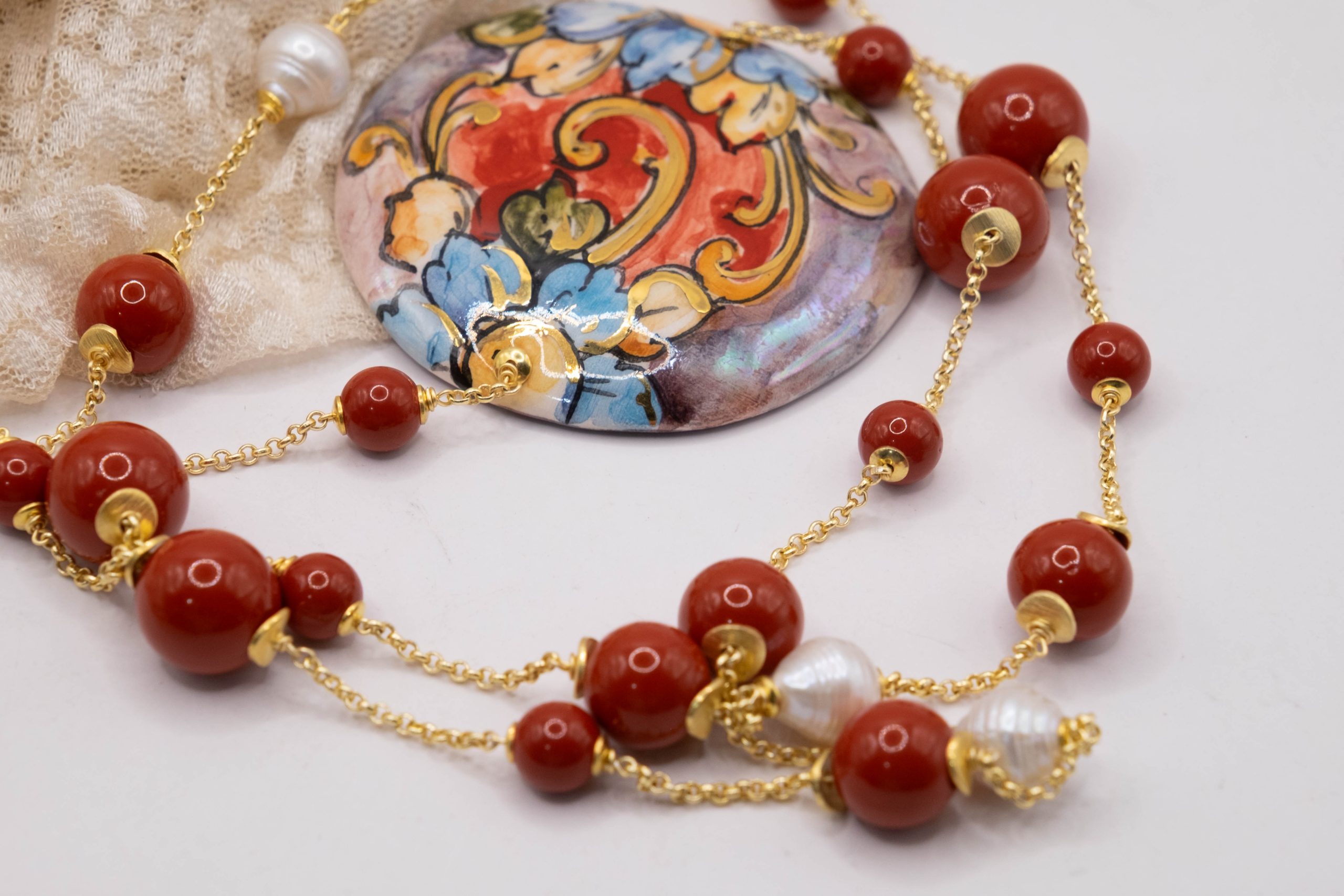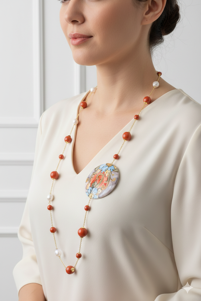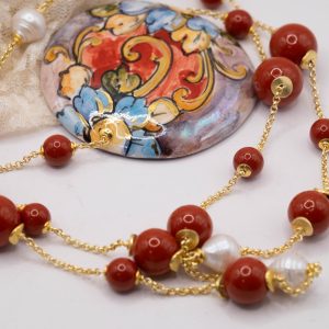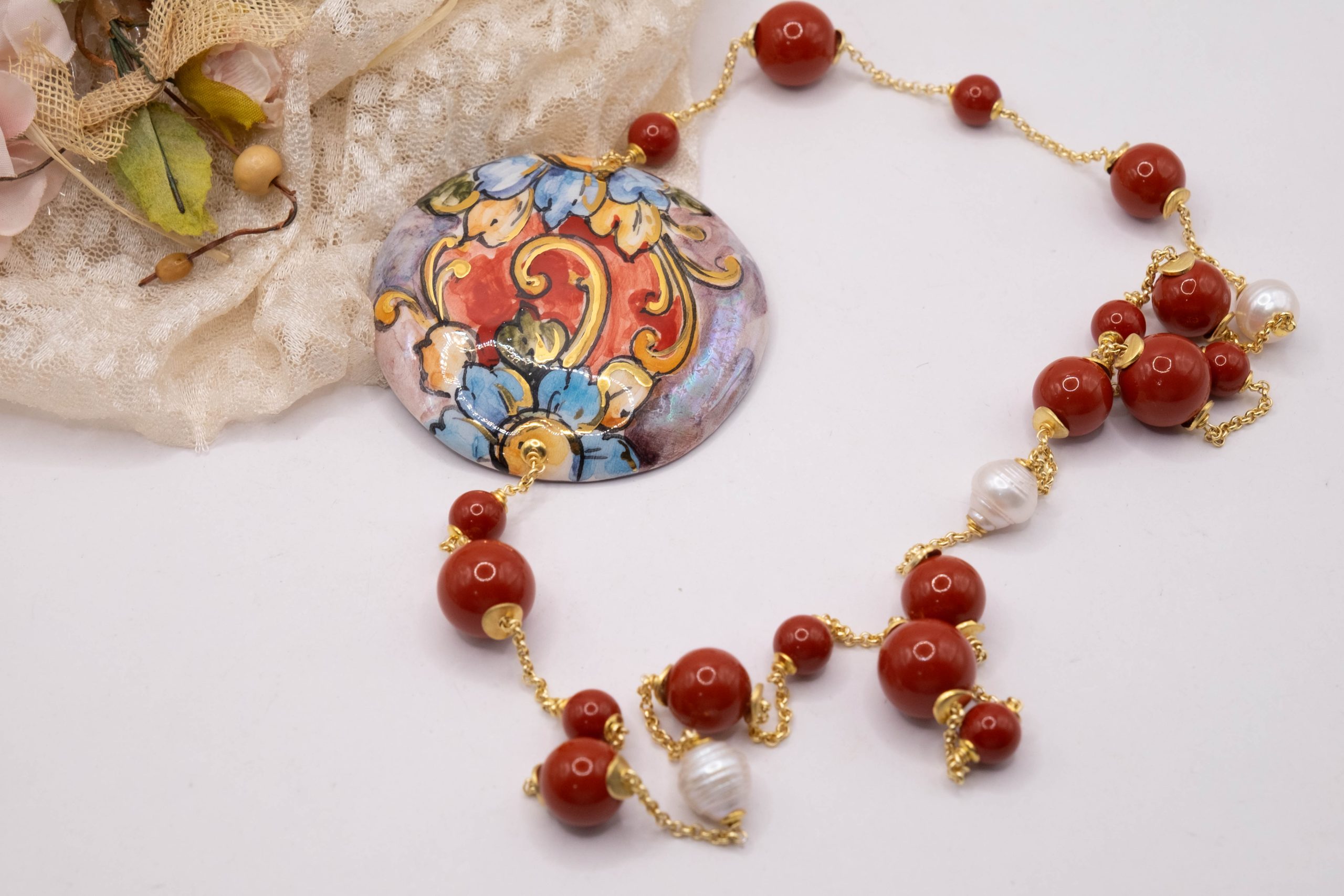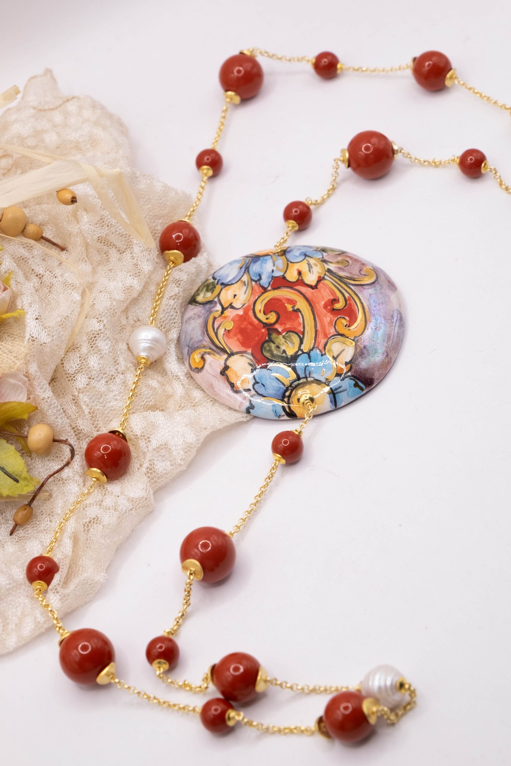 Caltagirone Ceramic Necklace with Coral Paste and Pearls