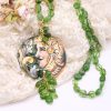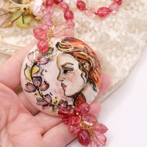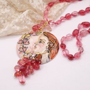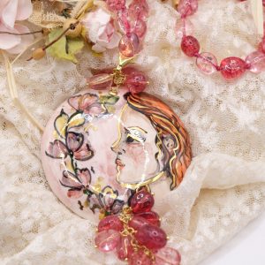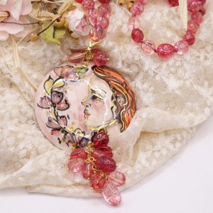 entirely handmade, with detachable Caltagirone ceramic pendant plate, finely hand-decorated with pure gold with cluster and lobster clasp and Fuchsia pink tourmaline necklace
