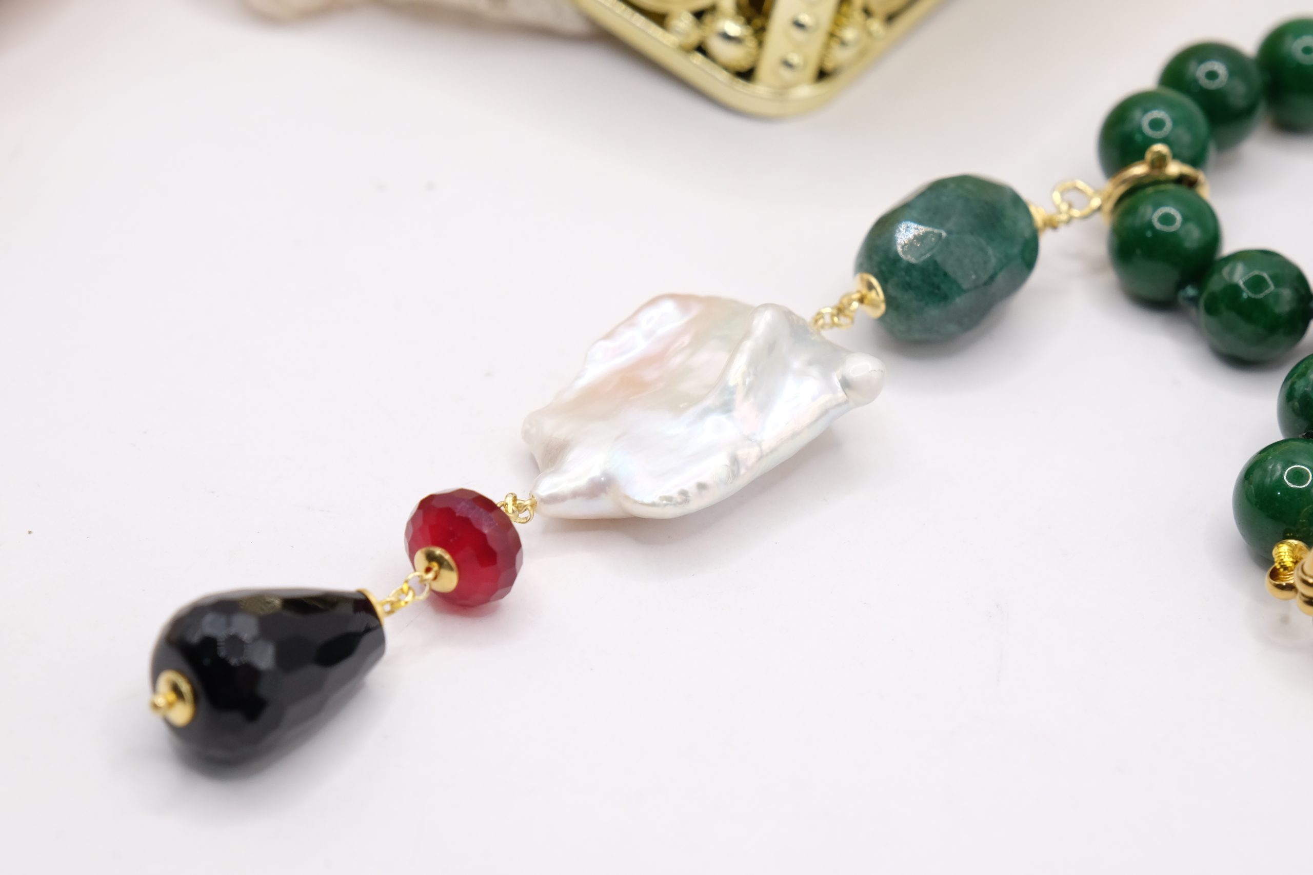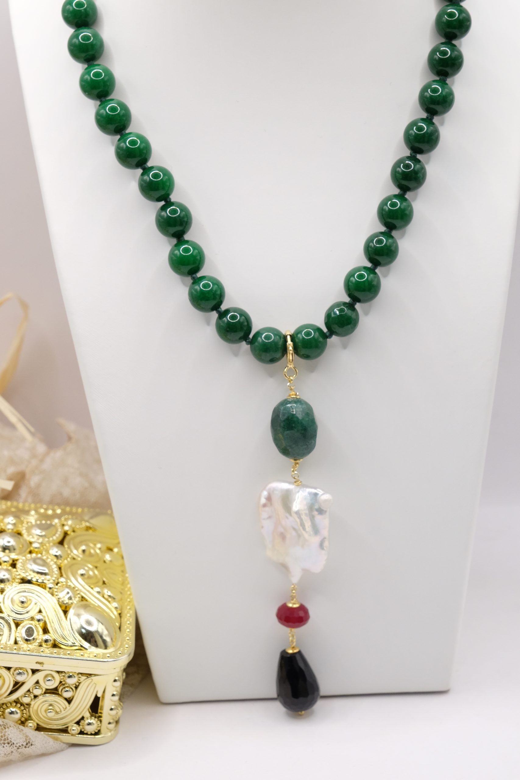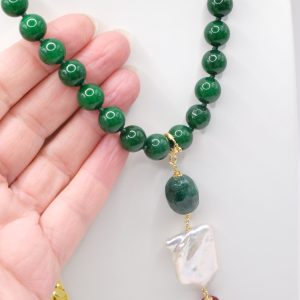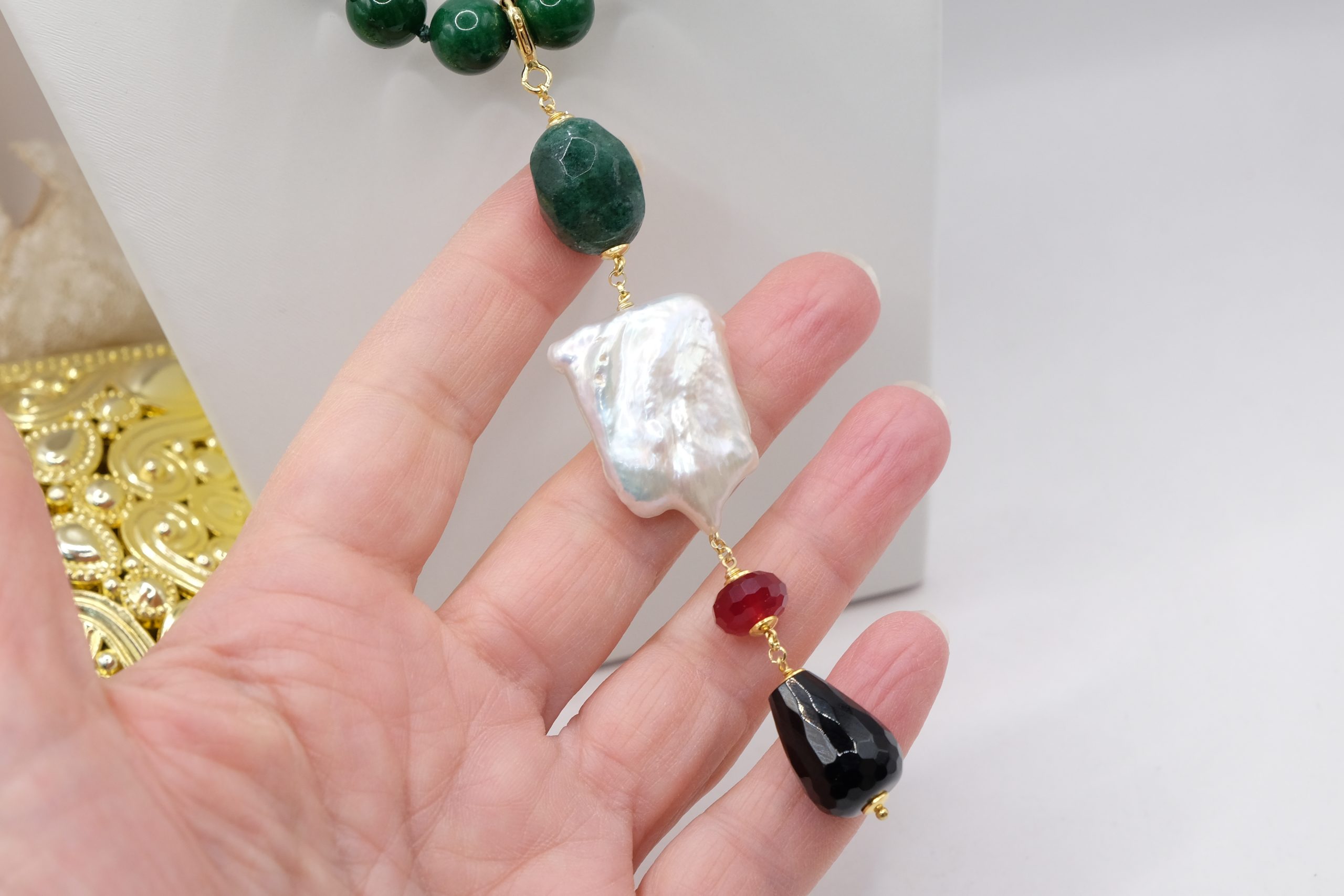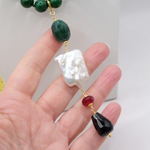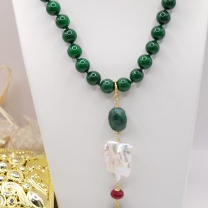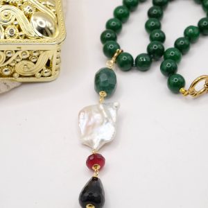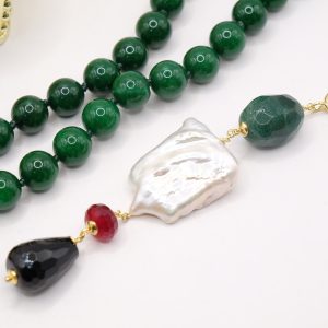 entirely handmade, with a detachable pendant in onyx, green chrysocolla, pearl and burgundy jade and a green jade necklace with a round gold-plated steel clasp that you can also wear with other pendants