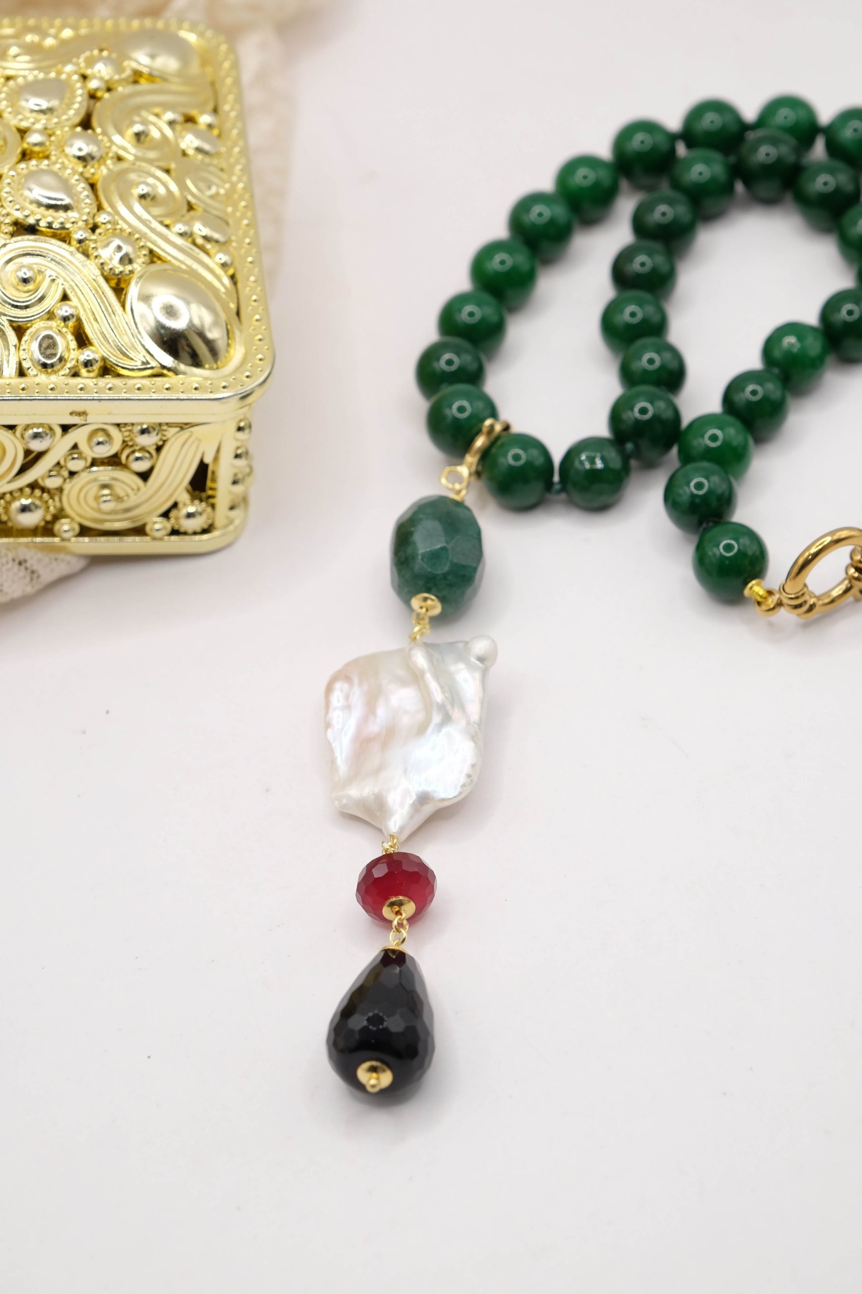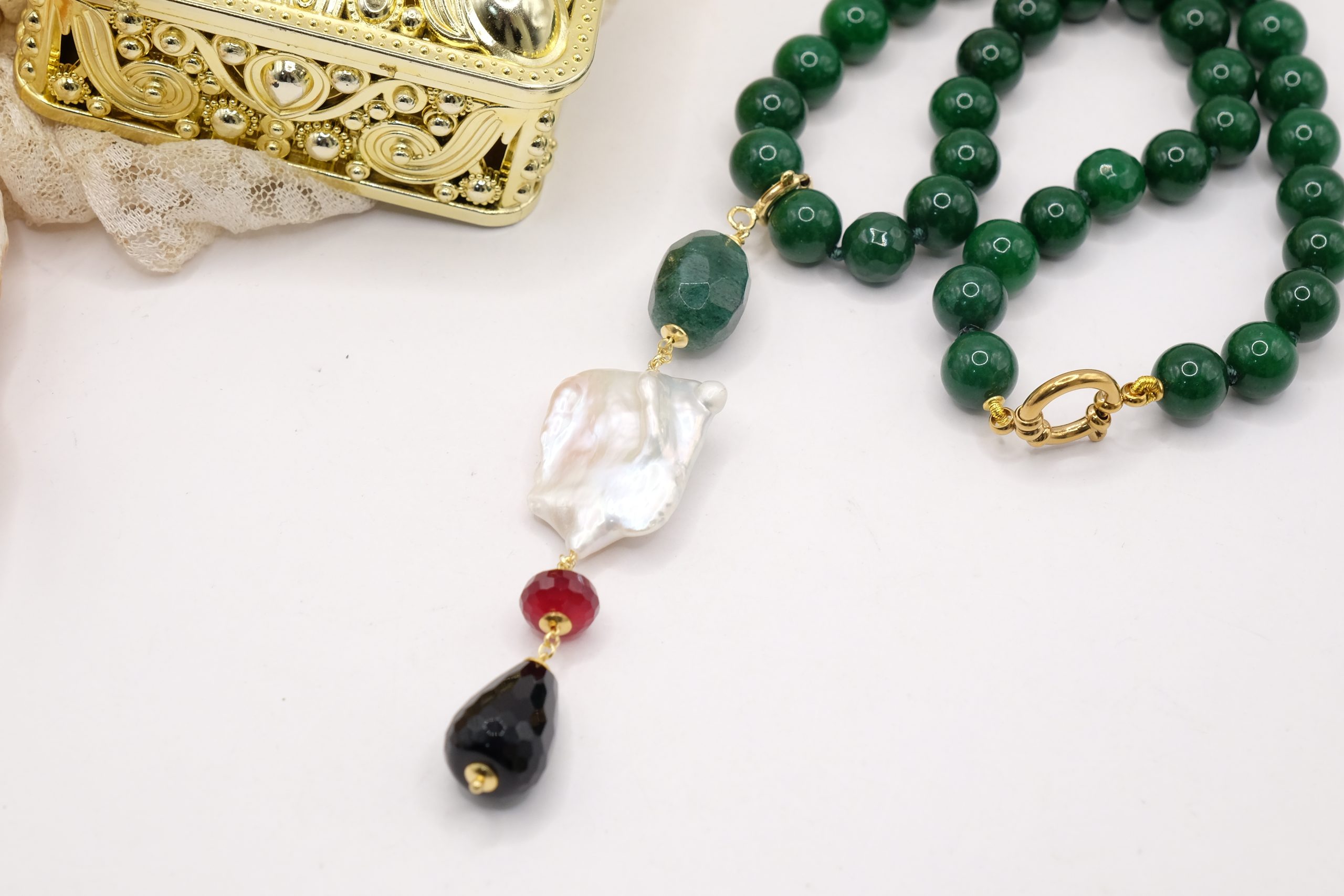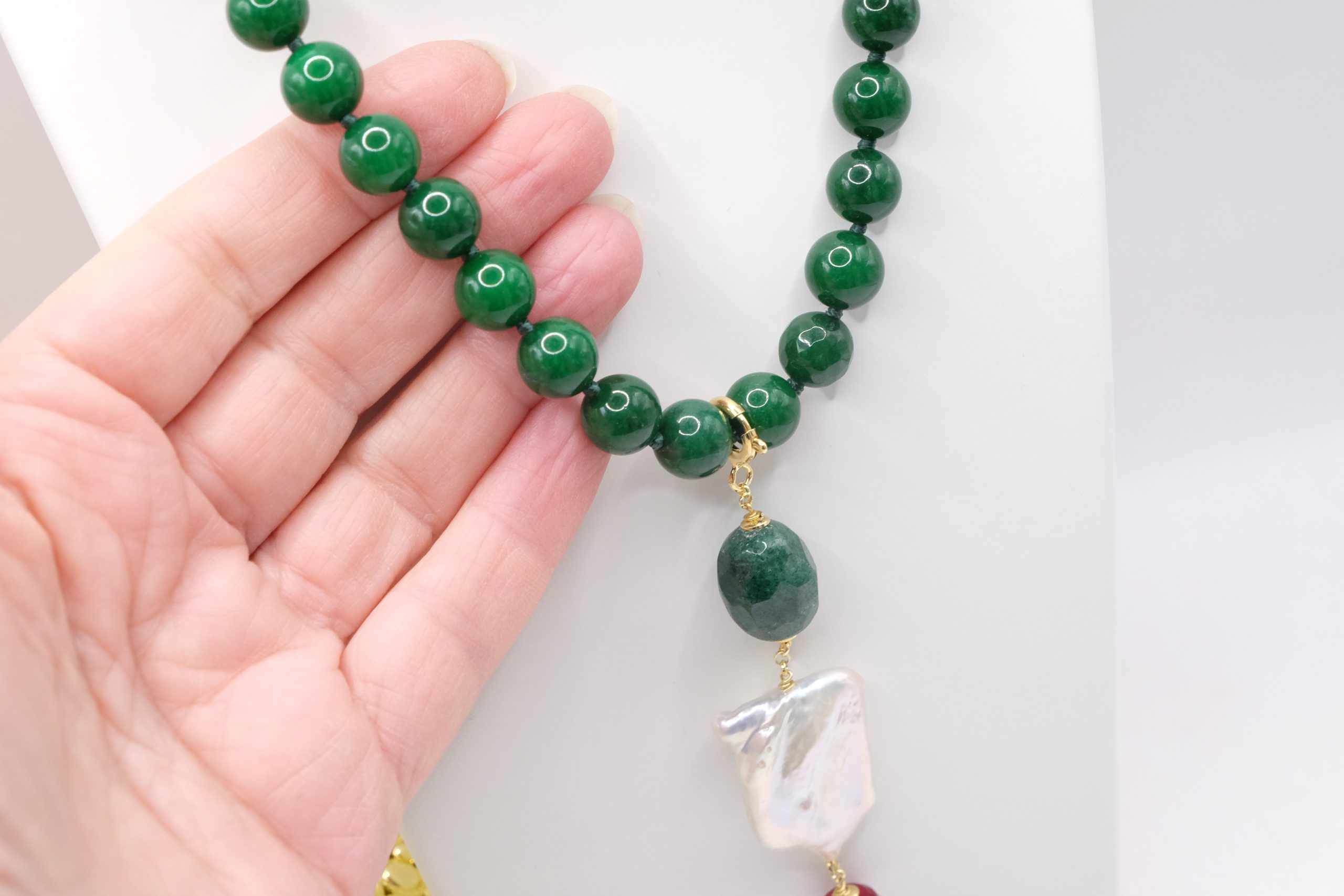 entirely handmade, with a detachable pendant in onyx, green chrysocolla, pearl and burgundy jade and a green jade necklace with a round gold-plated steel clasp that you can also wear with other pendants