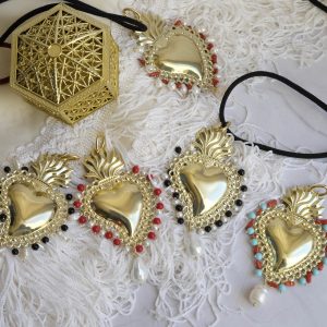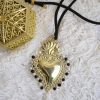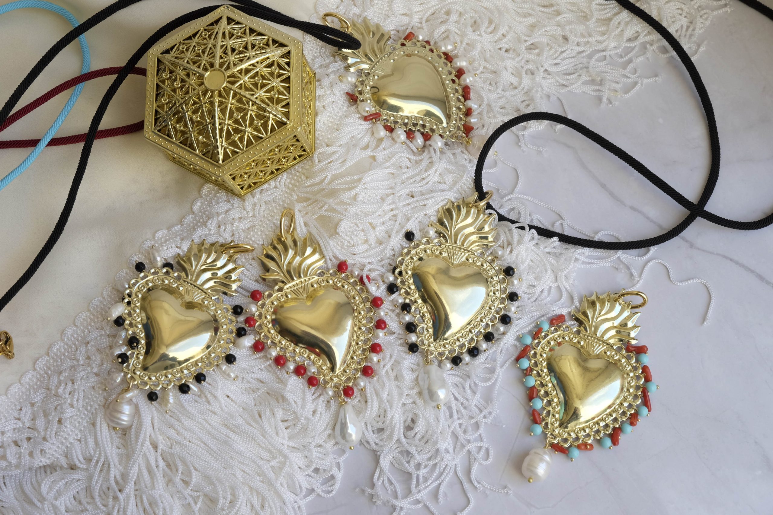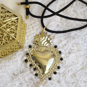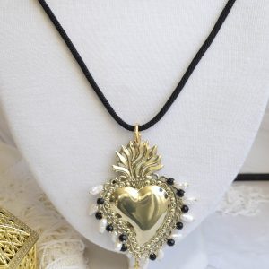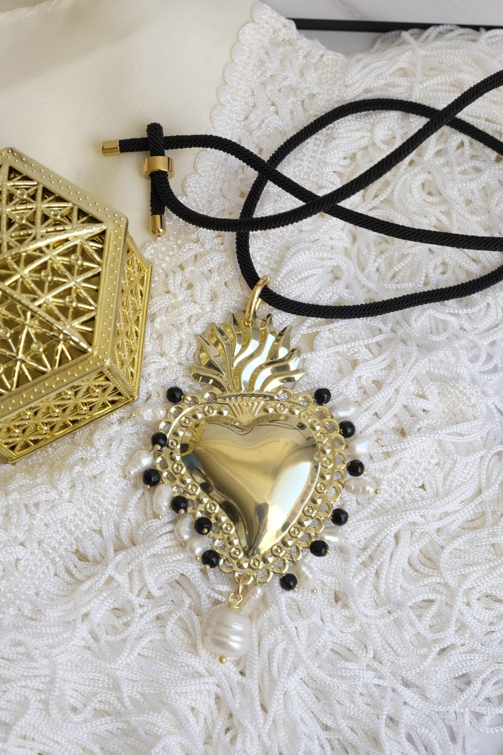 Necklace with cotton cord and detachable pendant, Sacred Heart, Ex Voto, in brass with natural pearls and onyx.