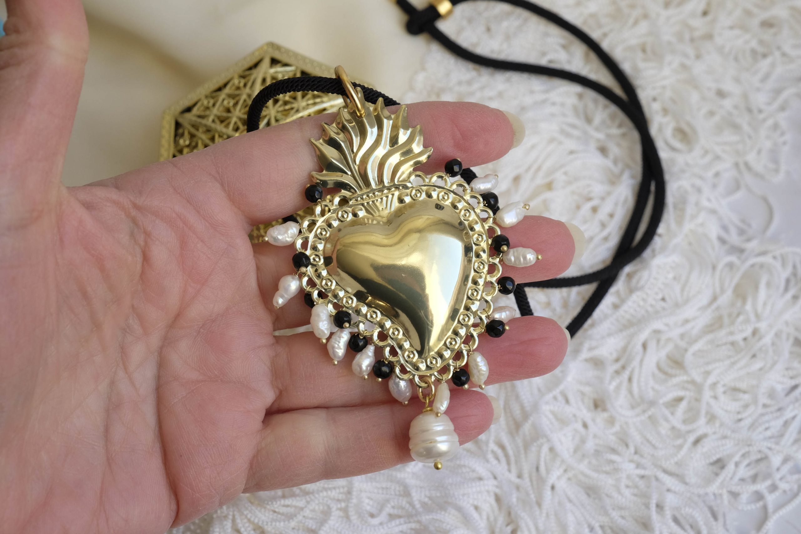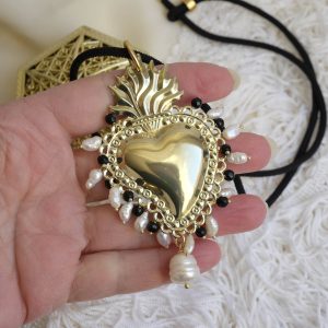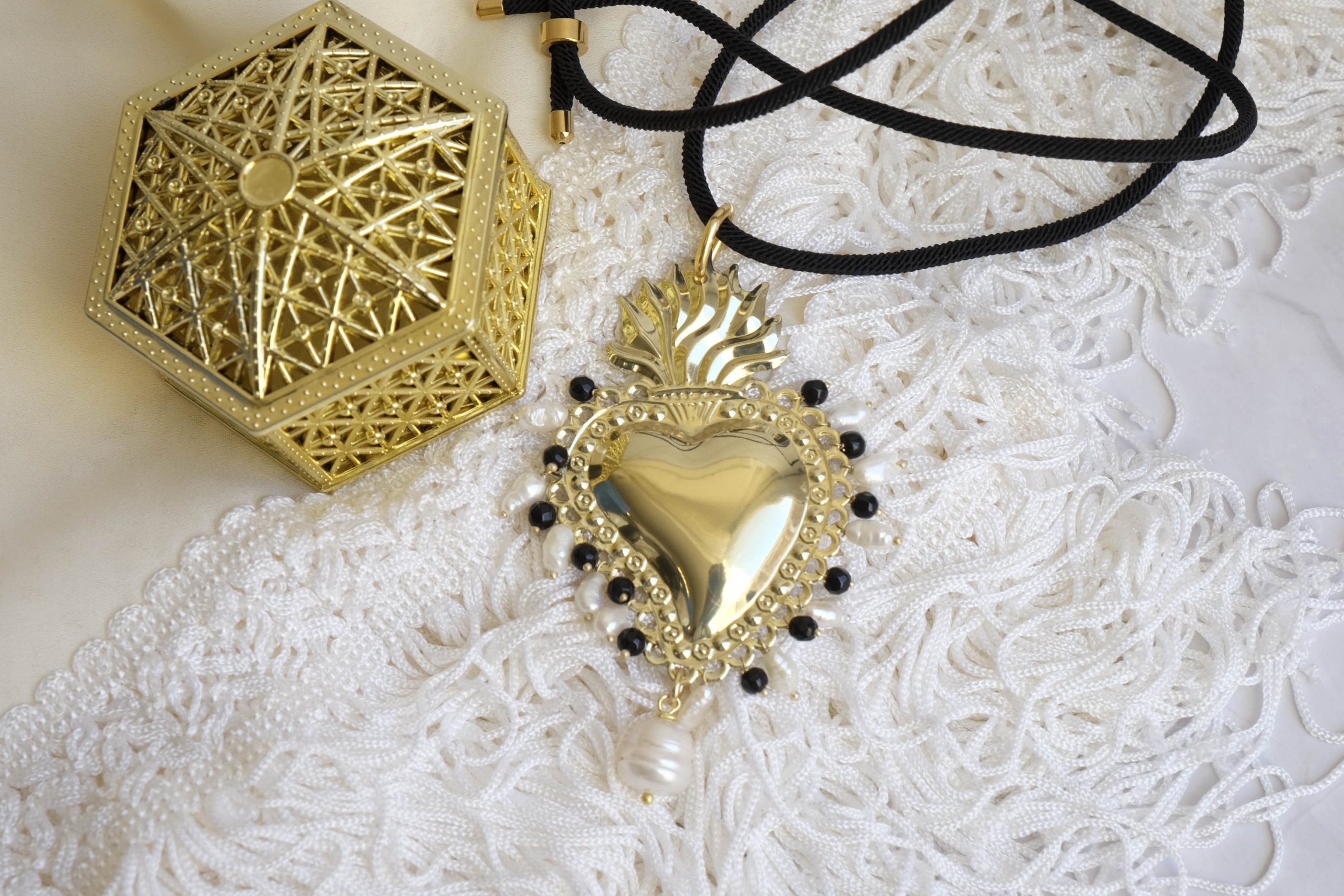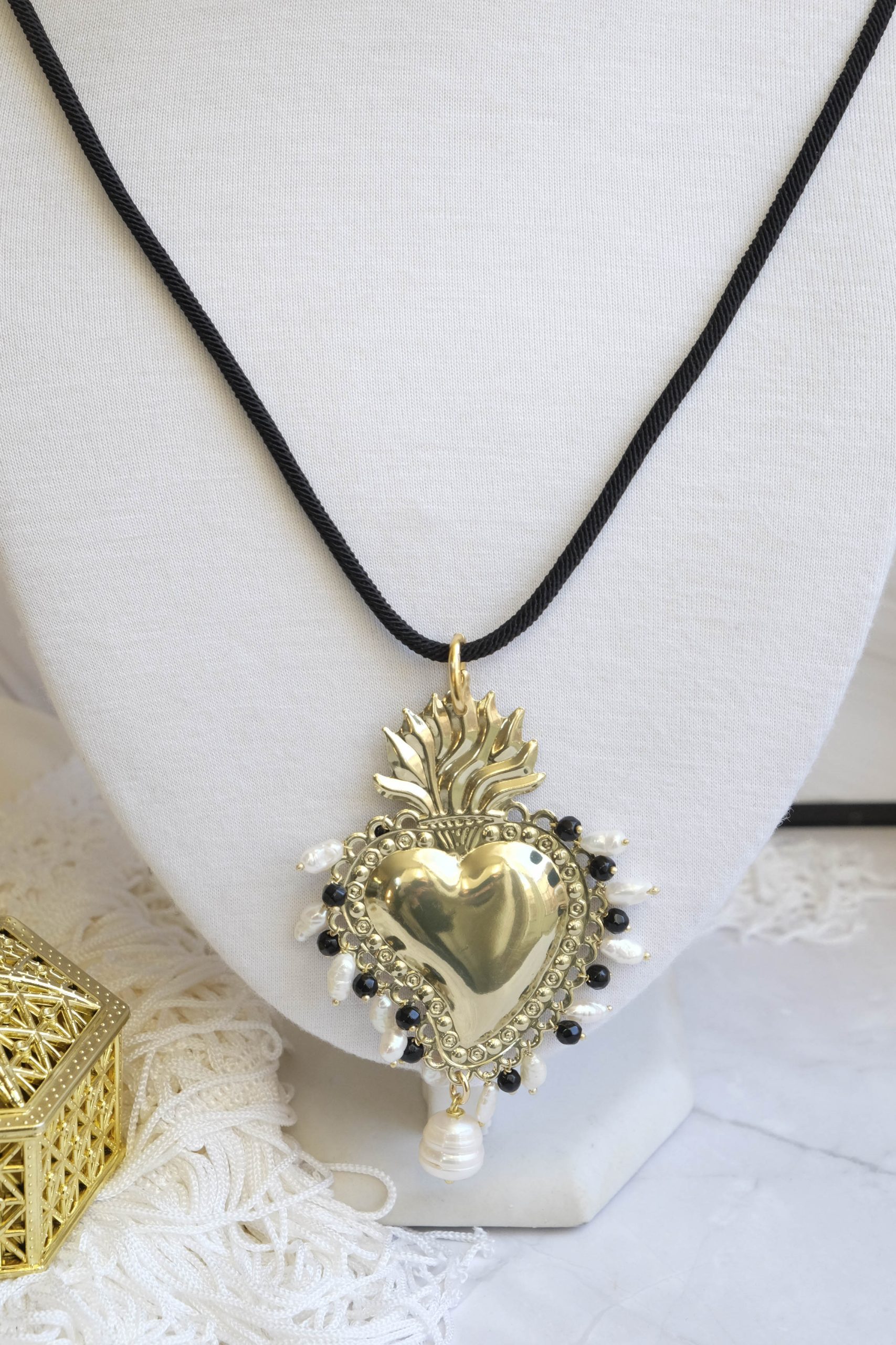Sacred Heart Necklace Ex Voto Natural Pearls Onyx