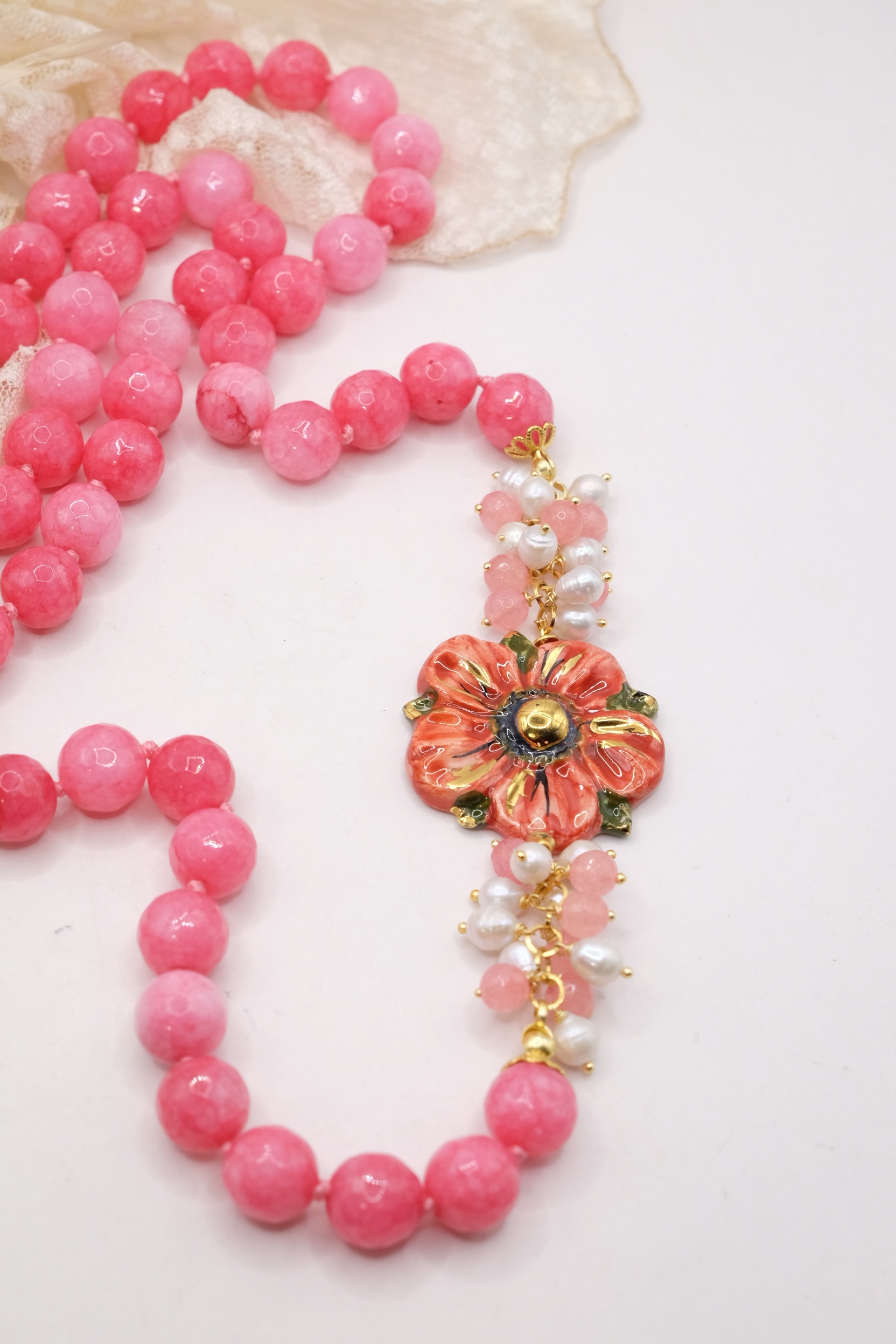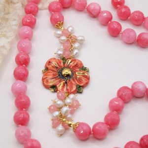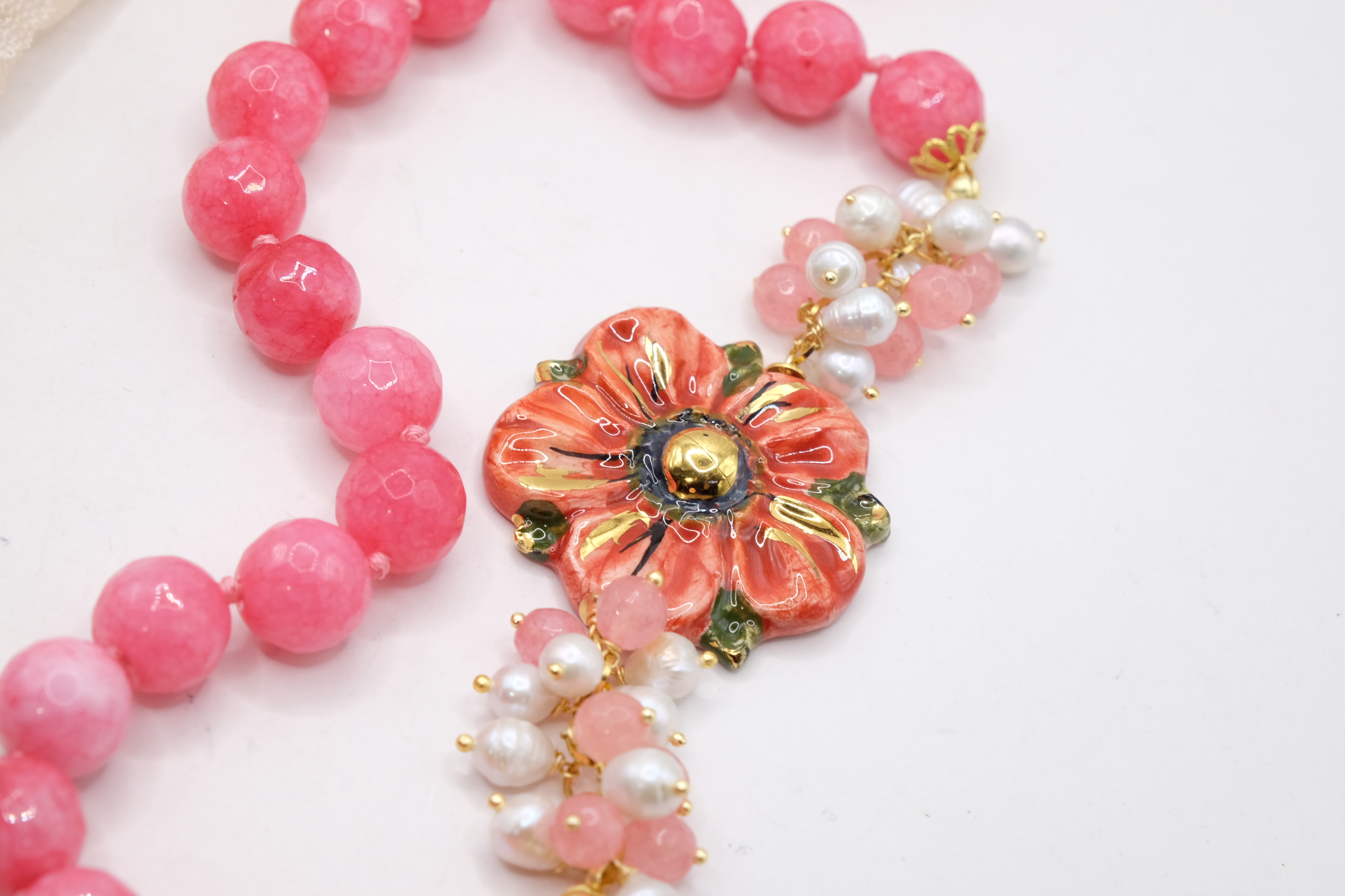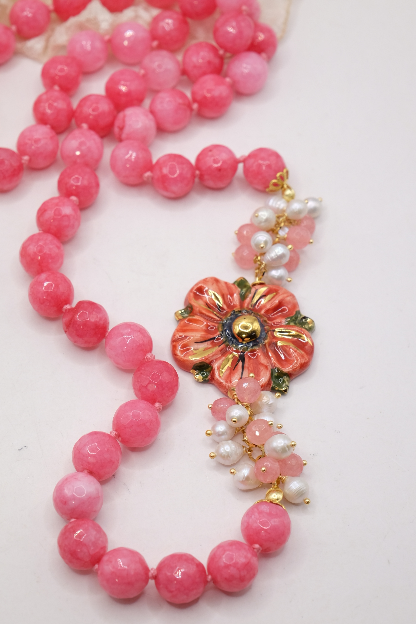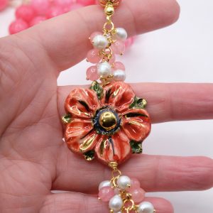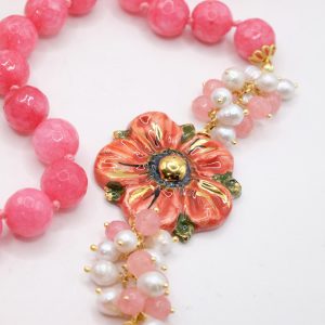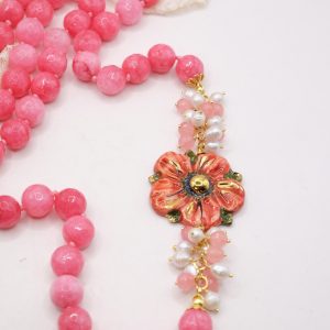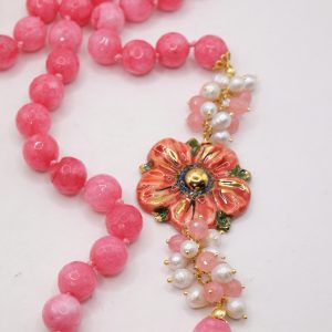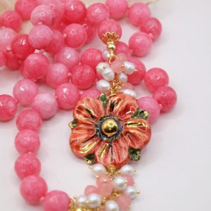 Collana in giada rosa sfaccettata luminosa da 12mm e bellissimo fiore in ceramica di Caltagirone da 3,8 cm realizzata e decorato a mano con oro zecchino, e arricchito da grappoli di perle naturali.