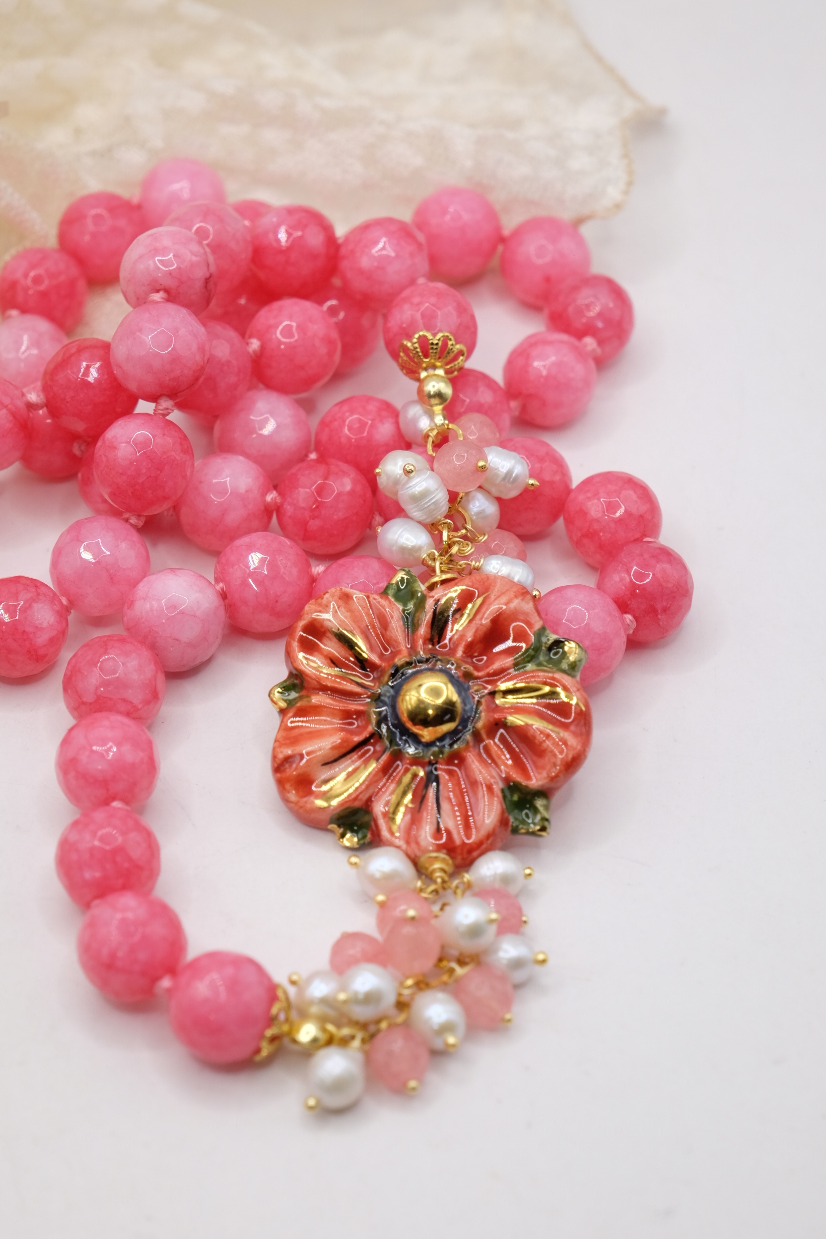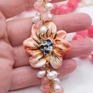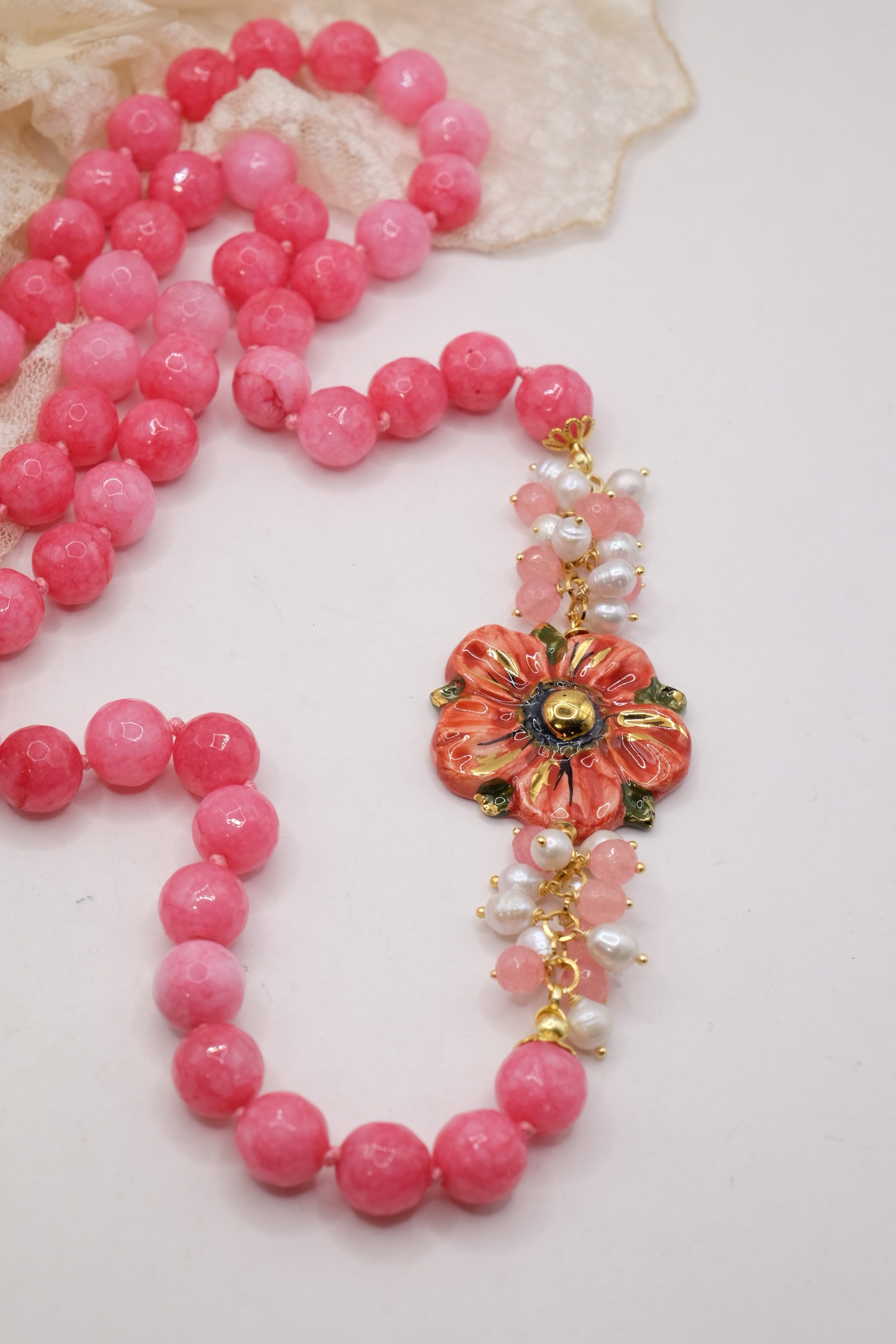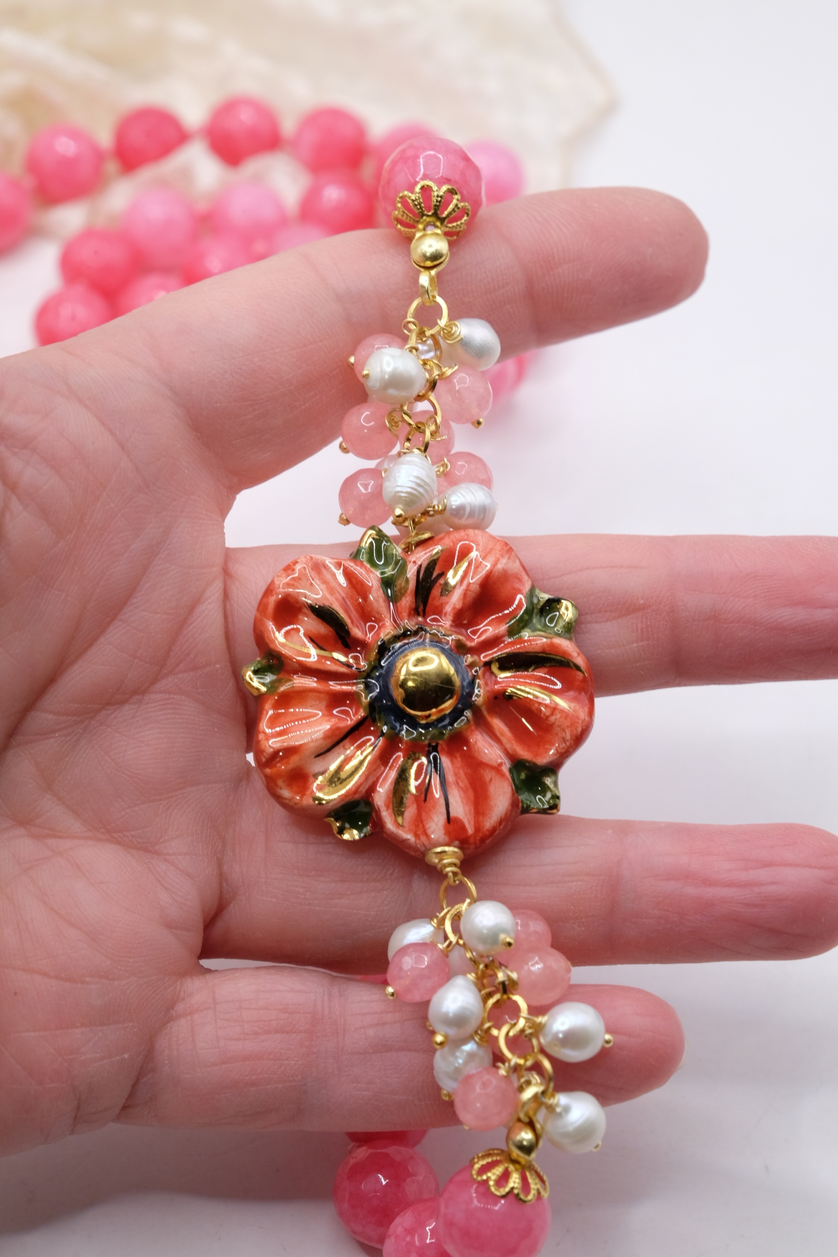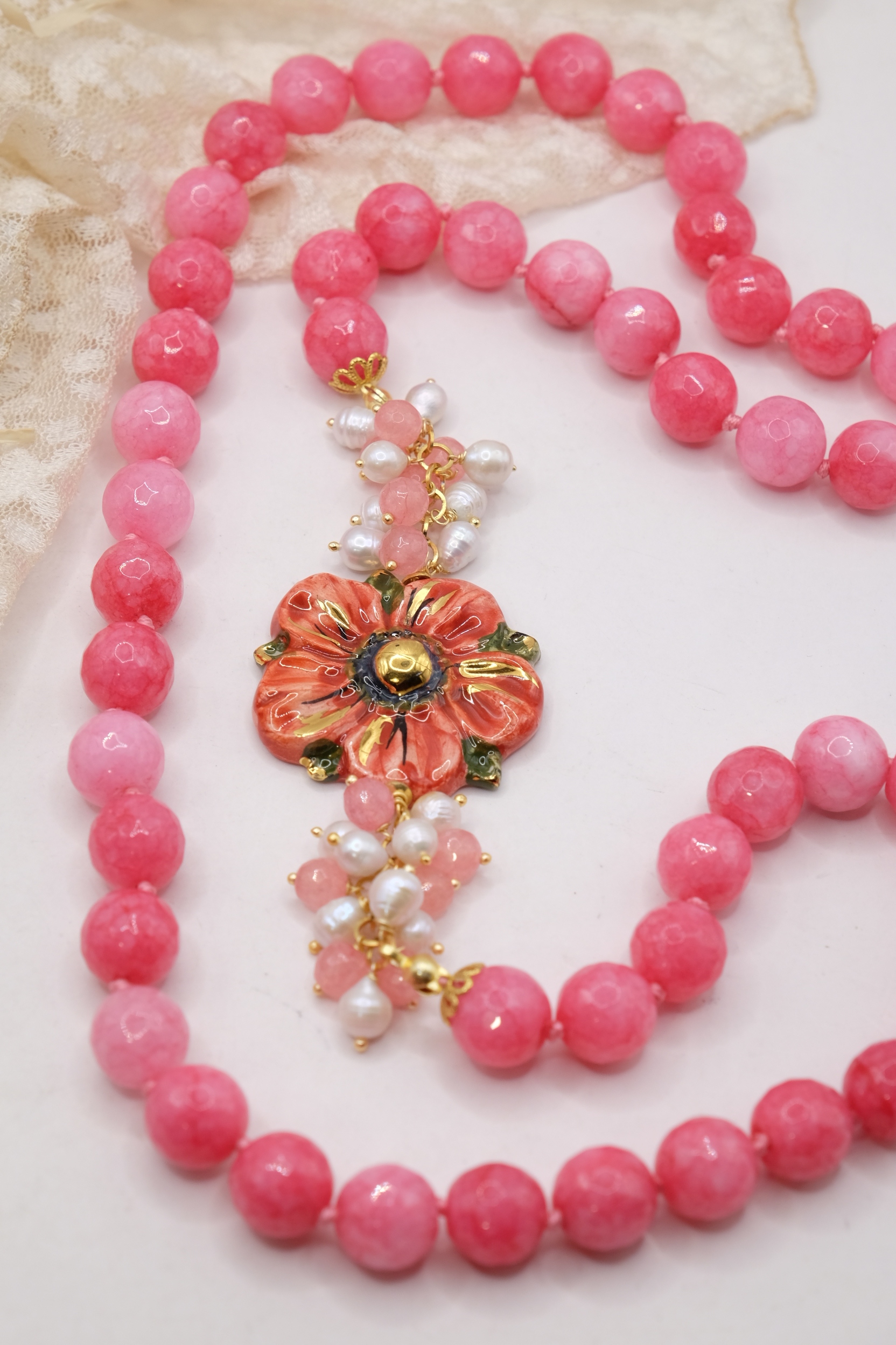 Collana in giada rosa sfaccettata luminosa da 12mm e bellissimo fiore in ceramica di Caltagirone da 3,8 cm realizzata e decorato a mano con oro zecchino, e arricchito da grappoli di perle naturali.