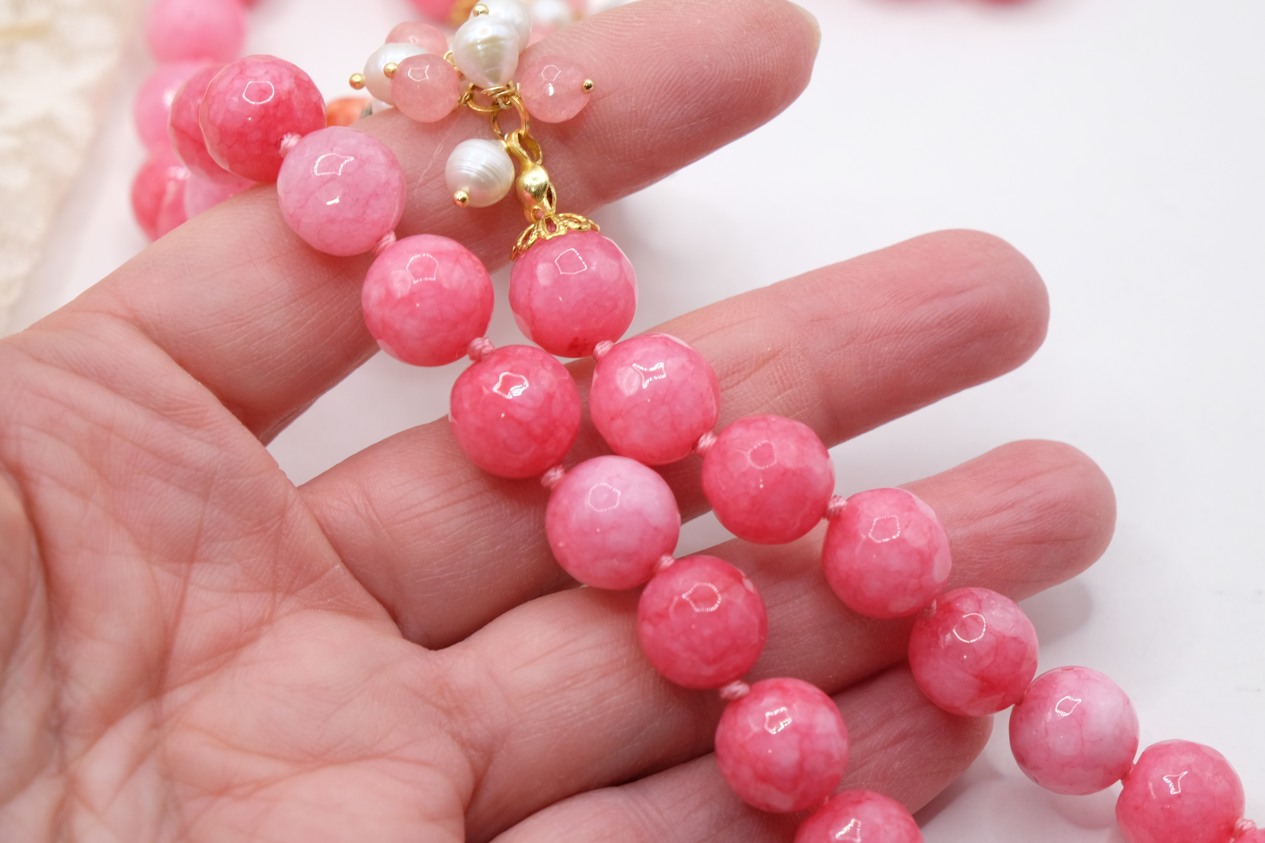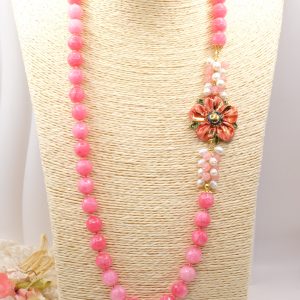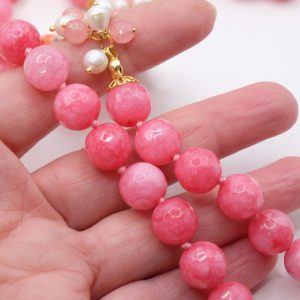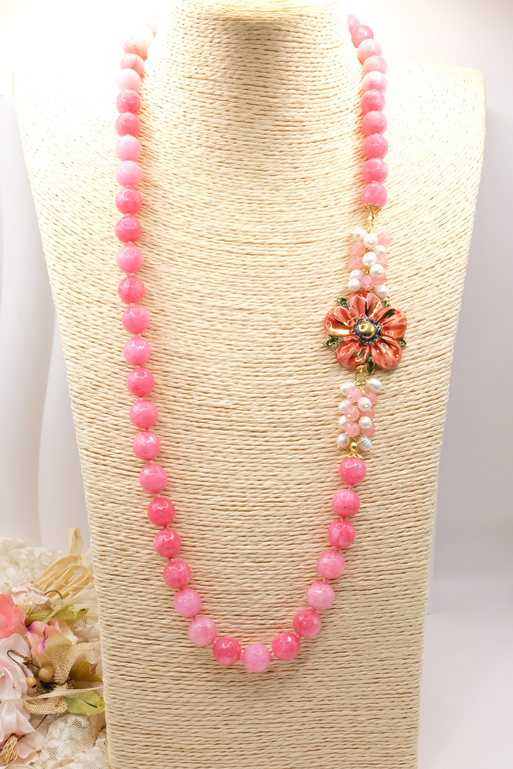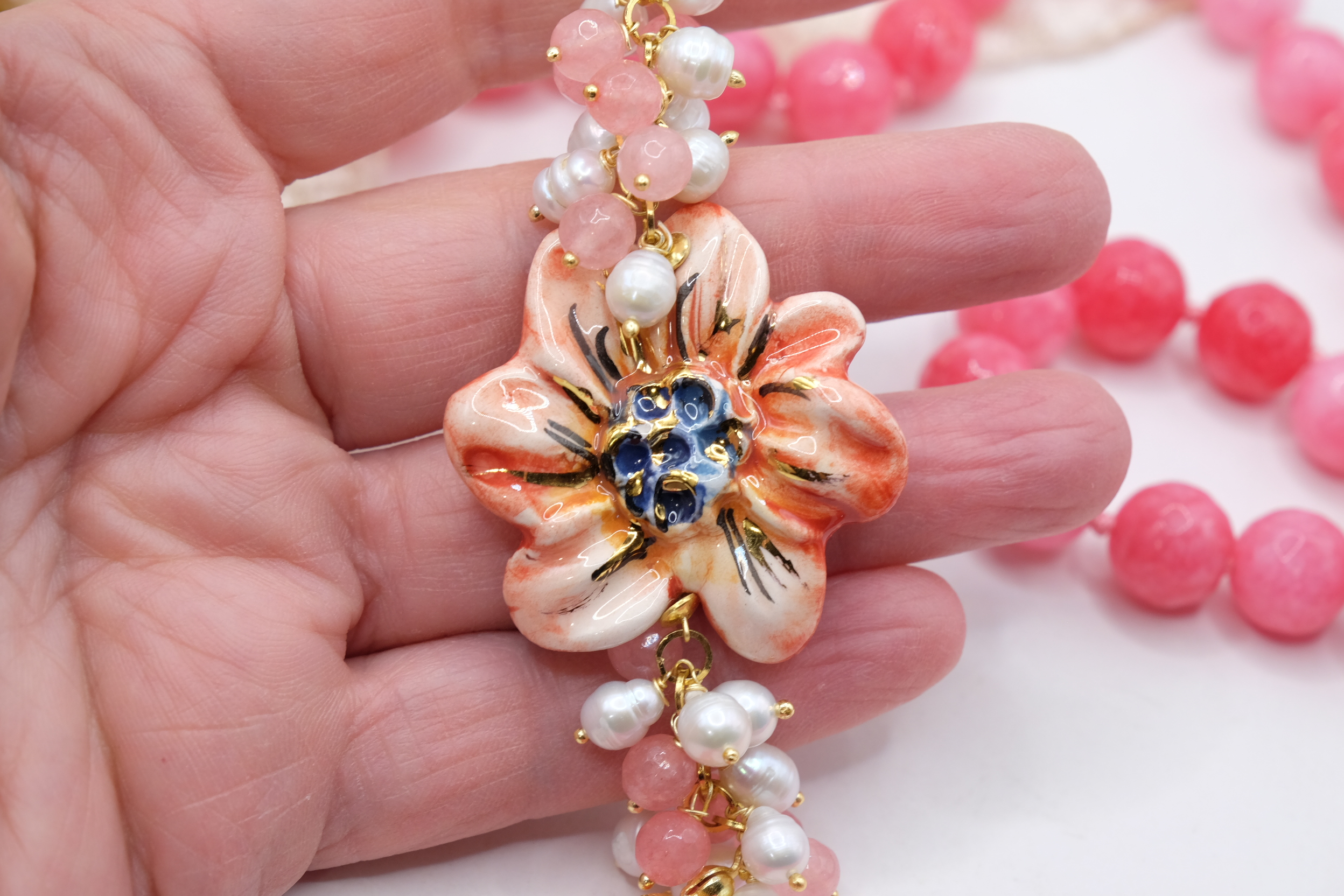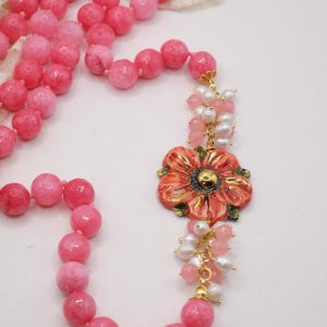 Collana in giada rosa sfaccettata luminosa da 12mm e bellissimo fiore in ceramica di Caltagirone da 3,8 cm realizzata e decorato a mano con oro zecchino, e arricchito da grappoli di perle naturali.