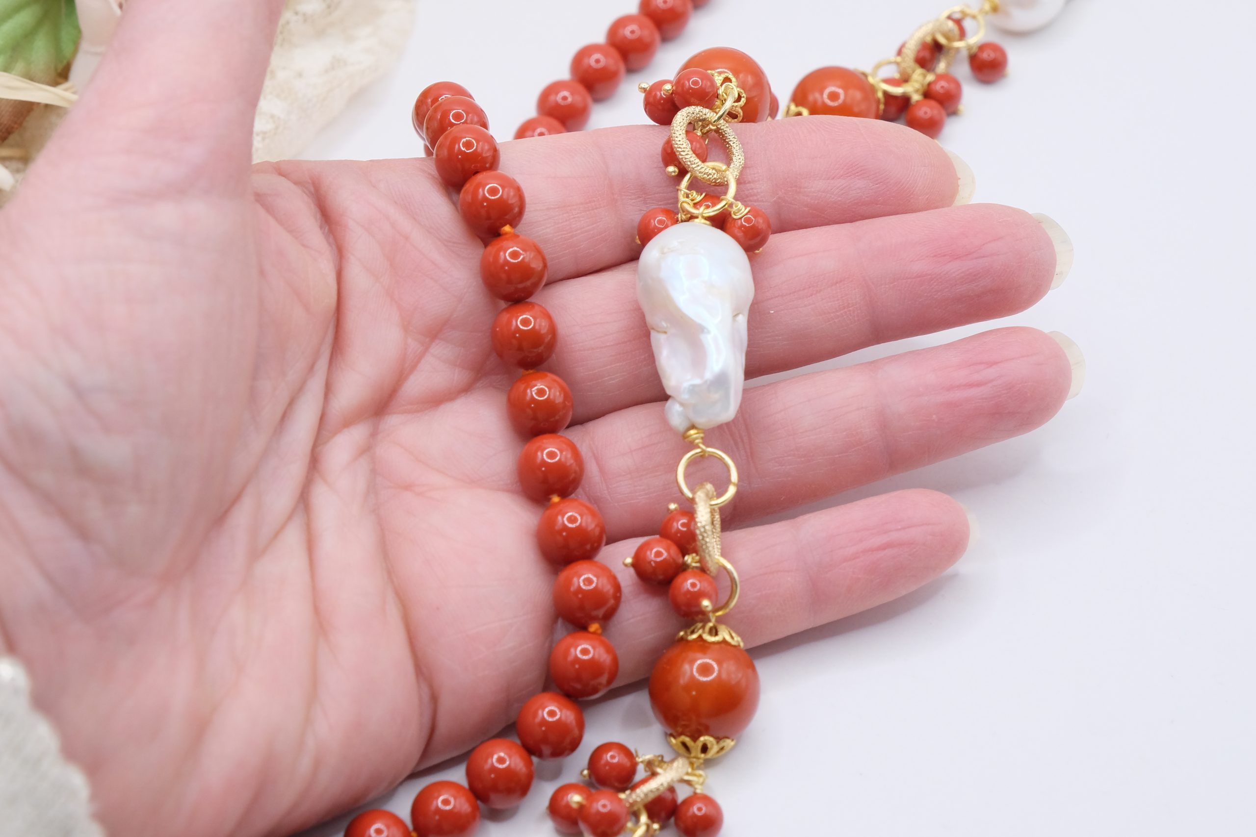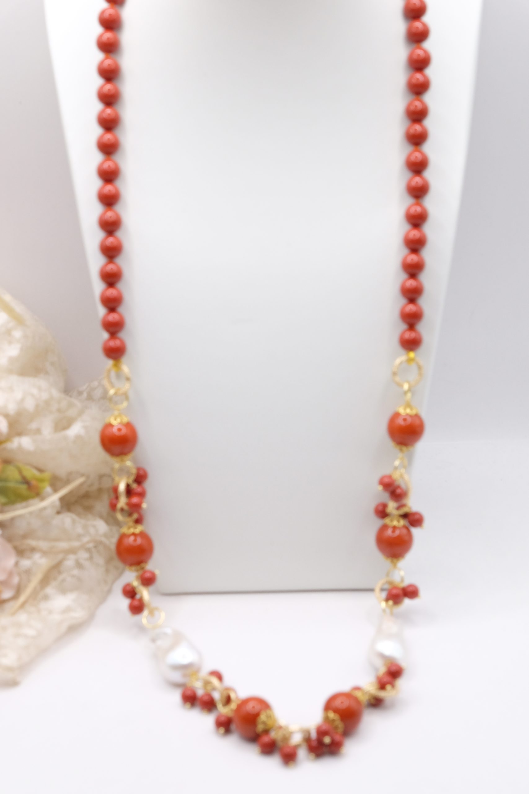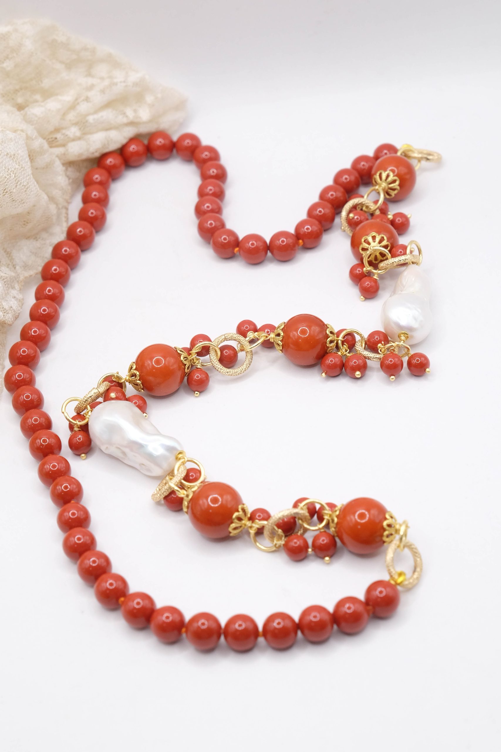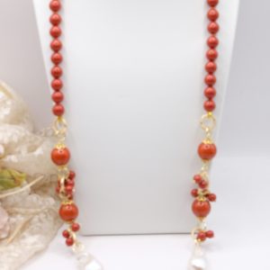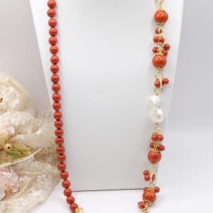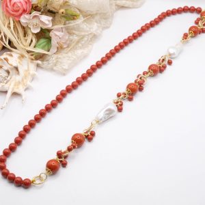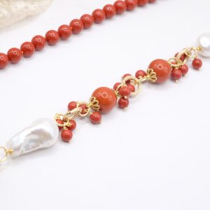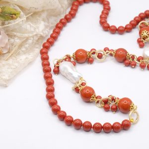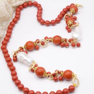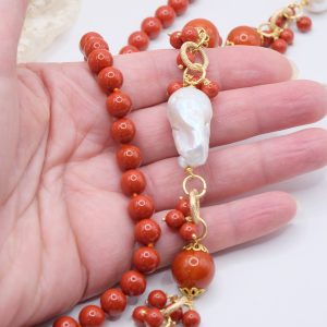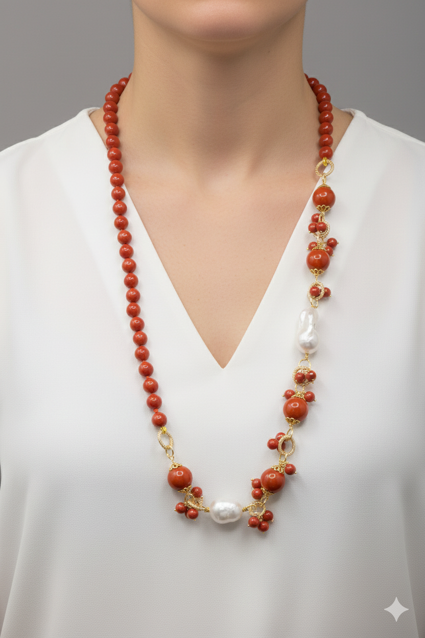 Crafted from coral paste in 7, 10, and 15mm diameters, this necklace is embellished with elegant side clusters featuring two large natural baroque pearls 🤍.