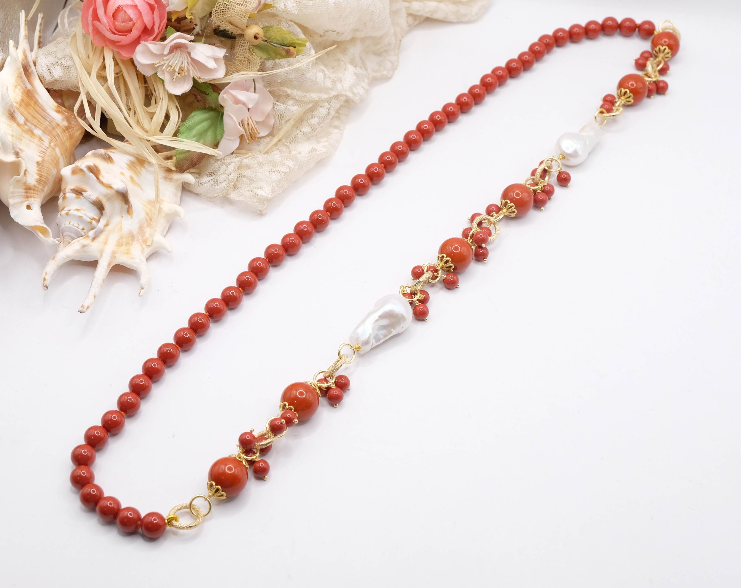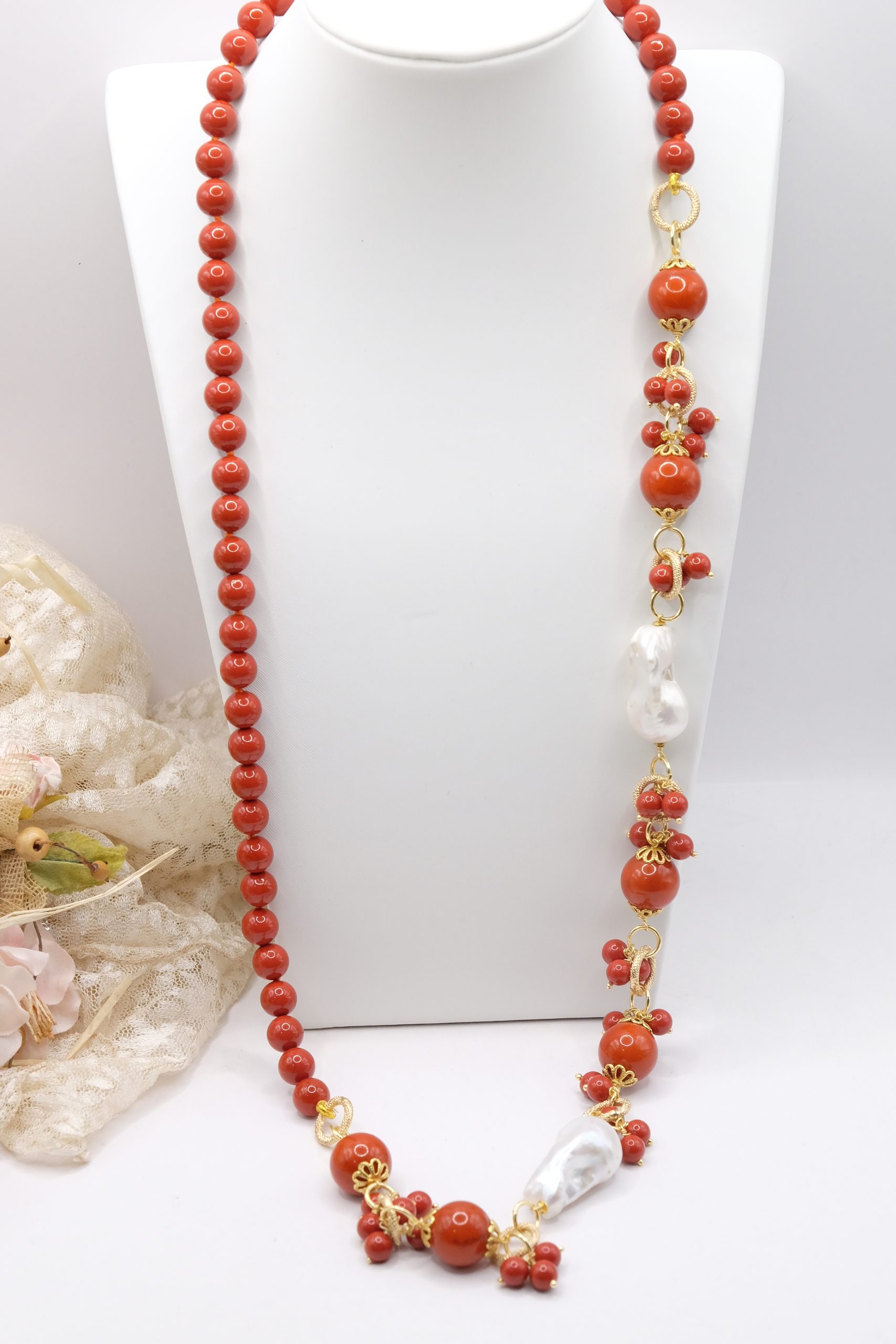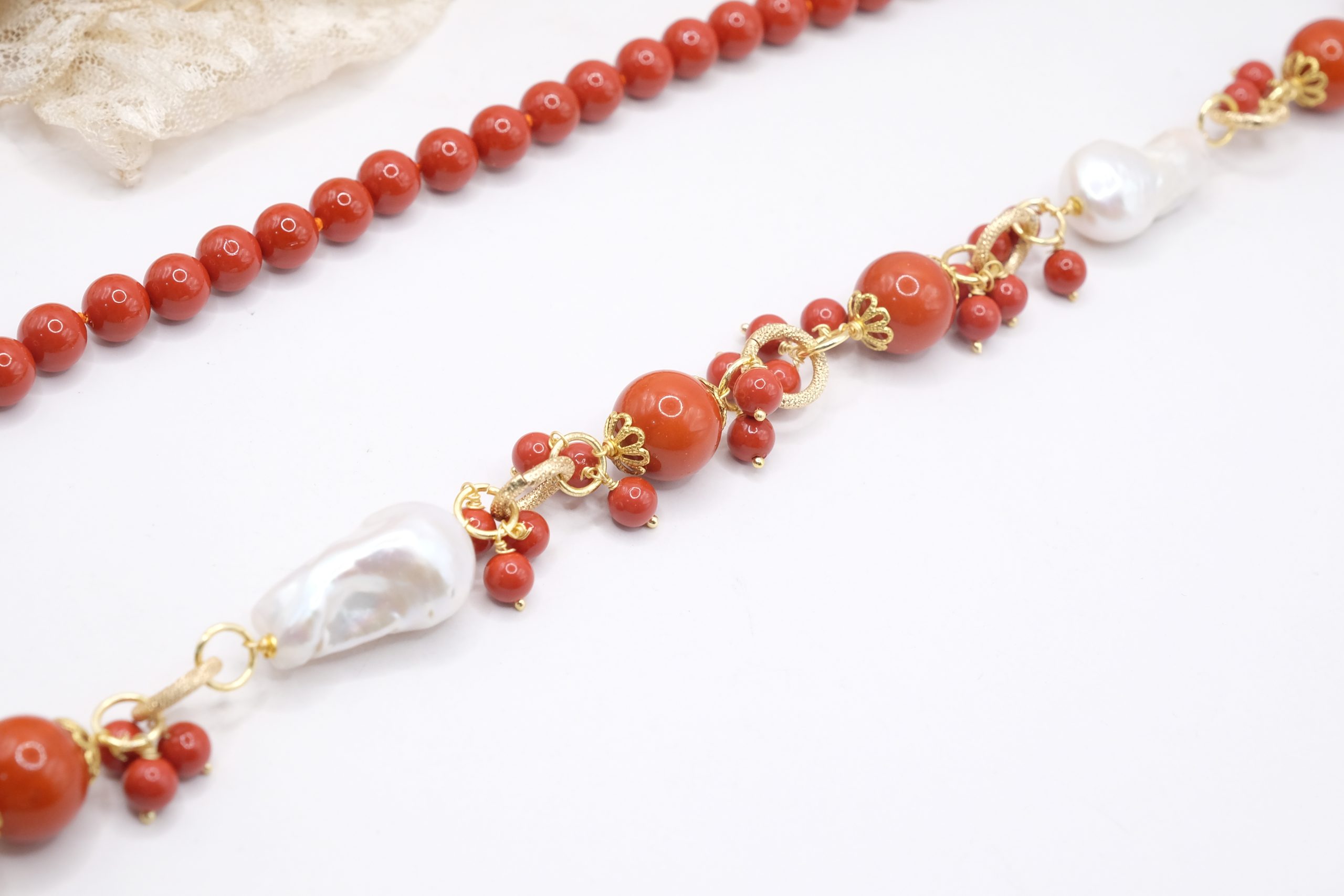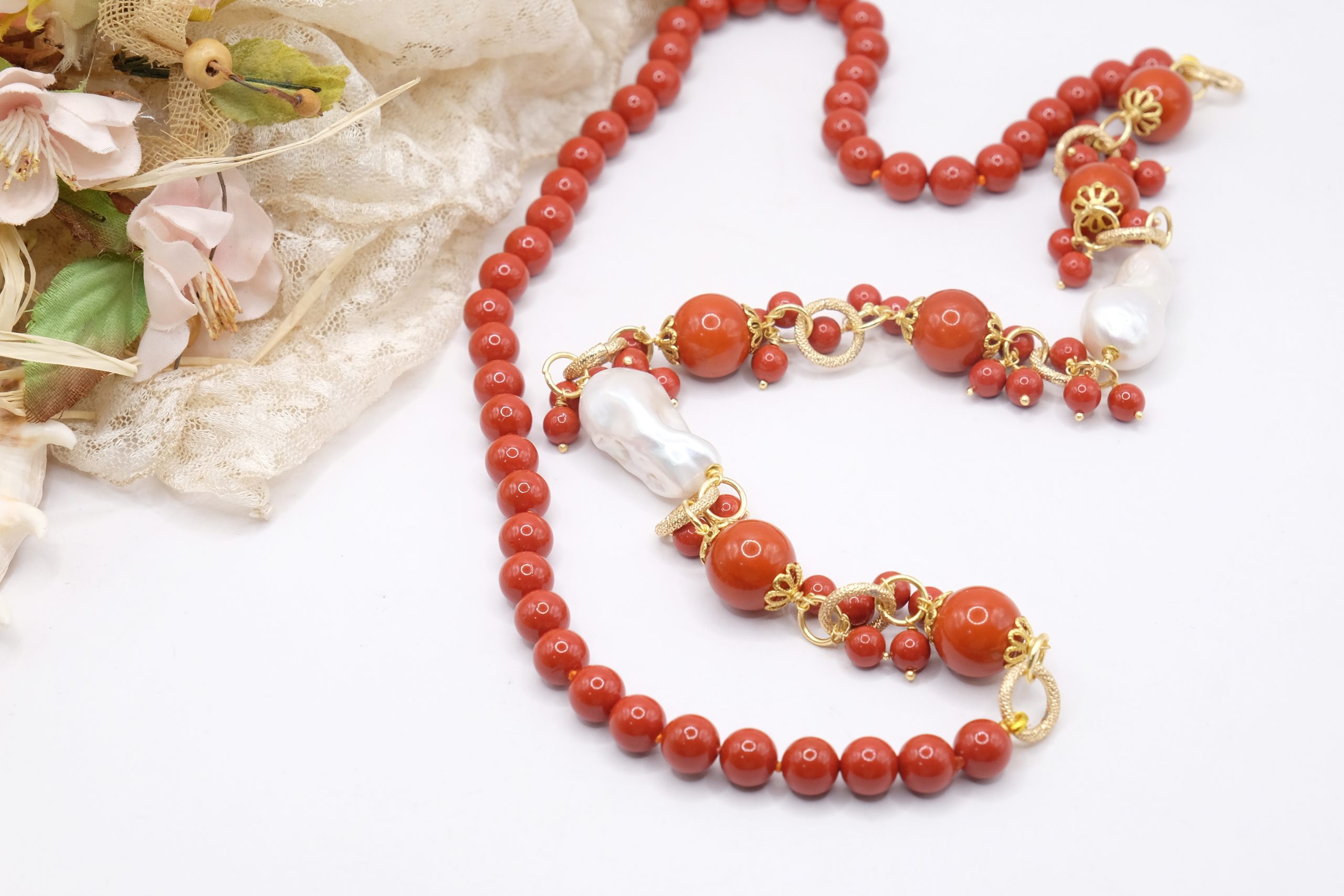 Crafted from coral paste in 7, 10, and 15mm diameters, this necklace is embellished with elegant side clusters featuring two large natural baroque pearls 🤍.