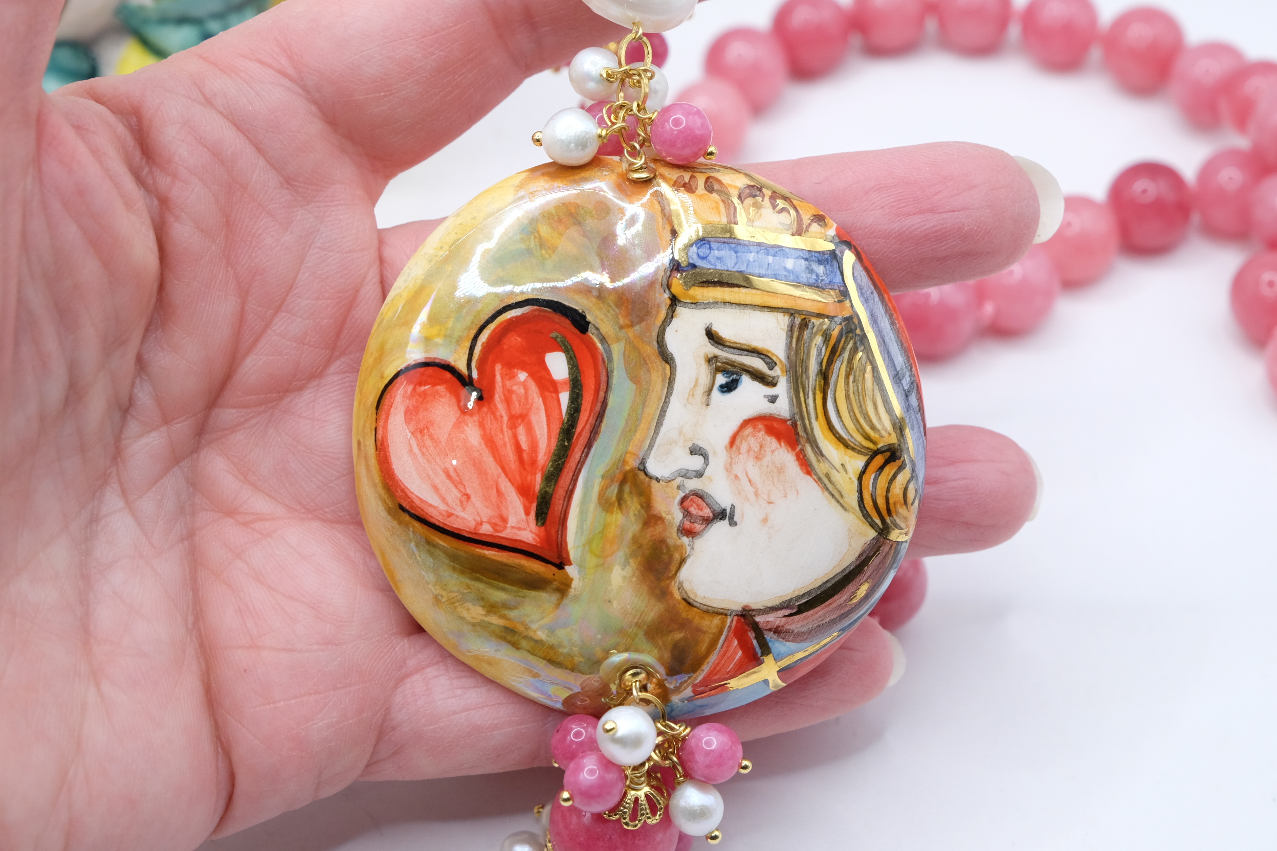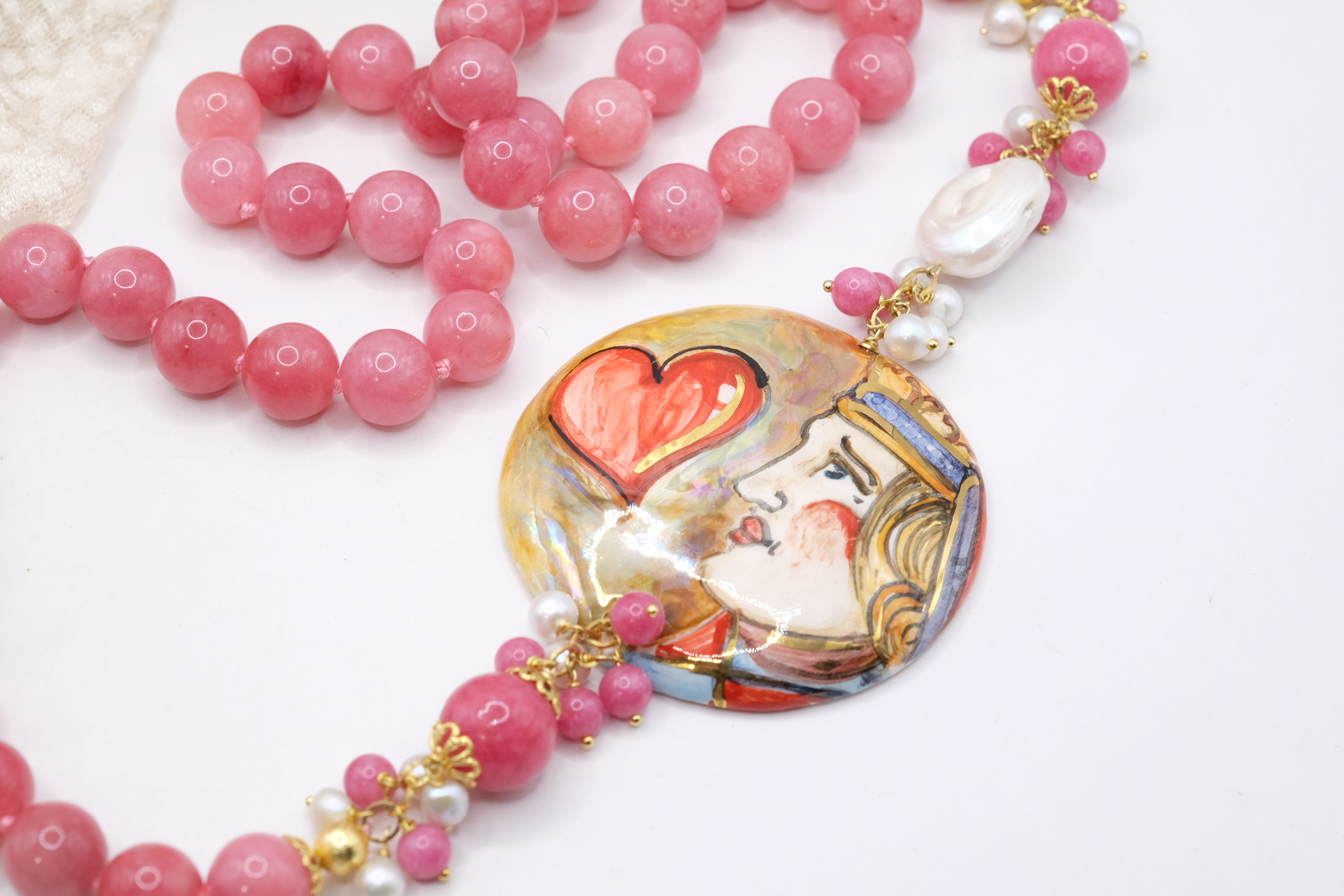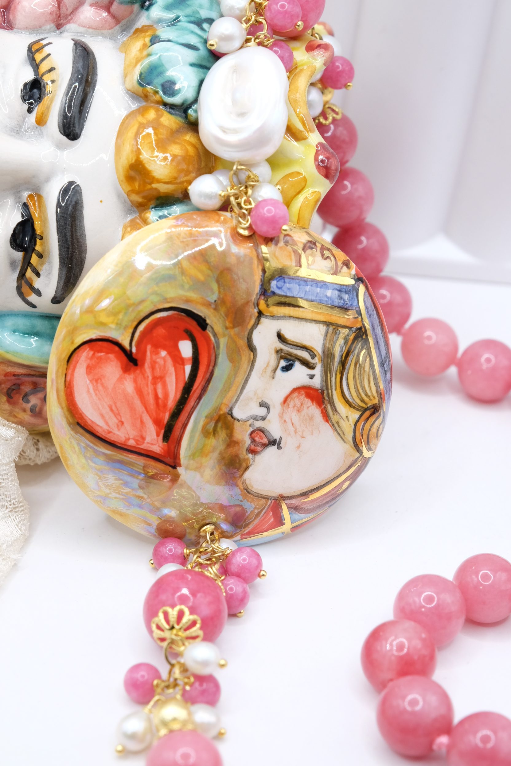 Beautiful 13mm pink jade necklace, a round tile made of 6.2cm Caltagirone ceramic, handcrafted and decorated with pure gold, and enriched with a jade cluster and natural pearls.