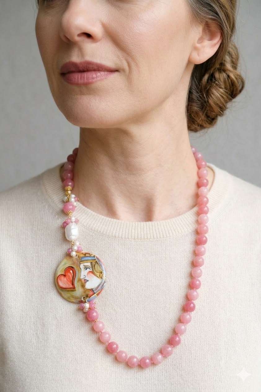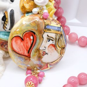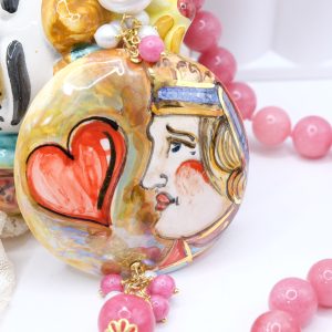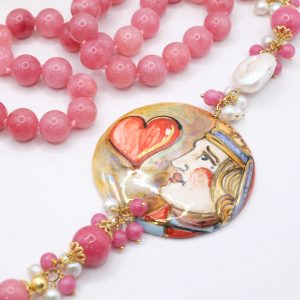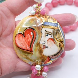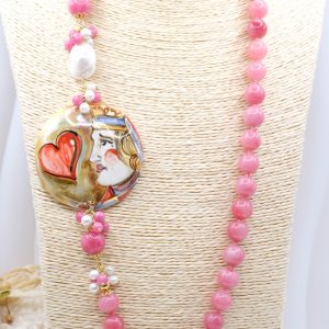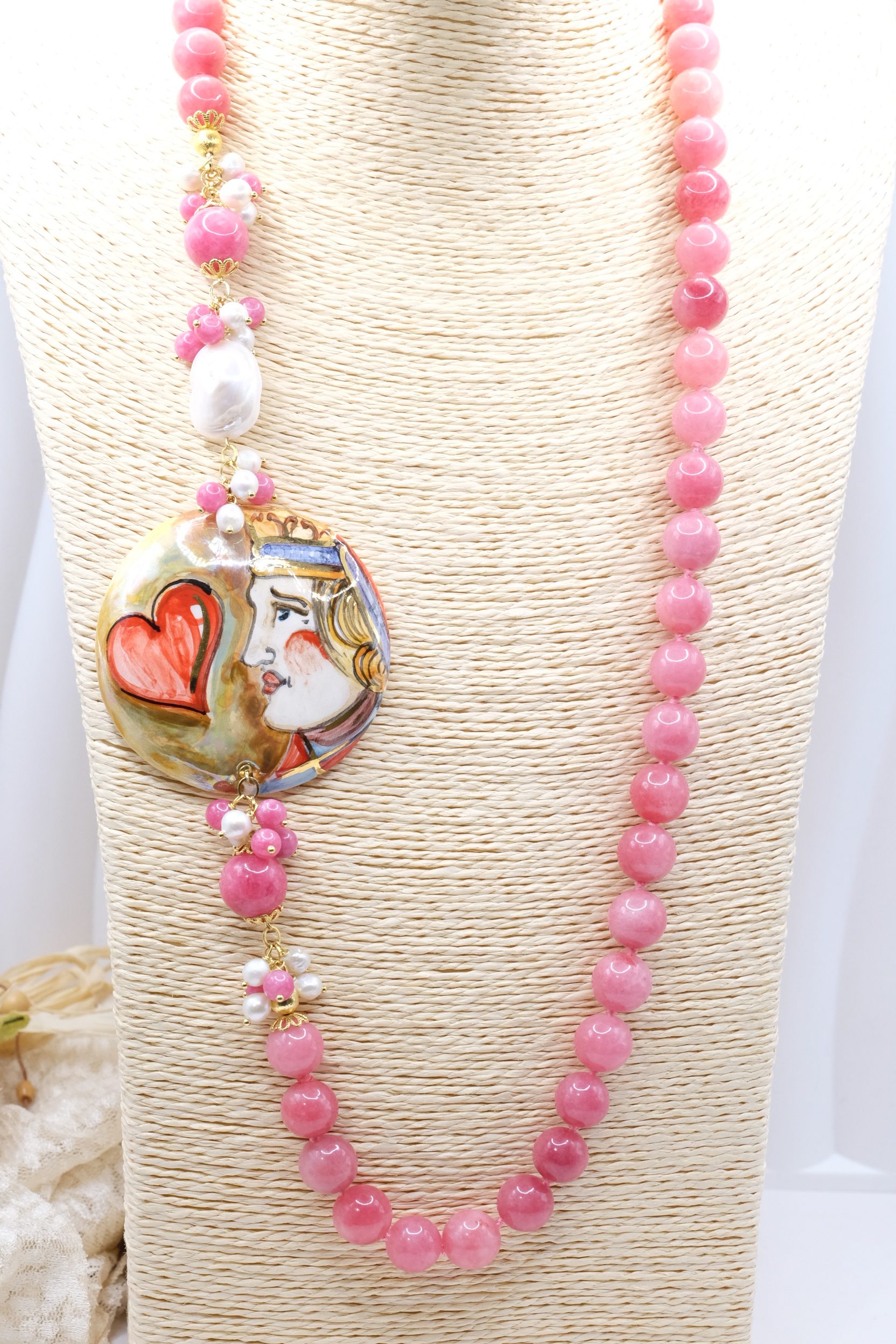 Beautiful 13mm pink jade necklace, a round tile made of 6.2cm Caltagirone ceramic, handcrafted and decorated with pure gold, and enriched with a jade cluster and natural pearls.