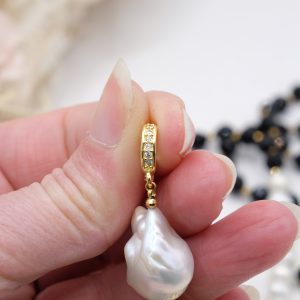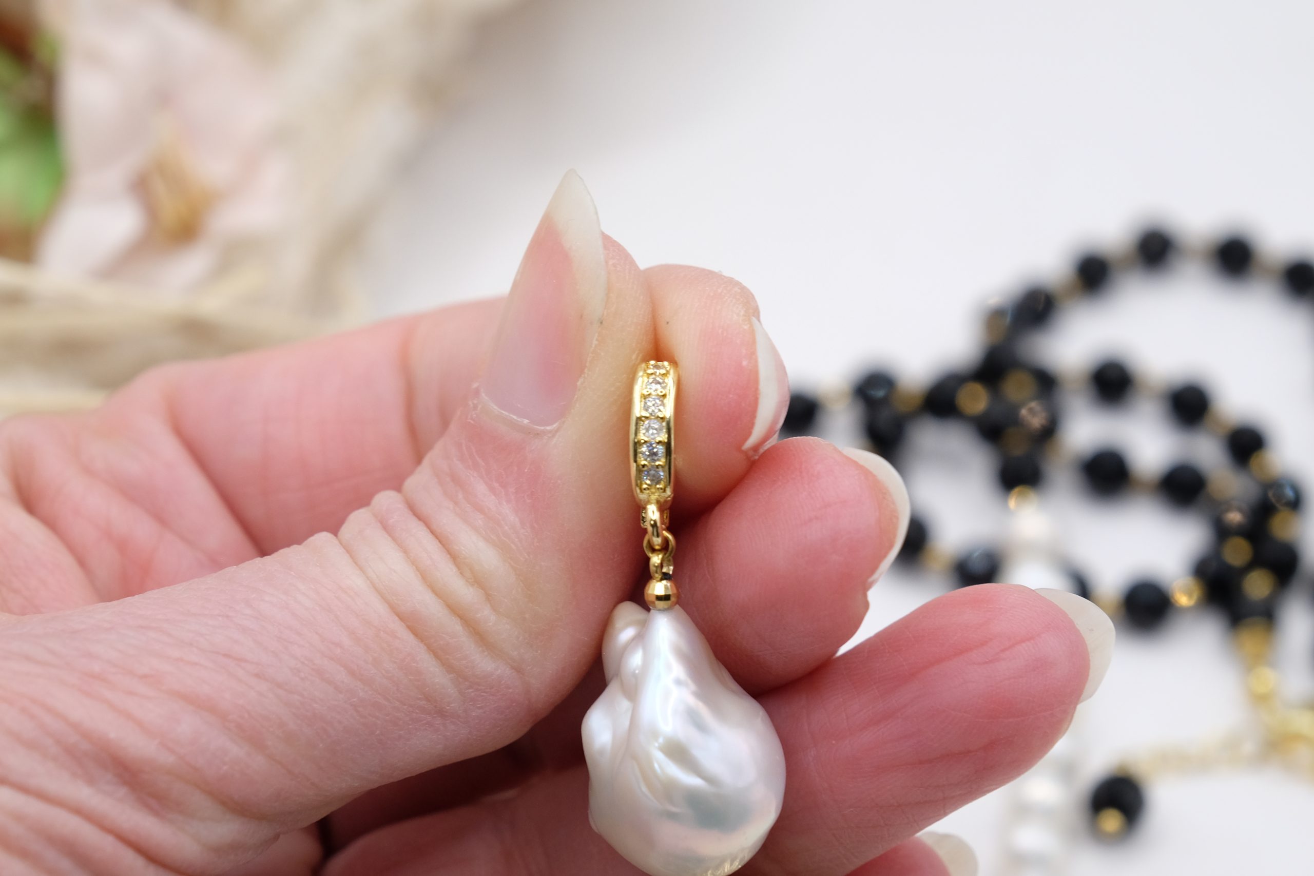 Il pendente staccabile a motivo di nappa, monta una grande perla naturale e fili di zirconi naturali neri finiti da microperle naturali