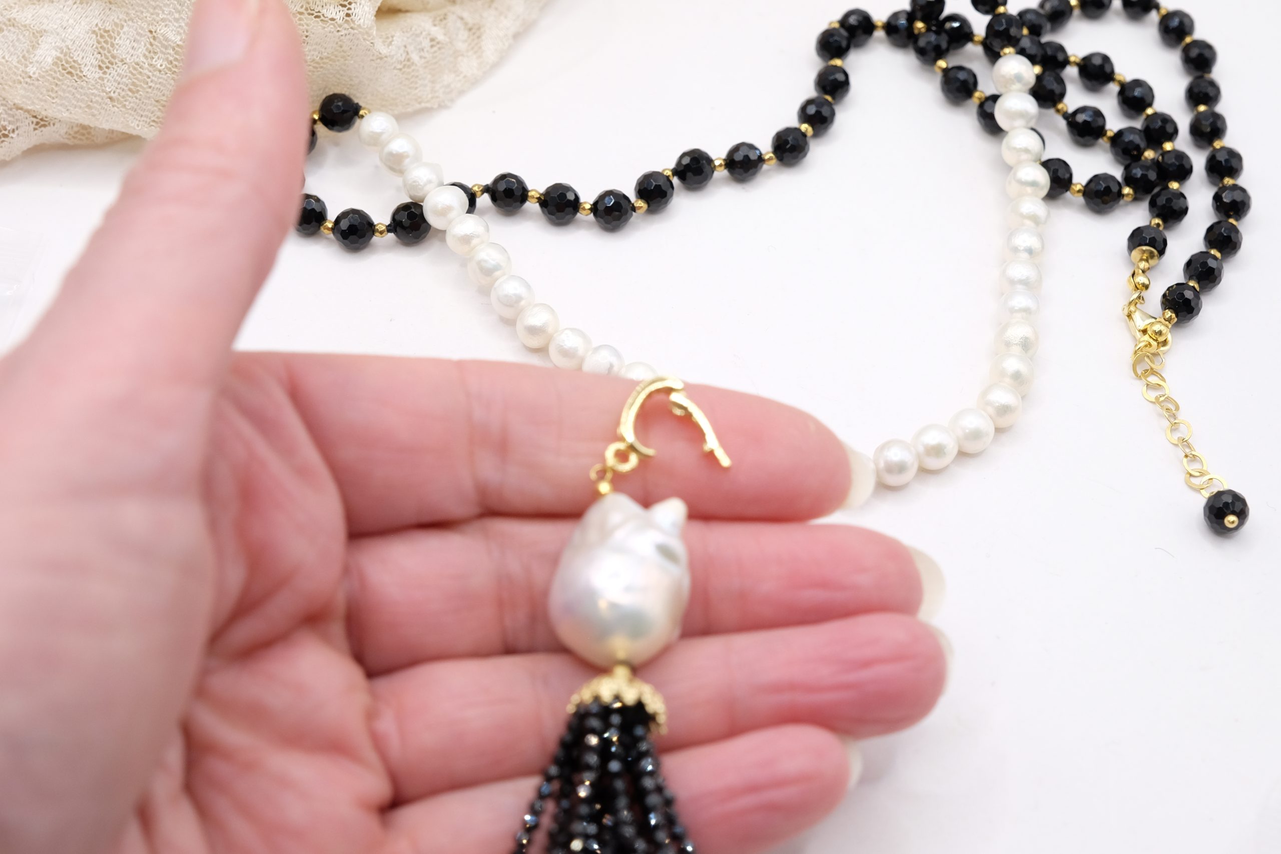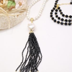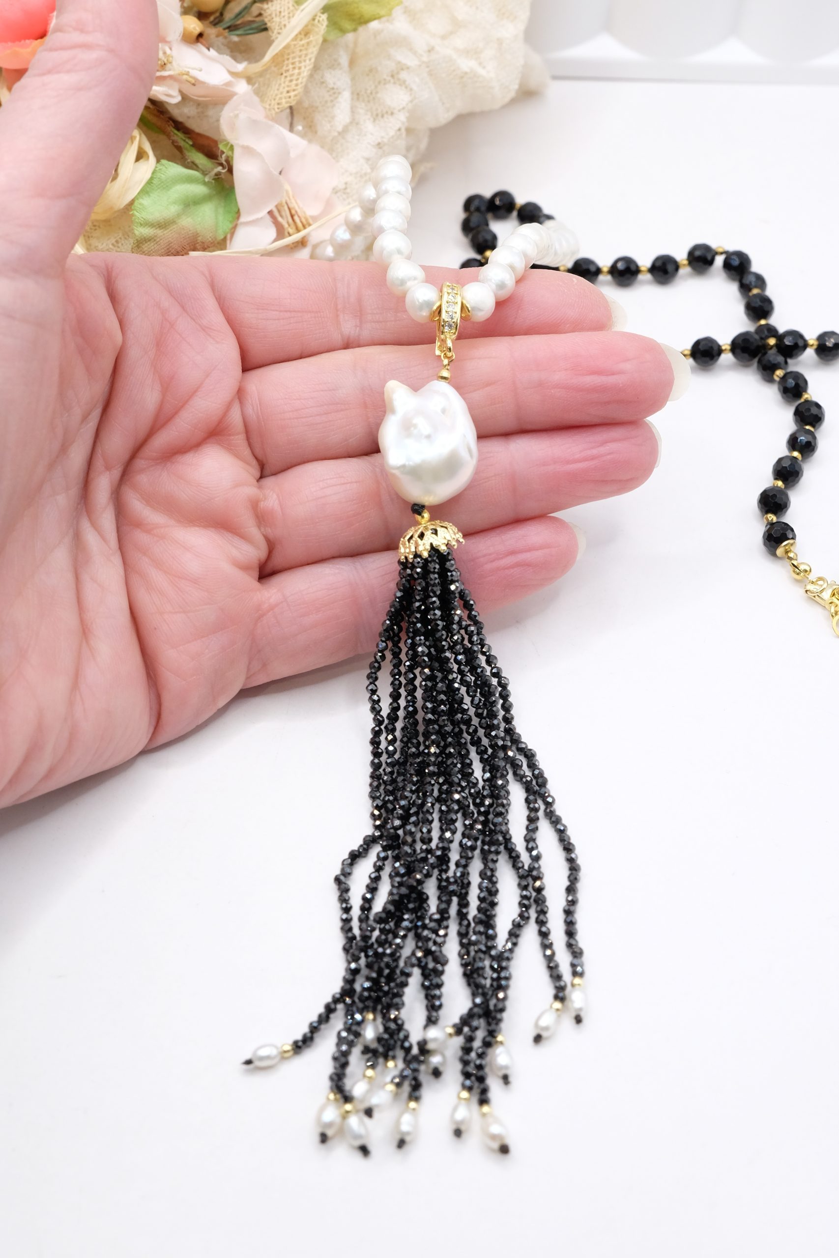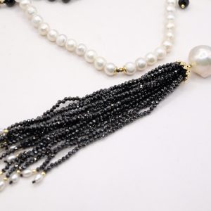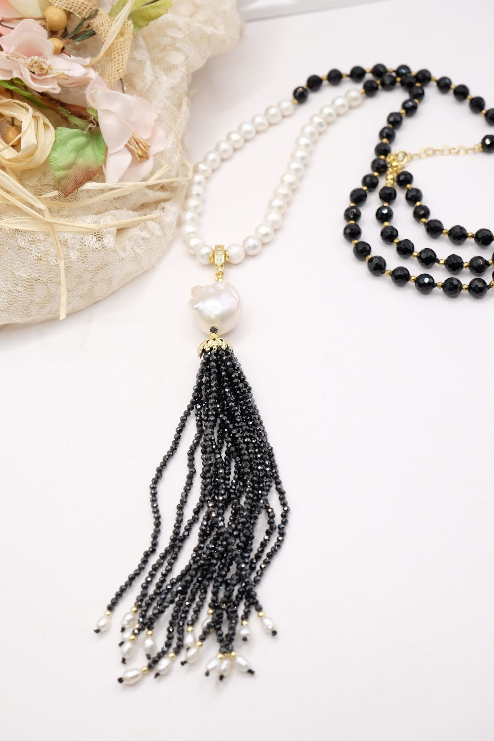Micropearl Onyx Zirconia Decoltè Necklace with 925 Silver Tassel Pendant