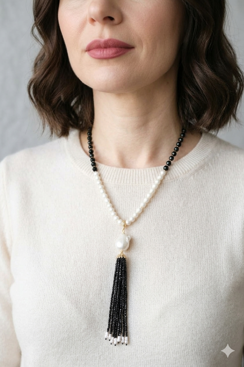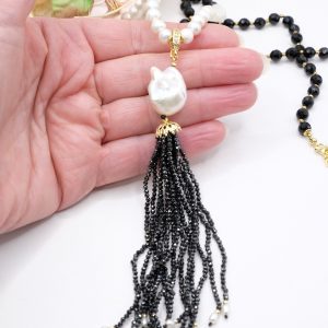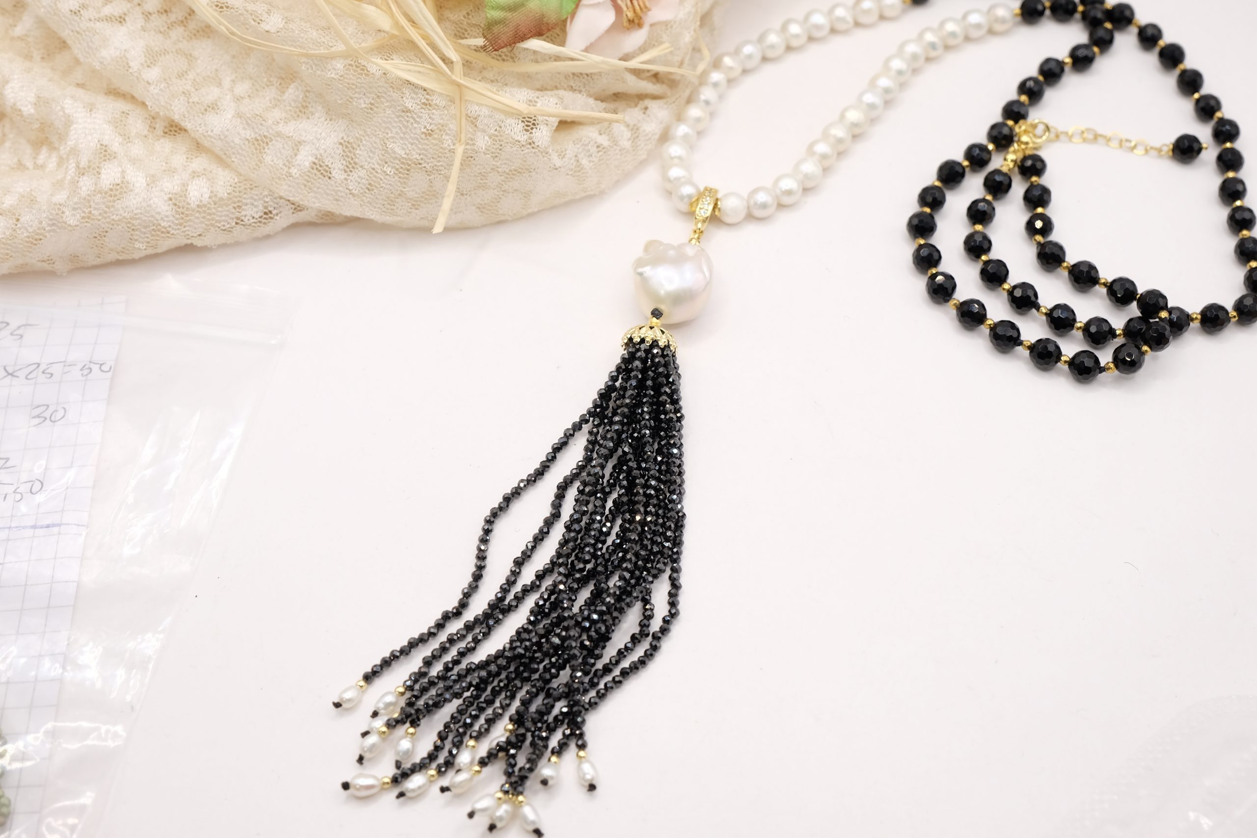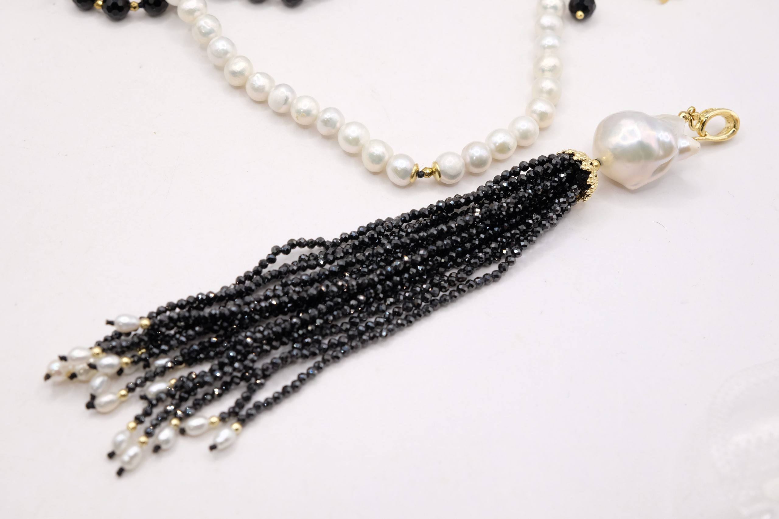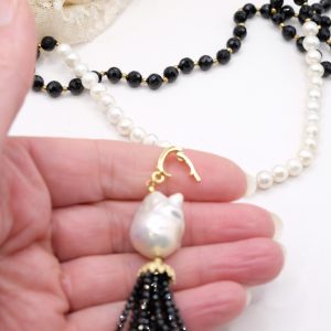 Micropearl Onyx Zirconia Decoltè Necklace with 925 Silver Tassel Pendant