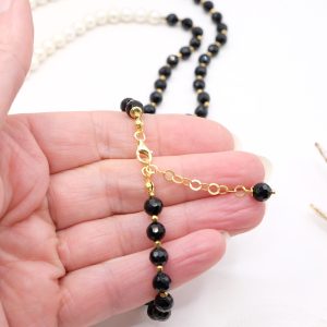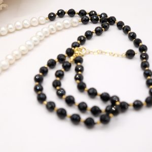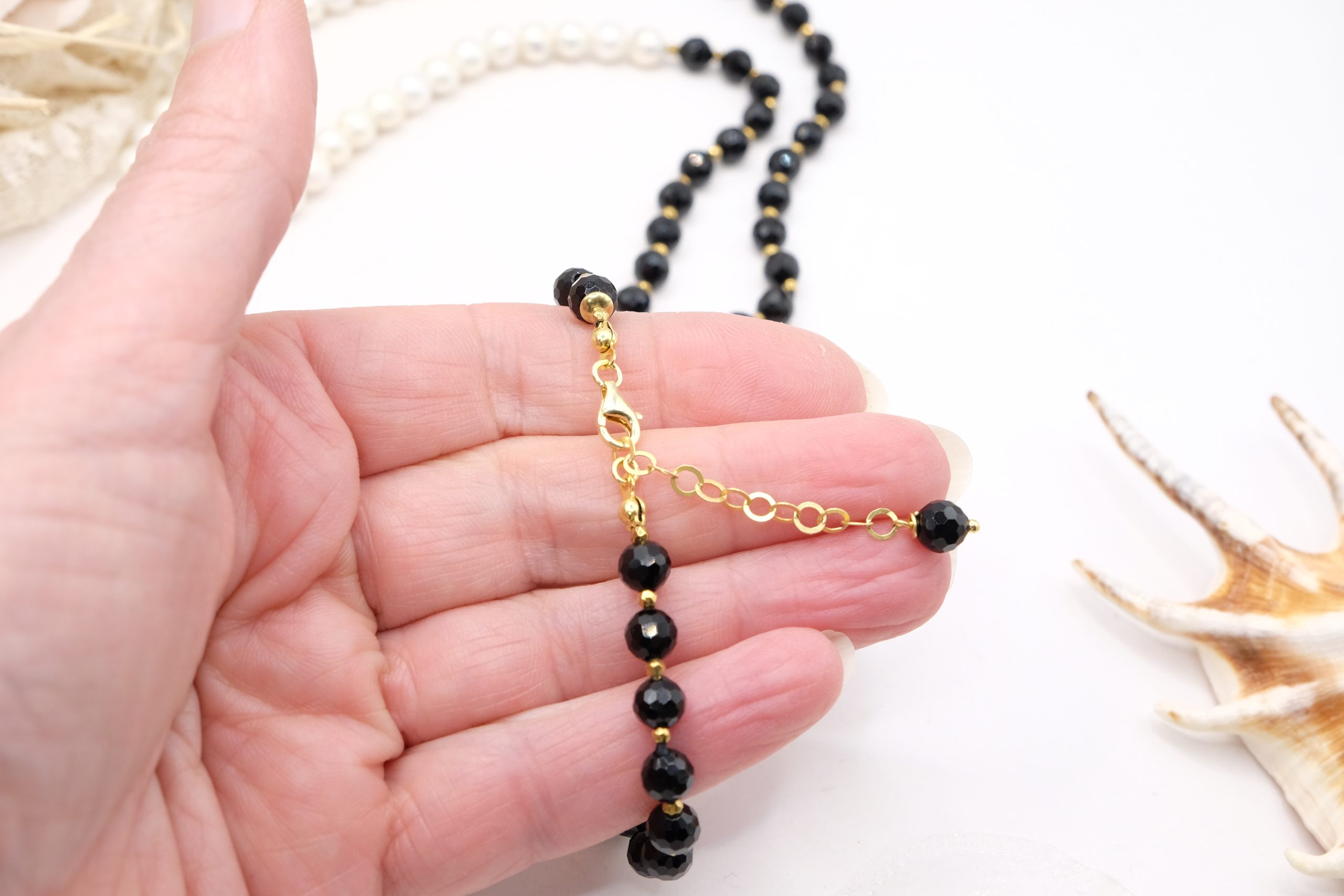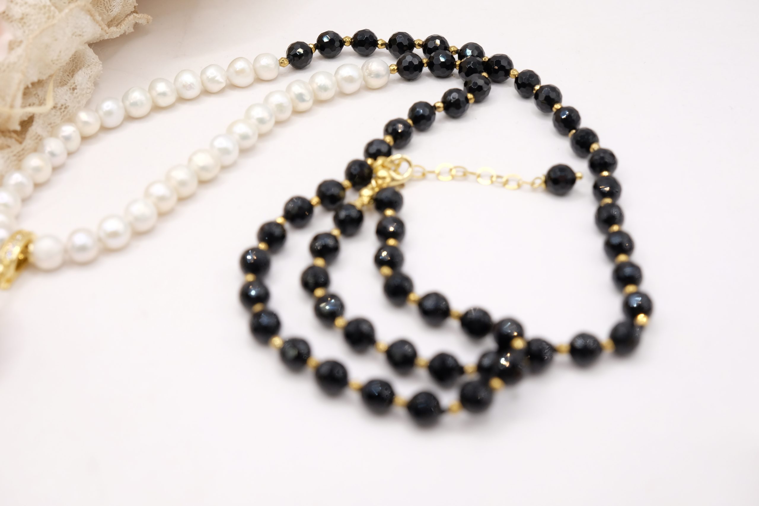 Aggiungi un tocco di eleganza e fascino al tuo look con questa collana decoltè, per metà in luminose naturali di alta qualità da 7 mm e per metà in onice sfaccettata