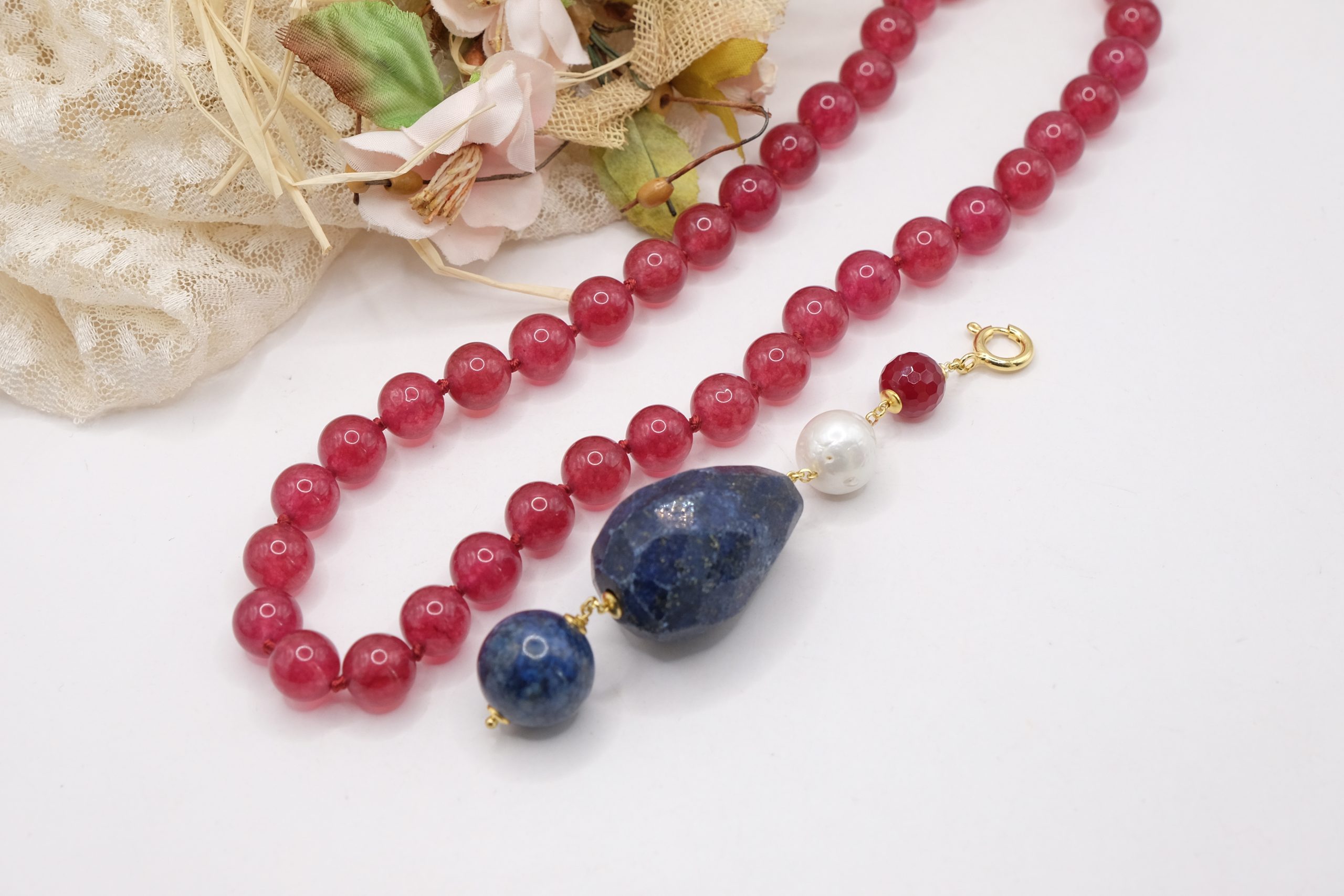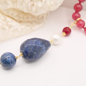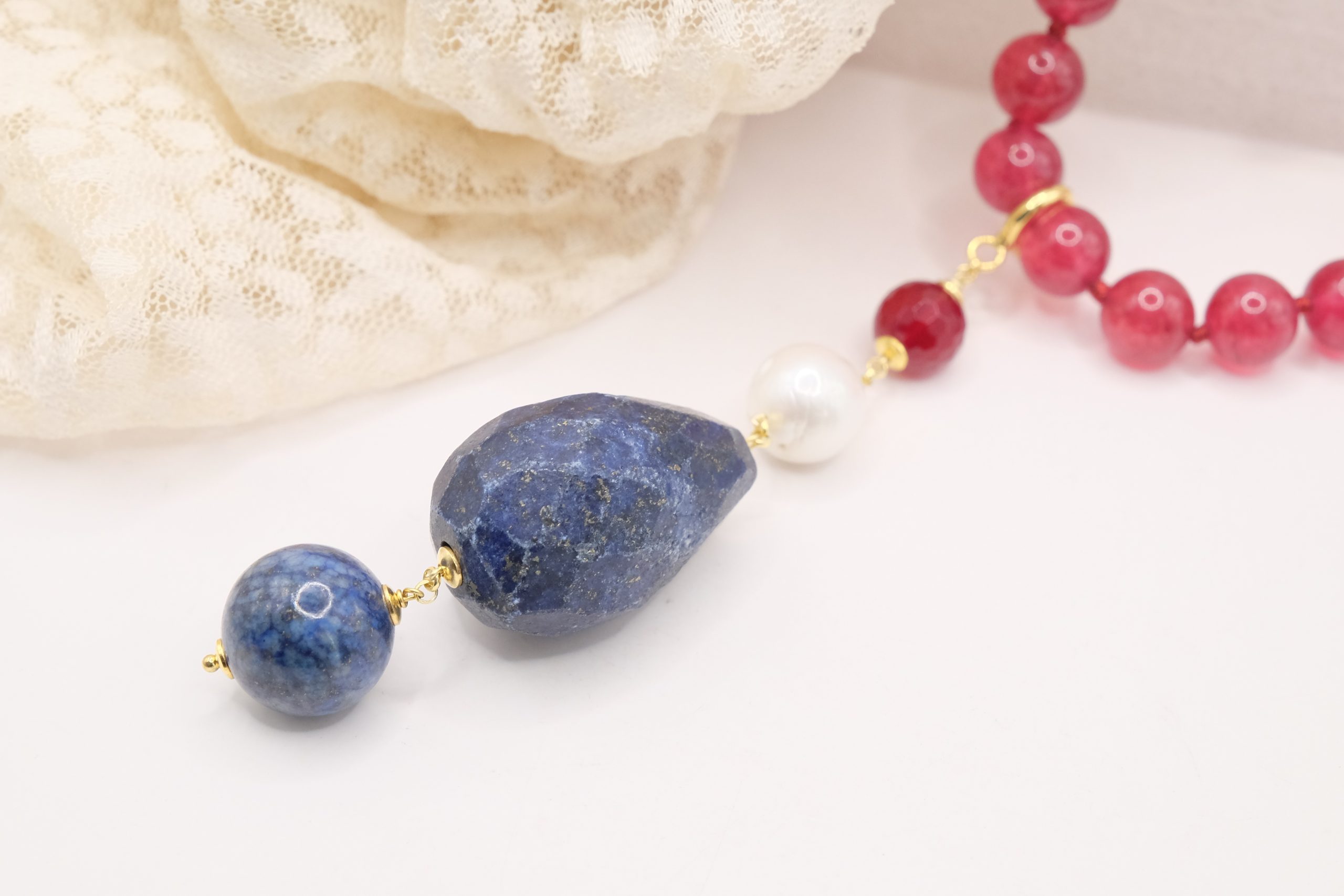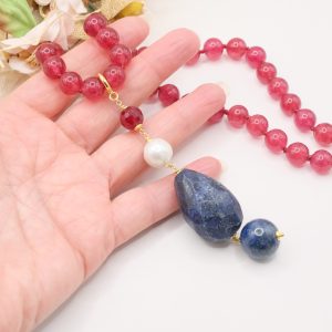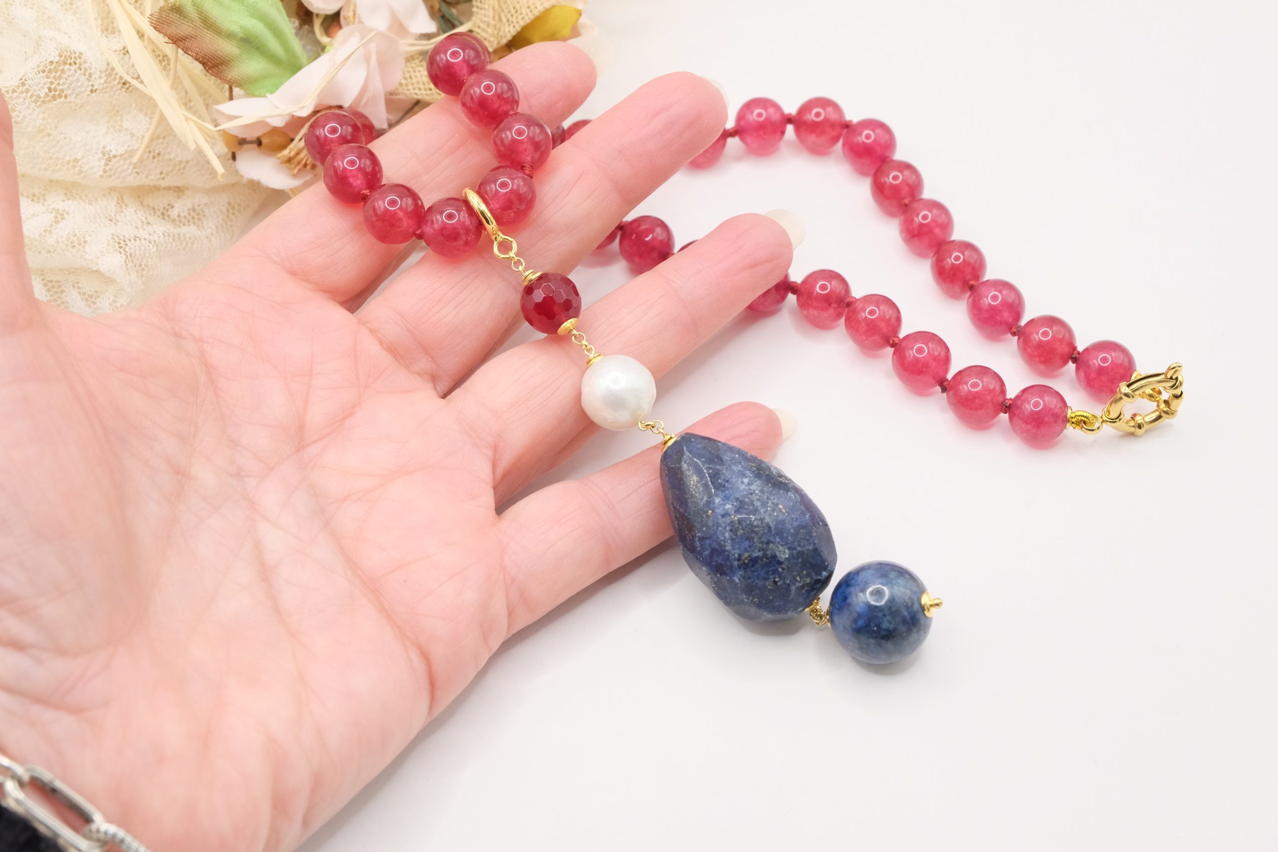Material: Burgundy Jade, Lapis, Burgundy Jade, Pearl, 925 Gold Plated Silver, Steel