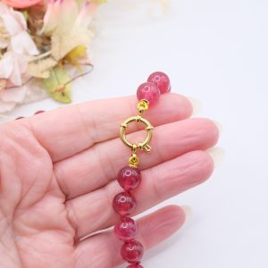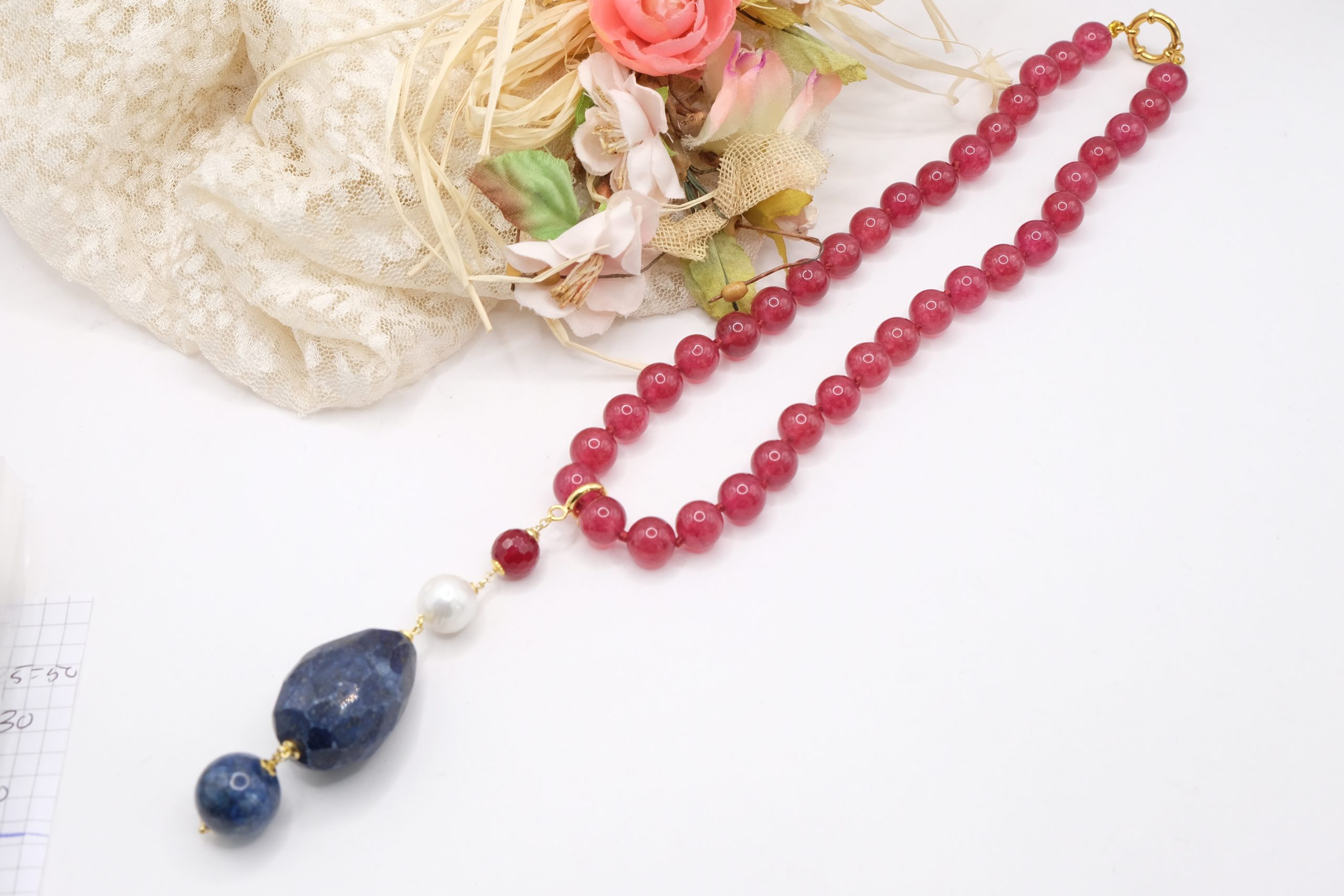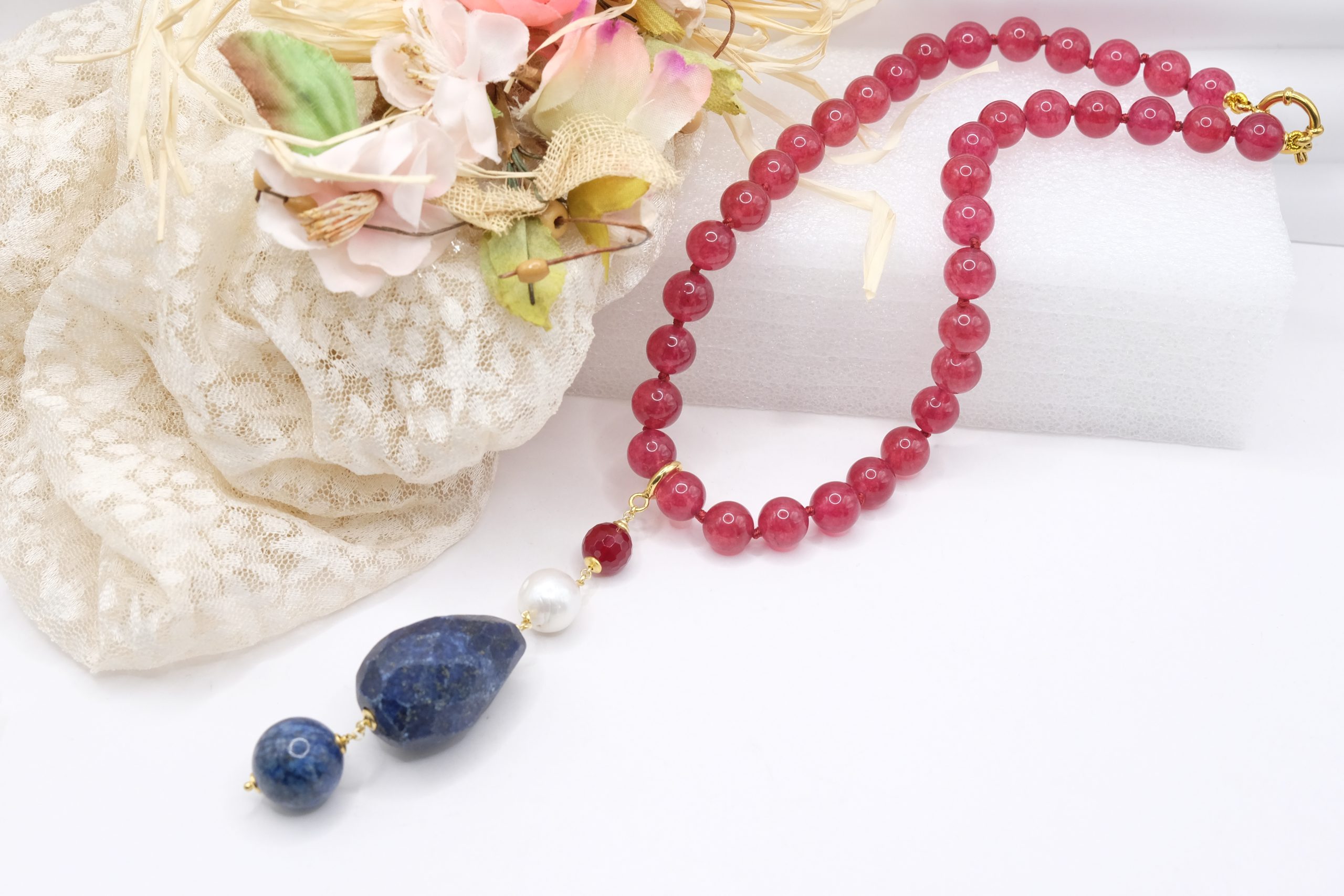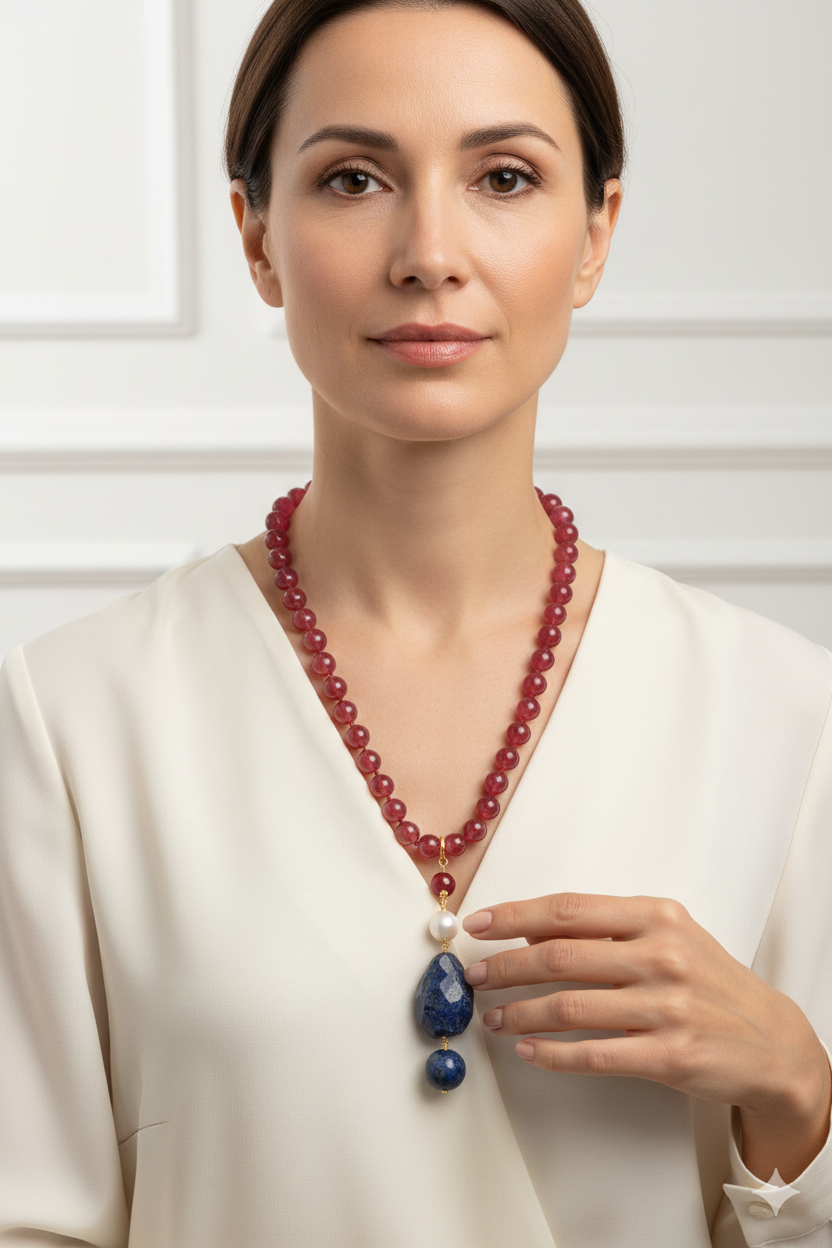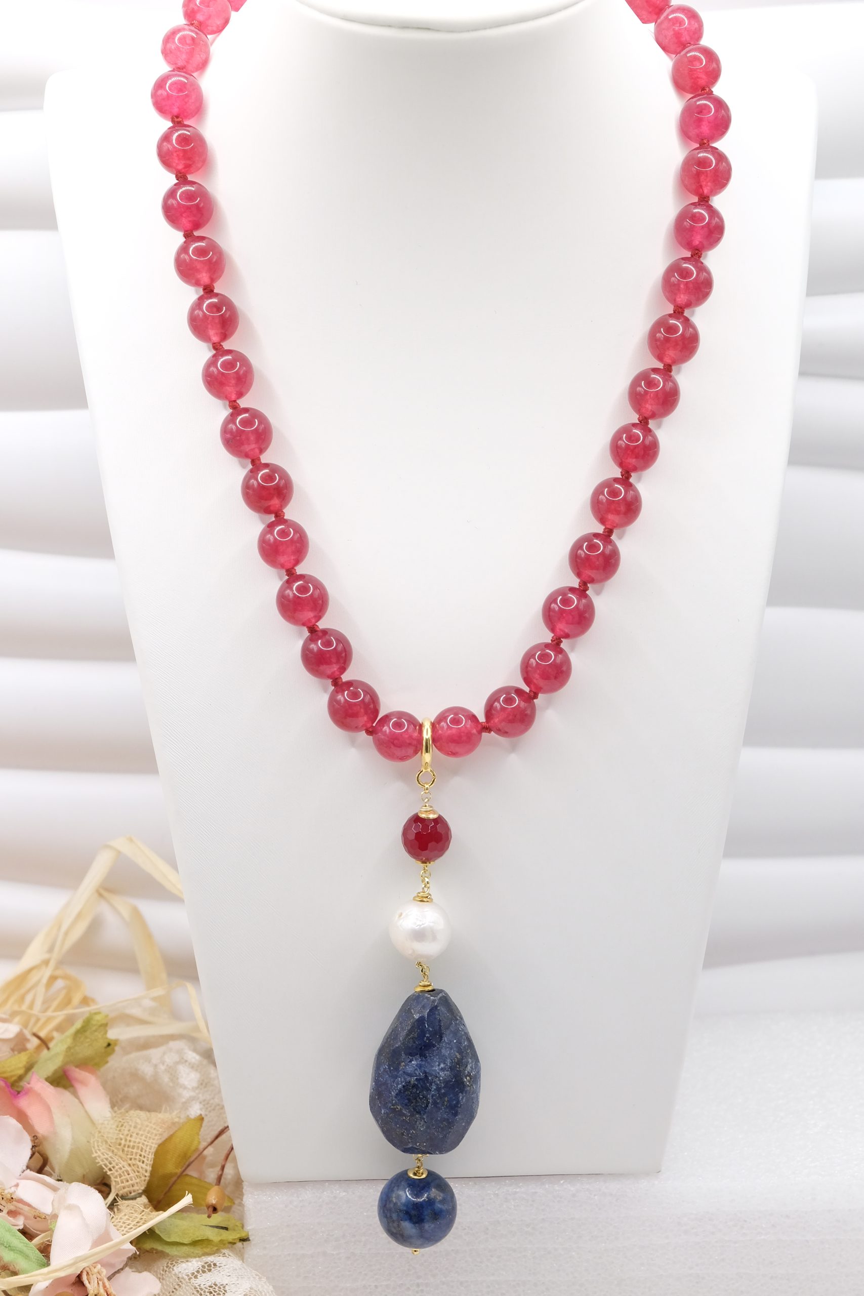 Material: Burgundy Jade, Lapis, Burgundy Jade, Pearl, 925 Gold Plated Silver, Steel
