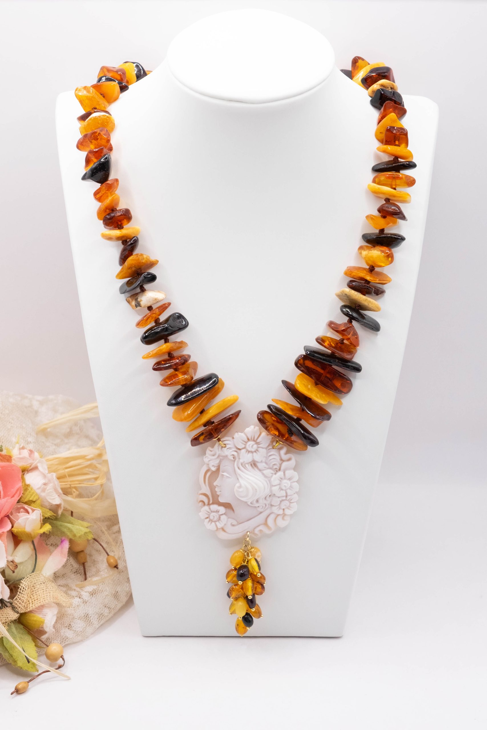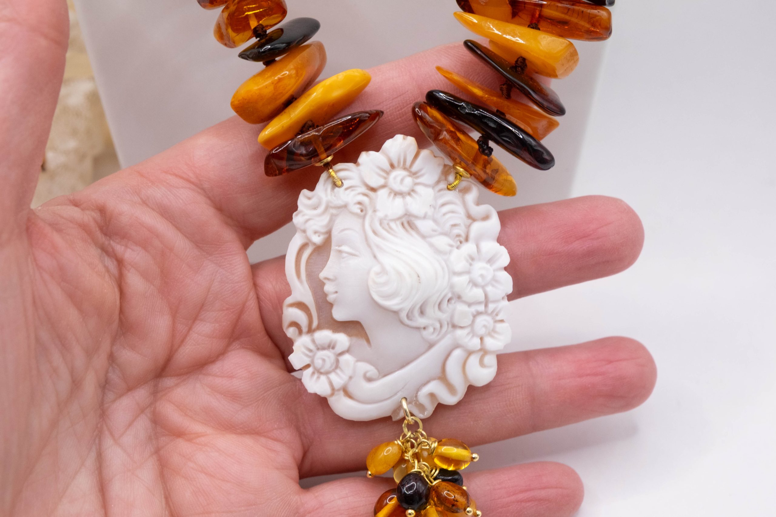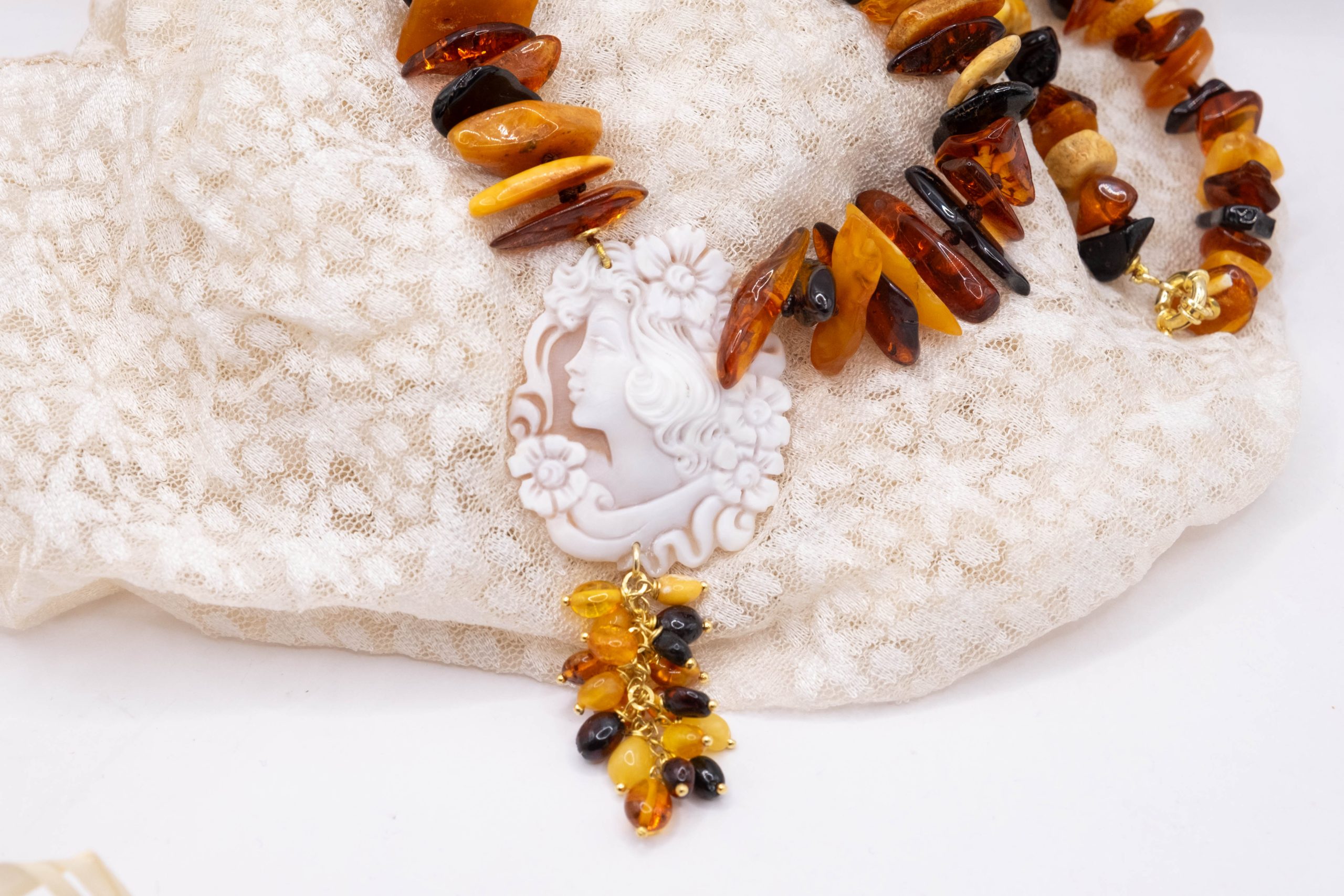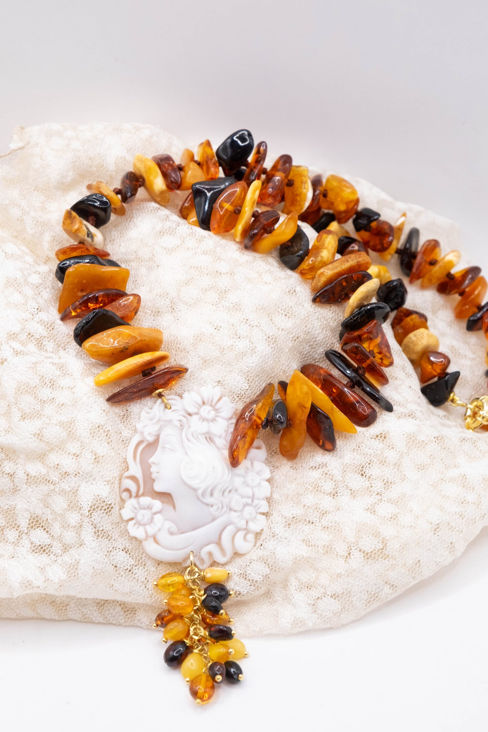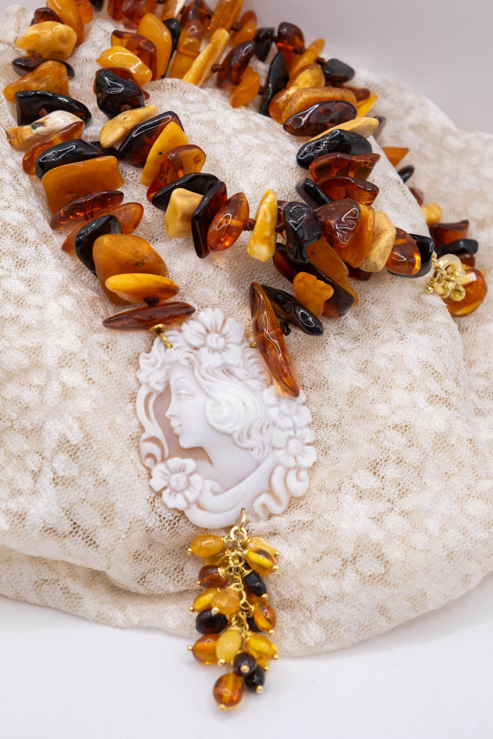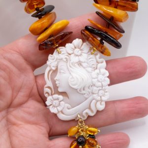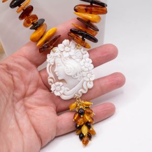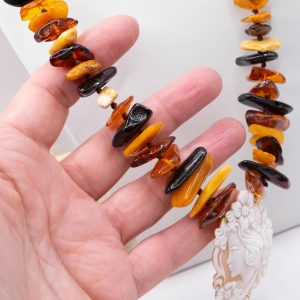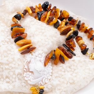 Elegant Baltic amber necklace with a thousand shades of color and a Torre del Greco cameo. Top quality.