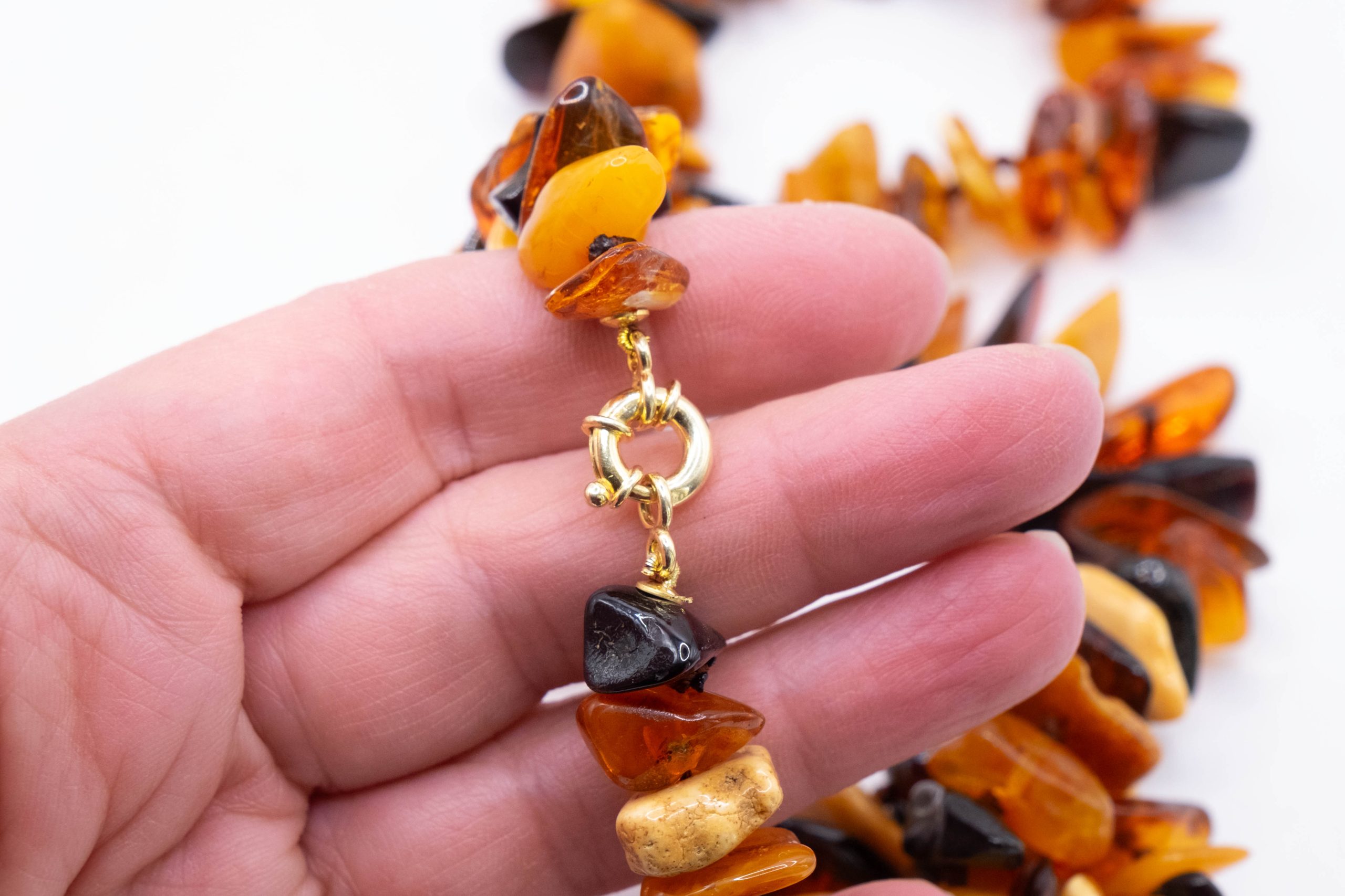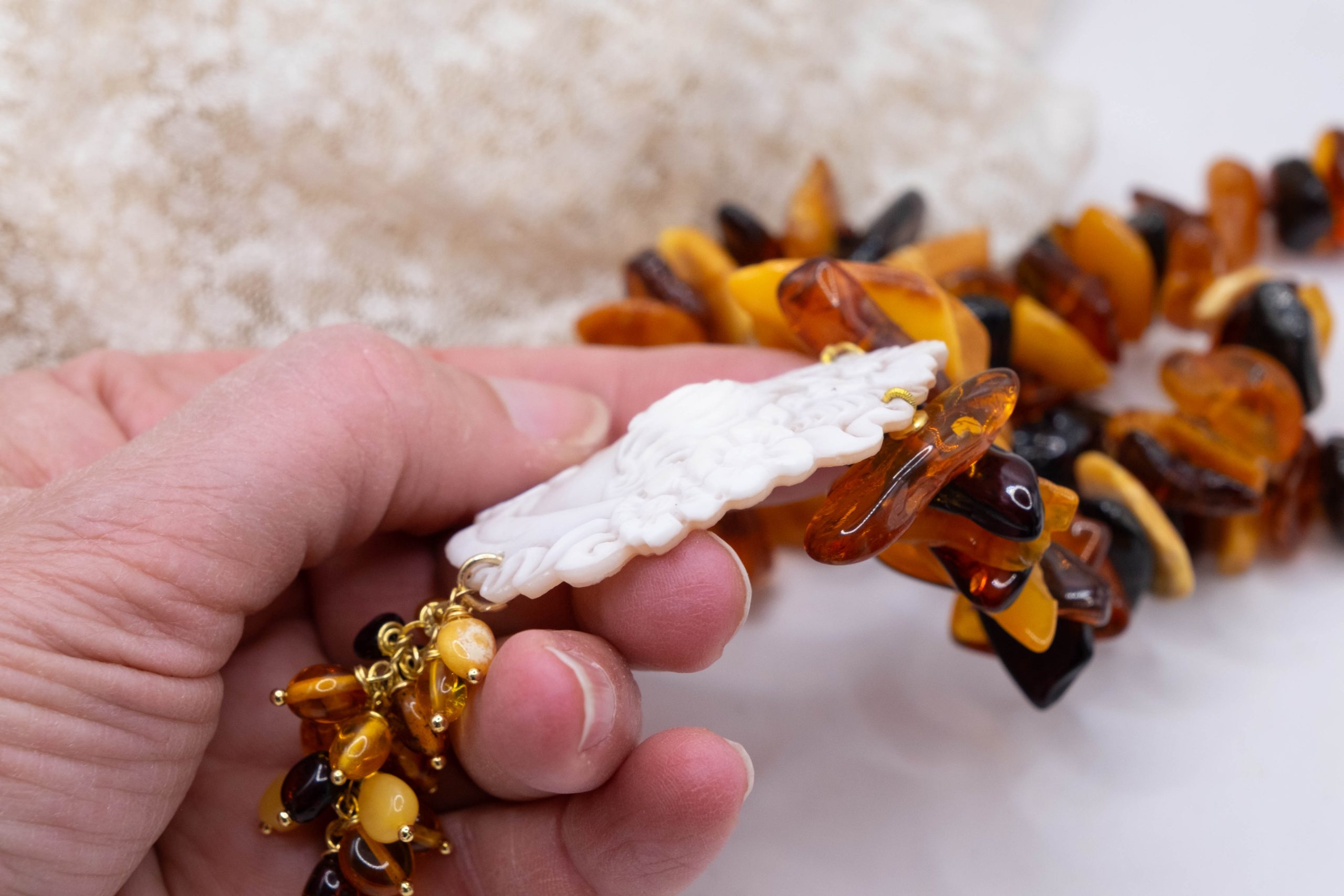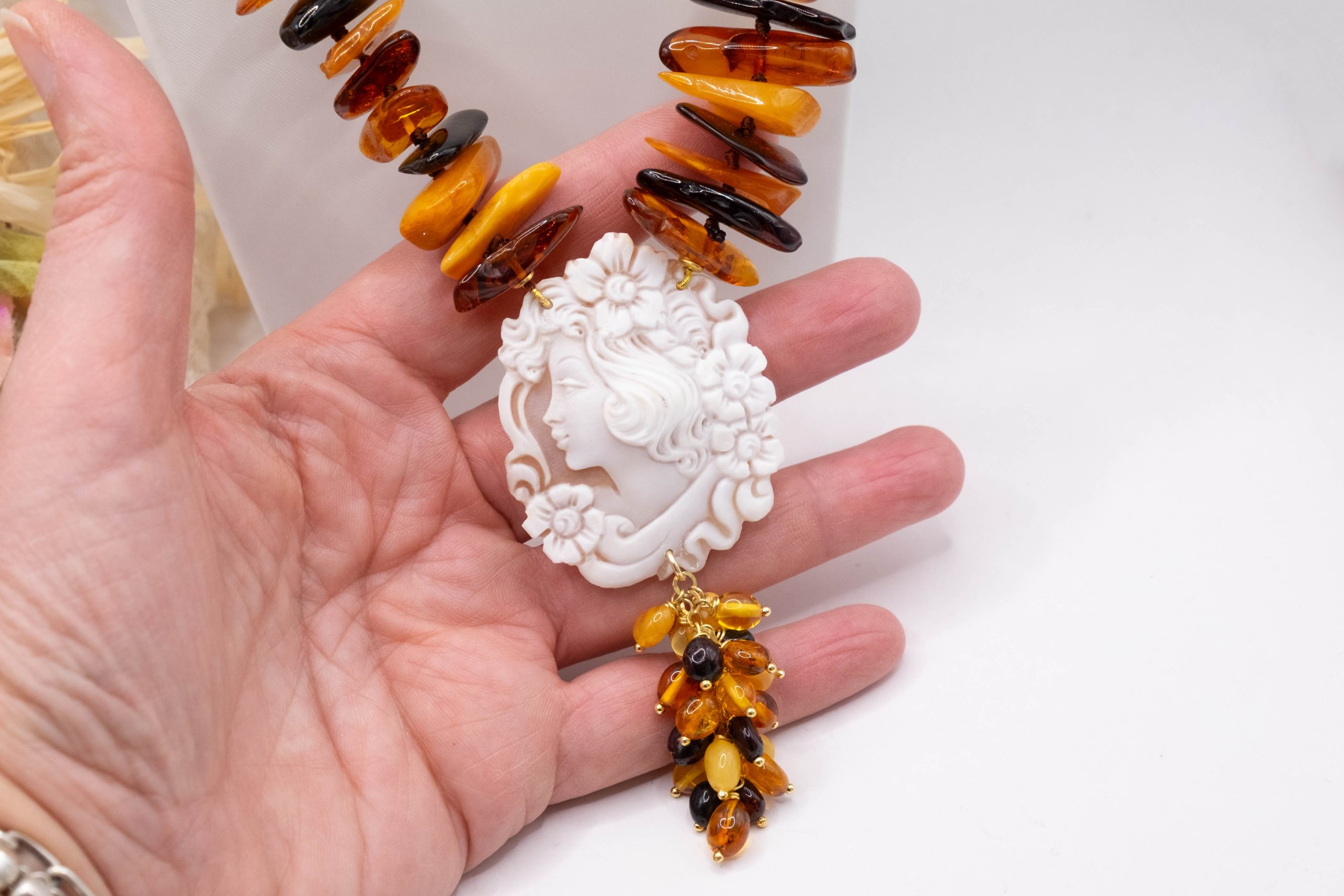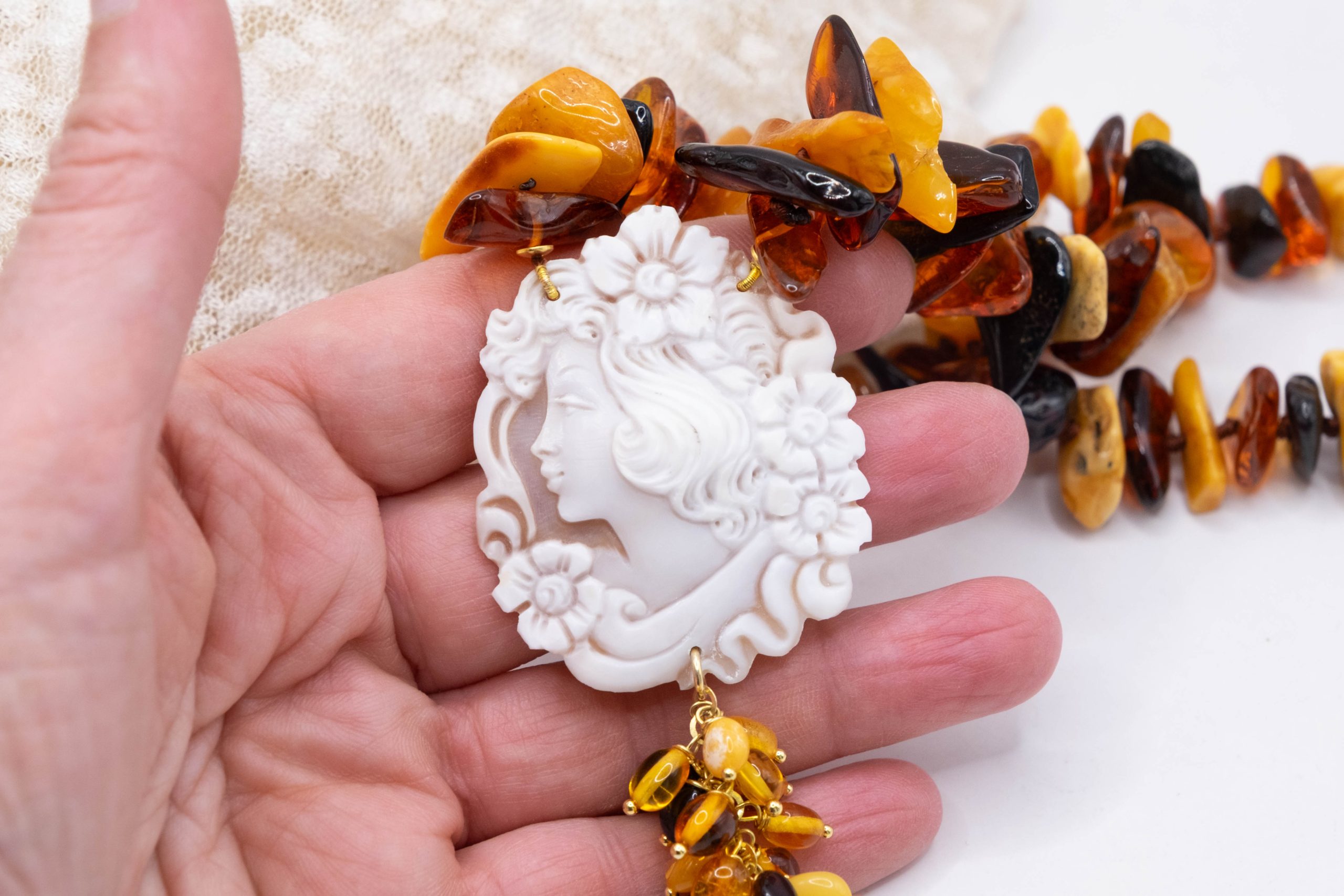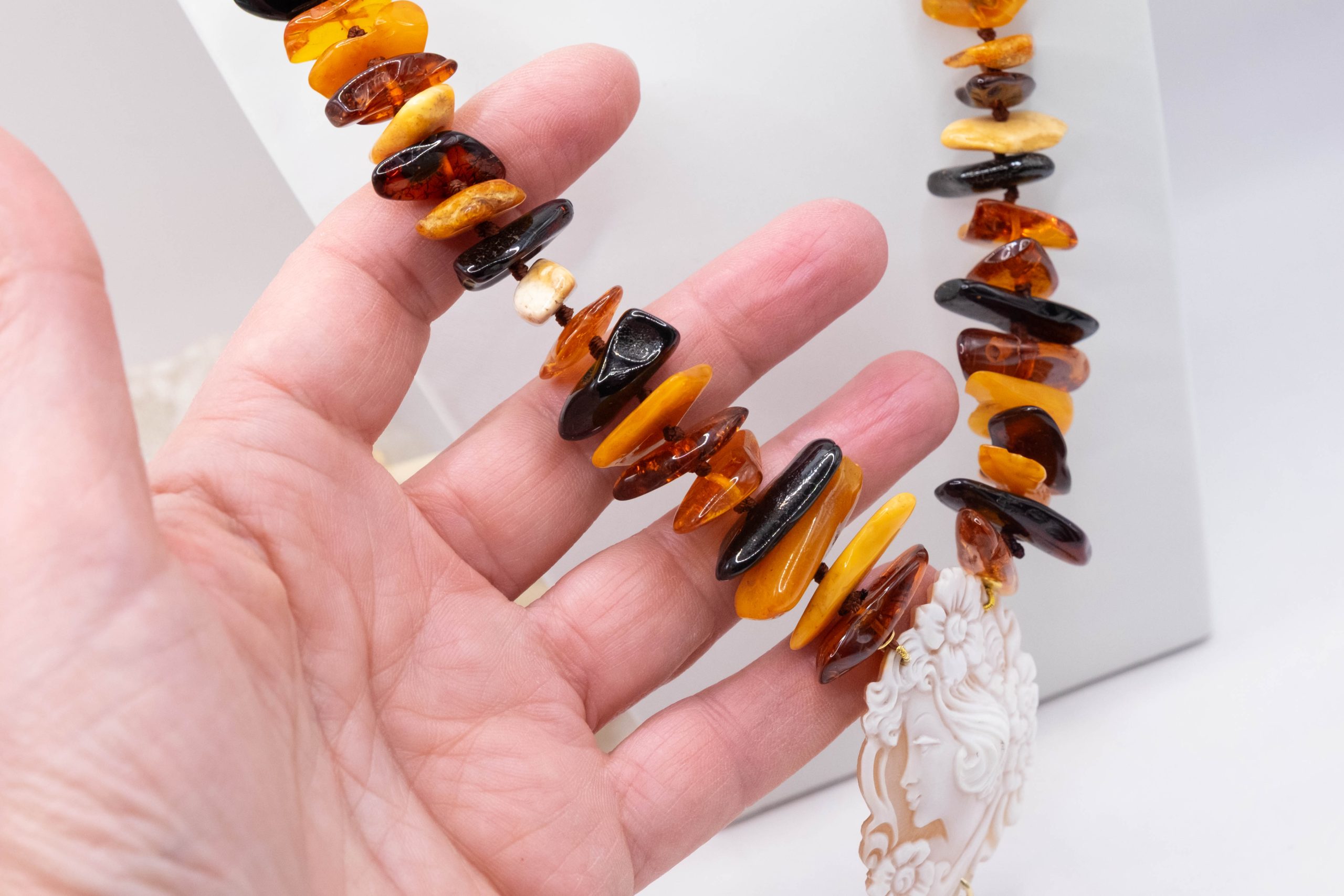 Elegant Baltic amber necklace with a thousand shades of color and a Torre del Greco cameo. Top quality.