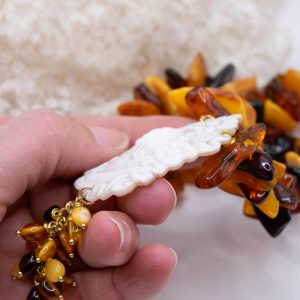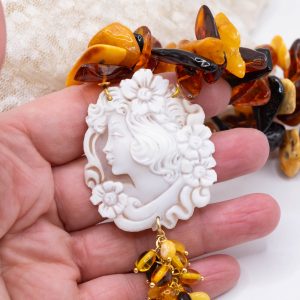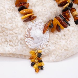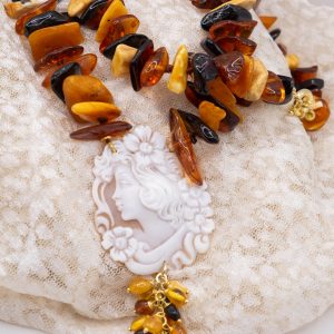 Let yourself be enveloped by the unique charm of Baltic amber, selected for its intense, warm, and luminous hues. Each pearl exudes a natural and precious aura, amplified by the enchanting cameo crafted in Torre del Greco, a true example of artisanal excellence.