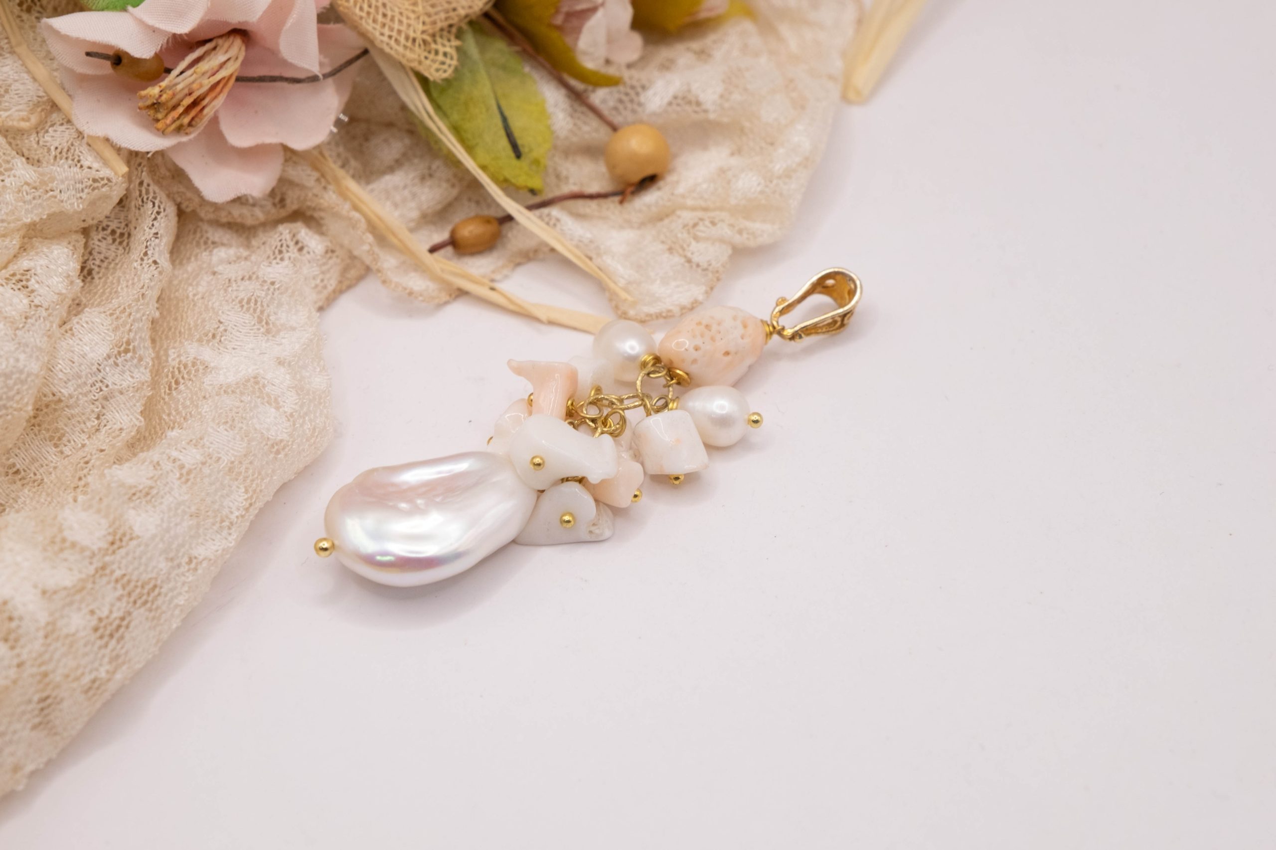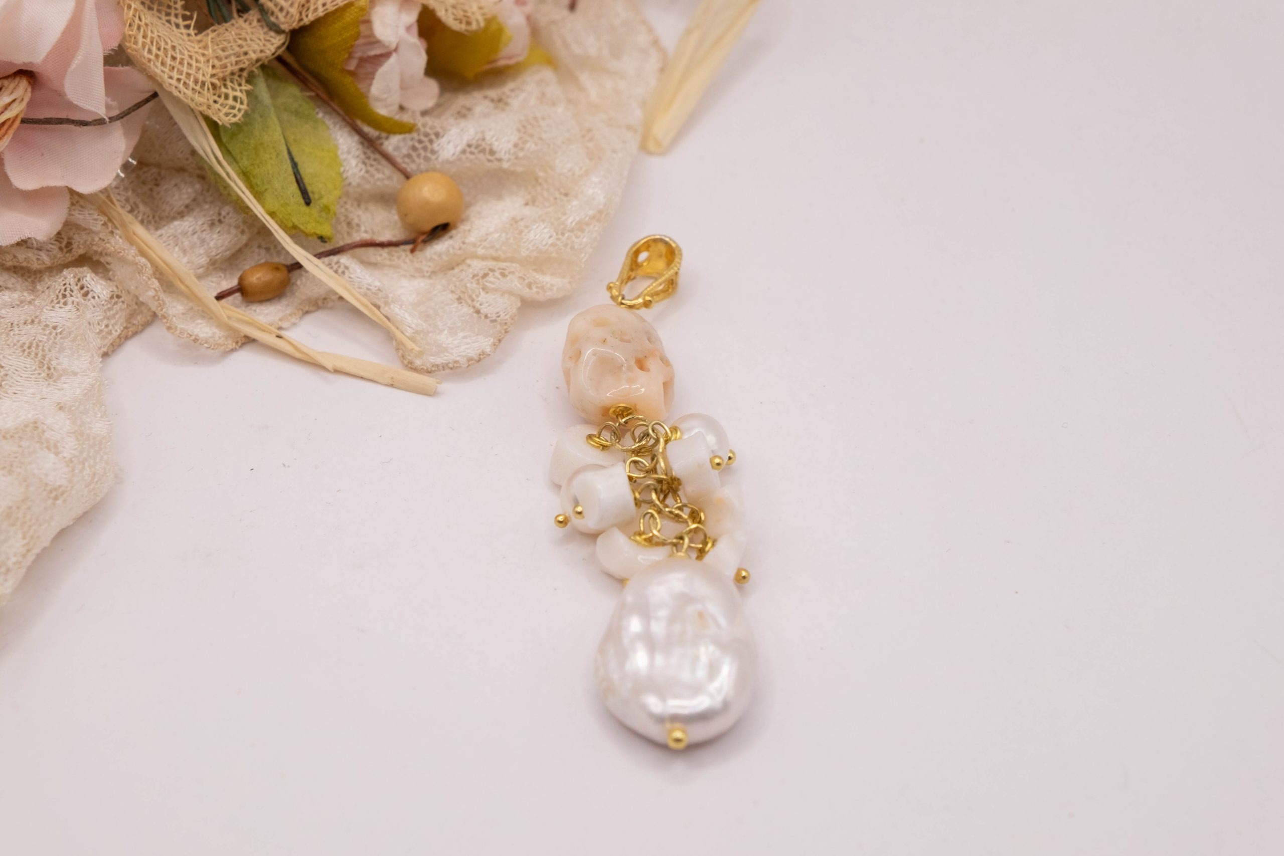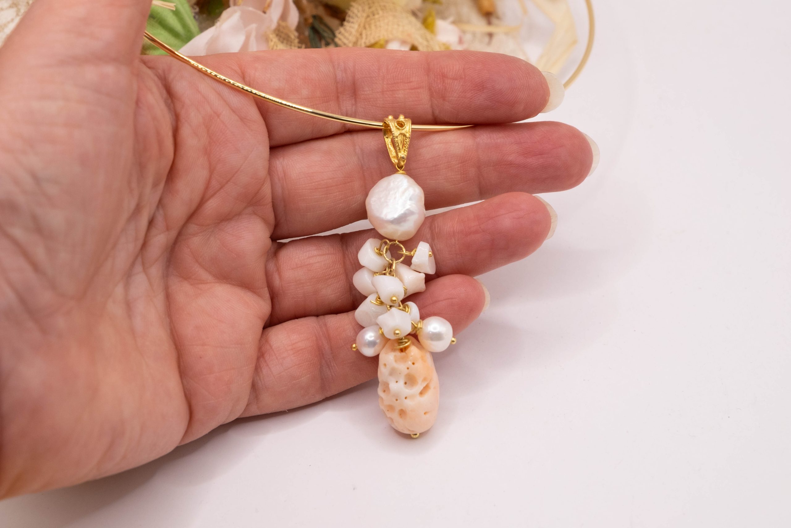 Elegant and lightweight necklace in gold-plated brass (diameter 44 cm), with a precious 7.5 cm long pendant made of natural pink coral and irregular natural pearls.