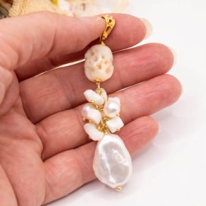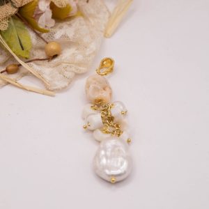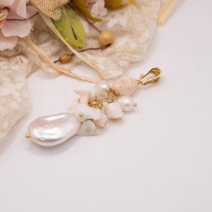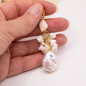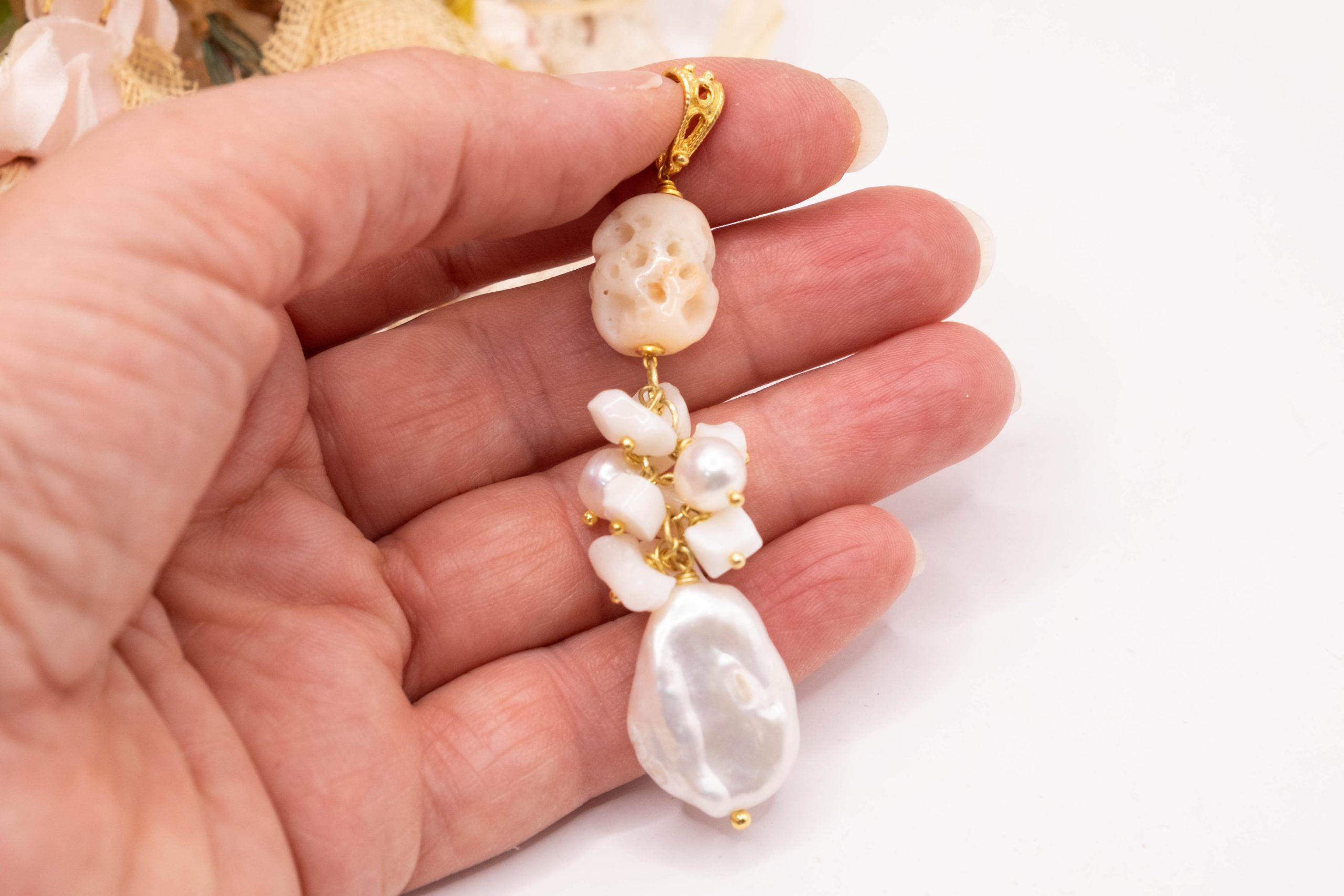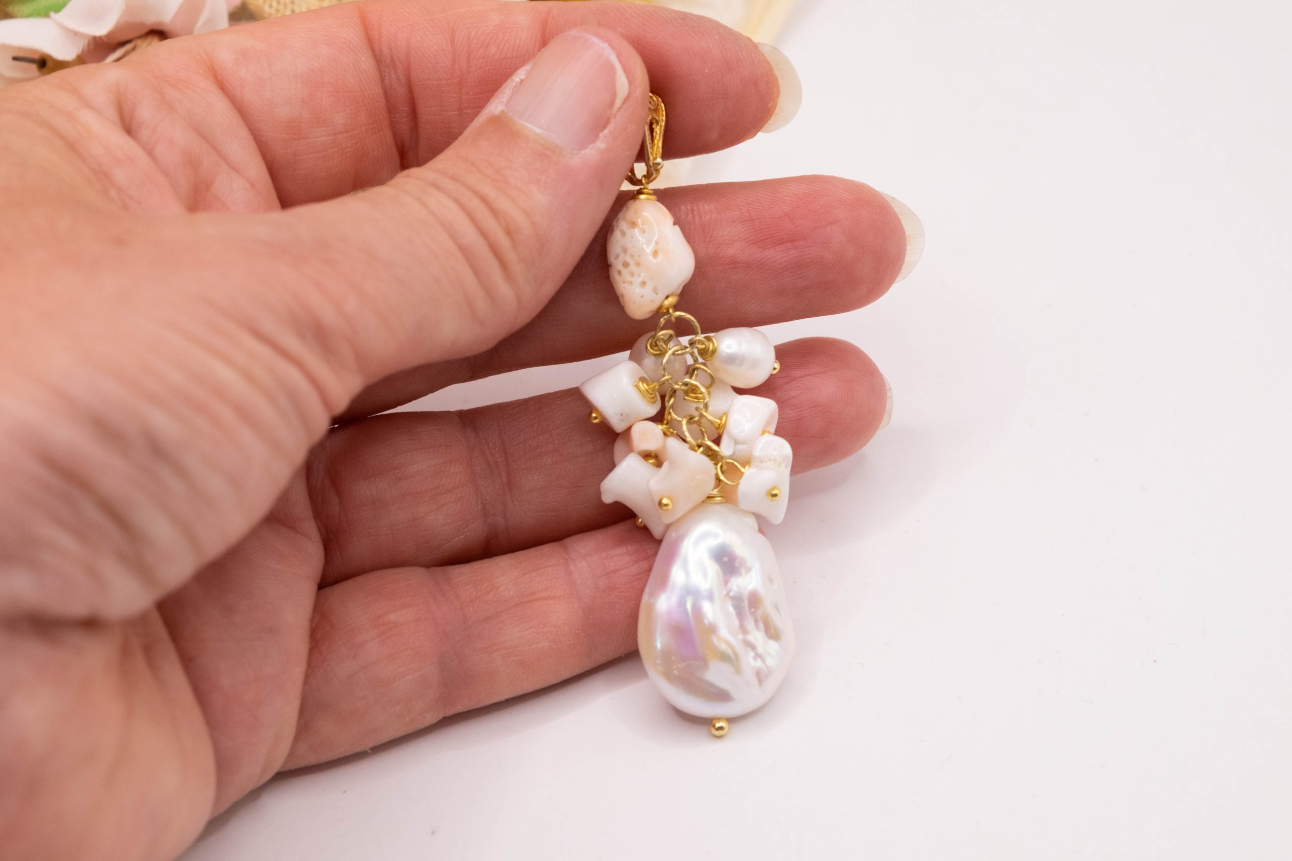 Elegant and lightweight necklace in gold-plated brass (diameter 44 cm), with a precious 7.5 cm long pendant made of natural pink coral and irregular natural pearls.