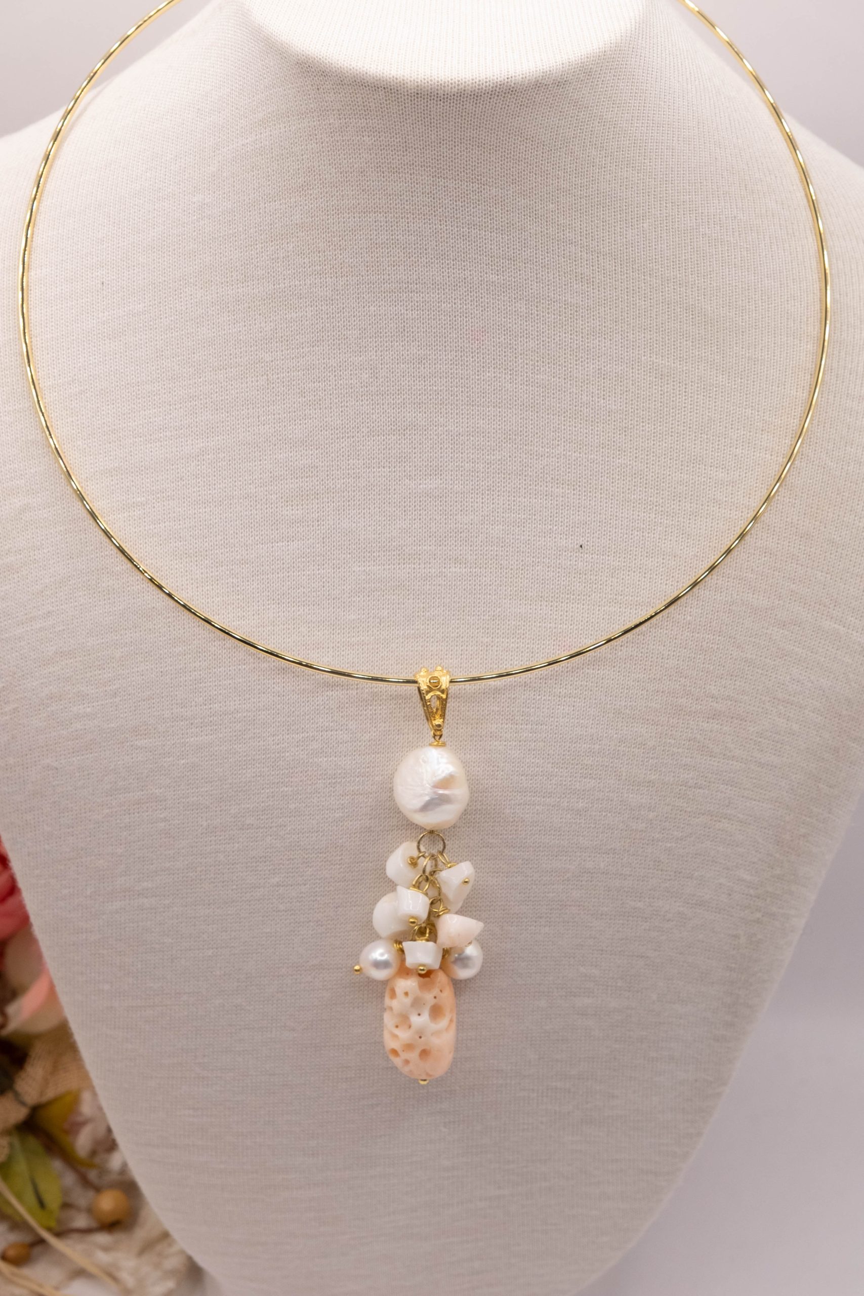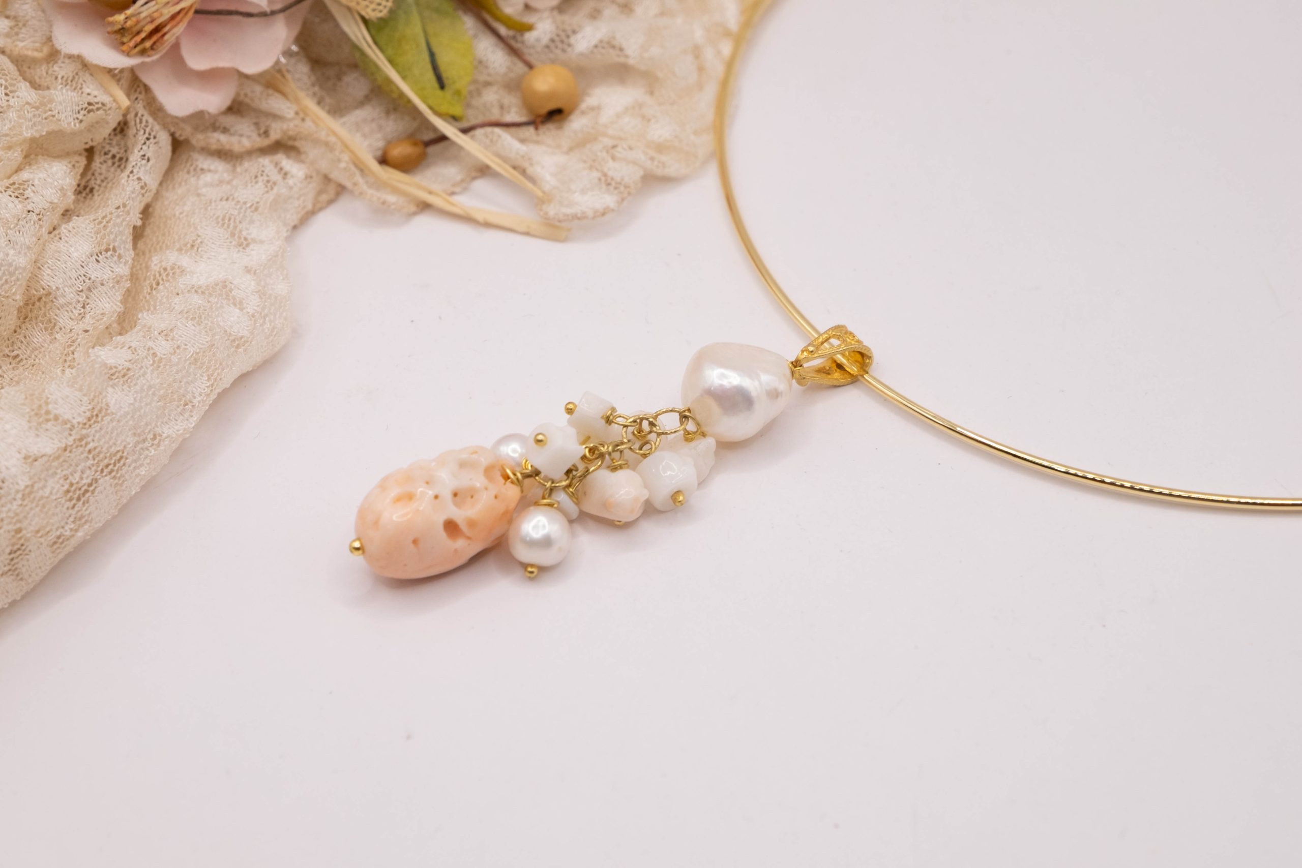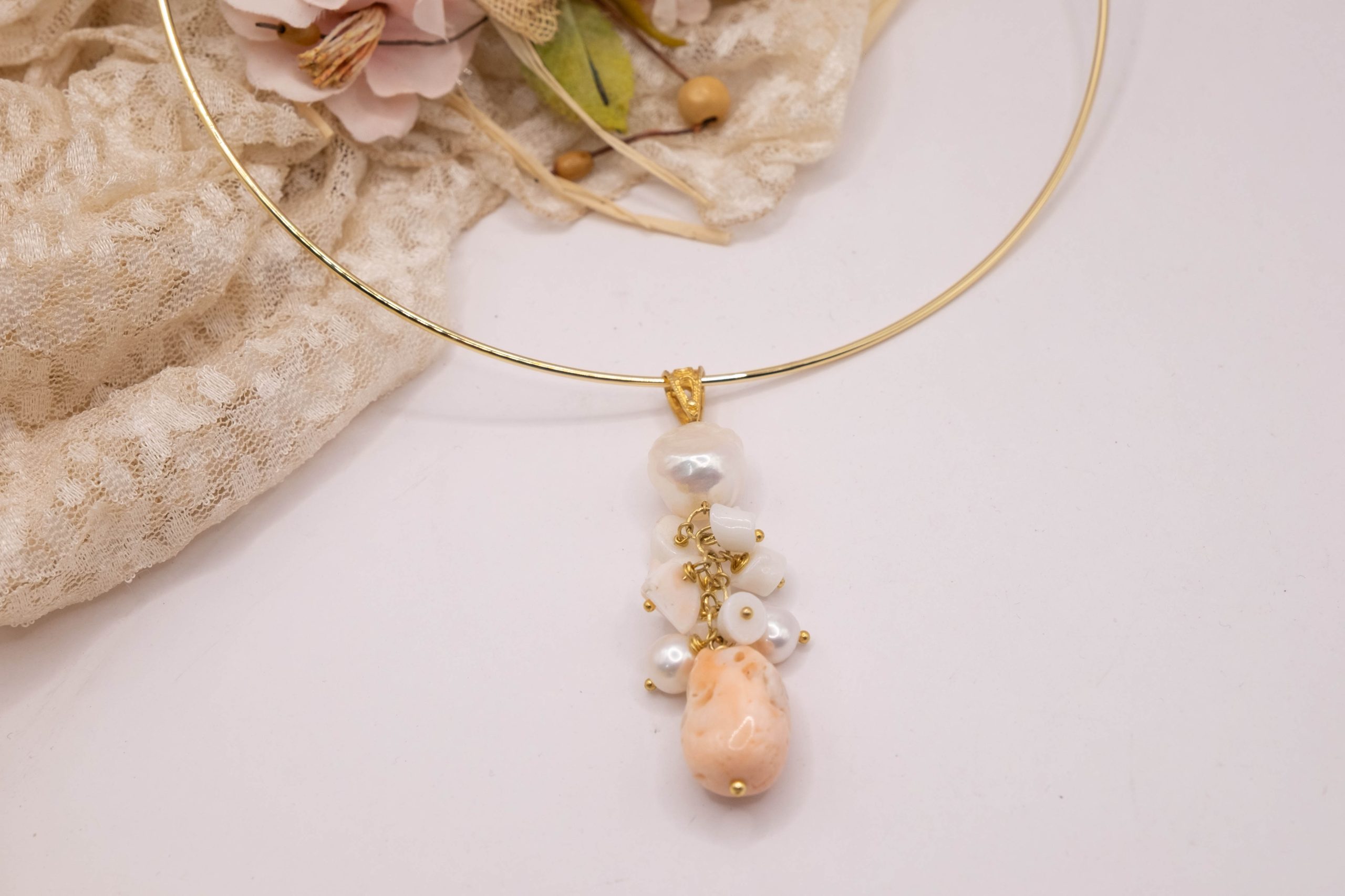 Rigid Choker Necklace with Pink Coral and Pearl Pendant