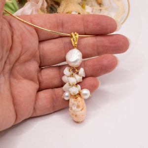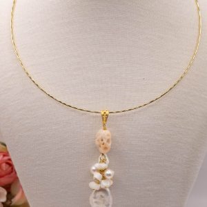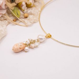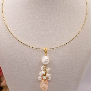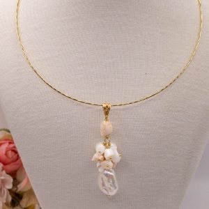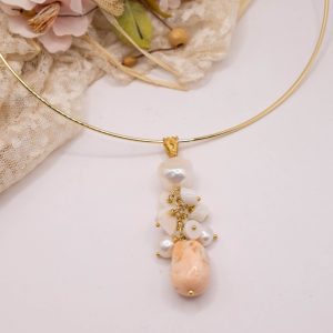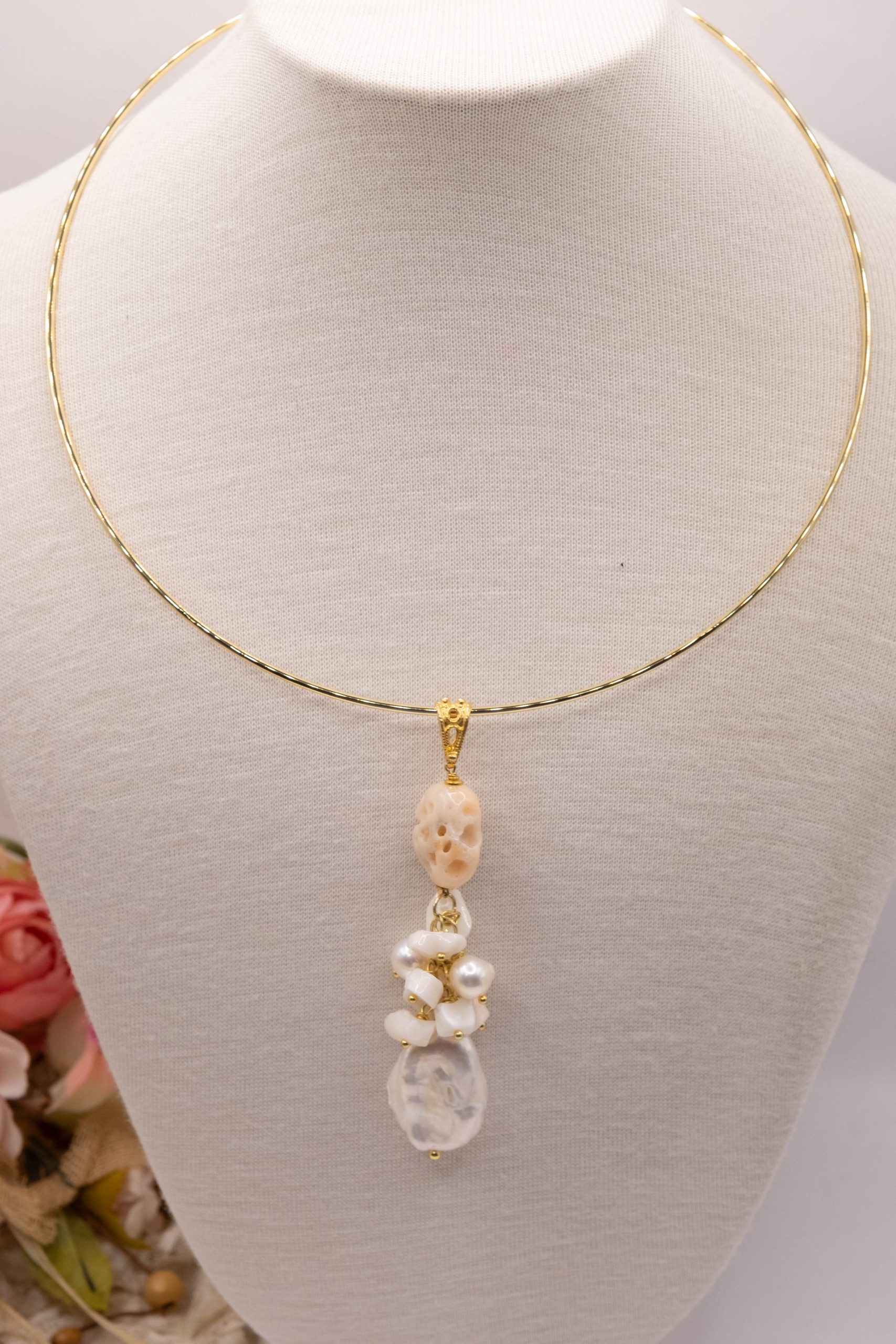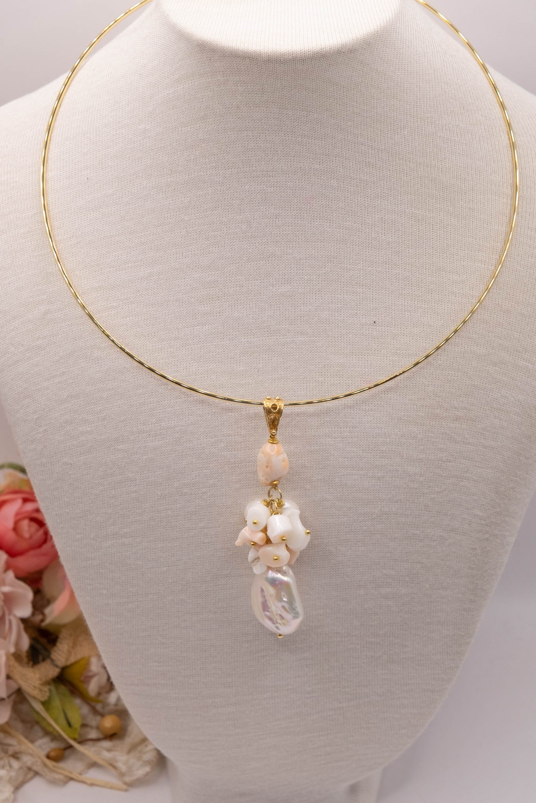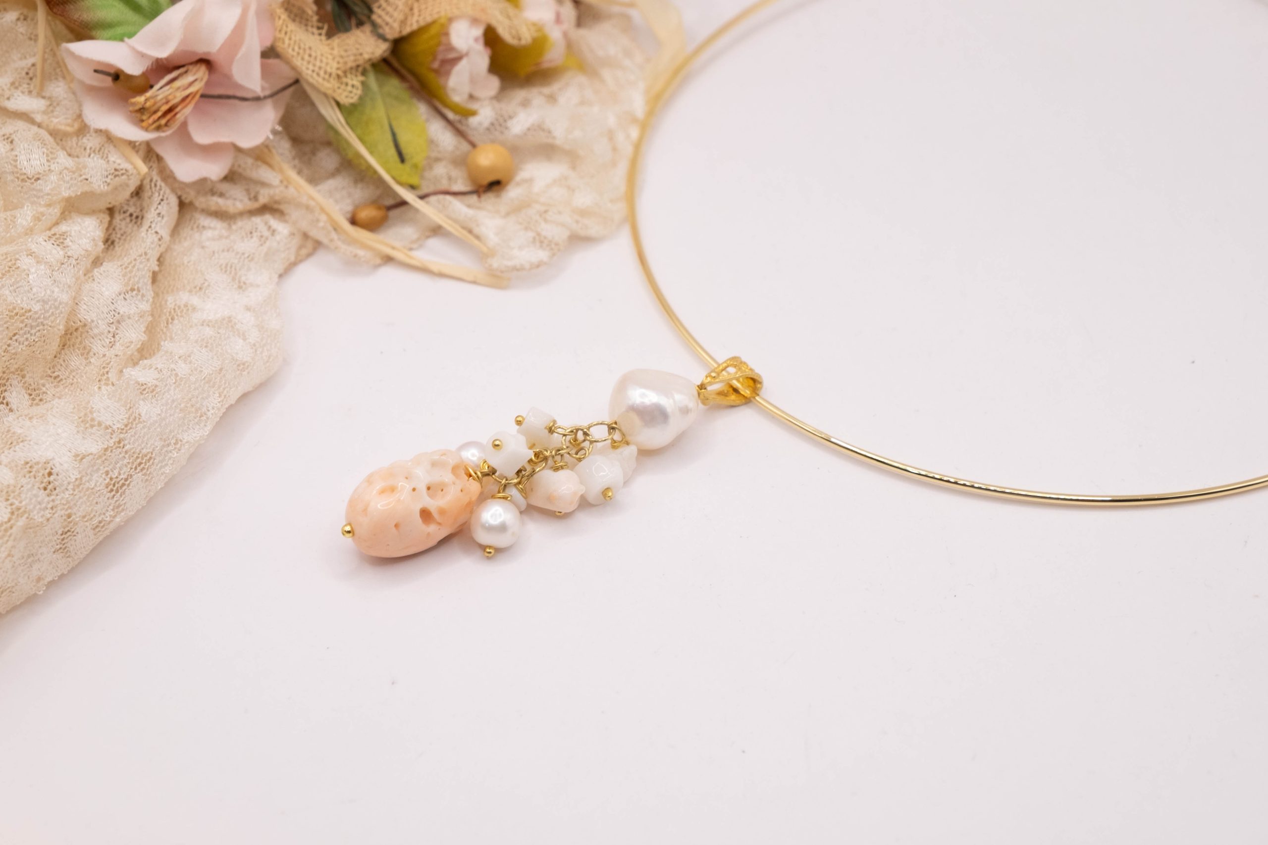 Rigid Choker Necklace with Pink Coral and Pearl Pendant