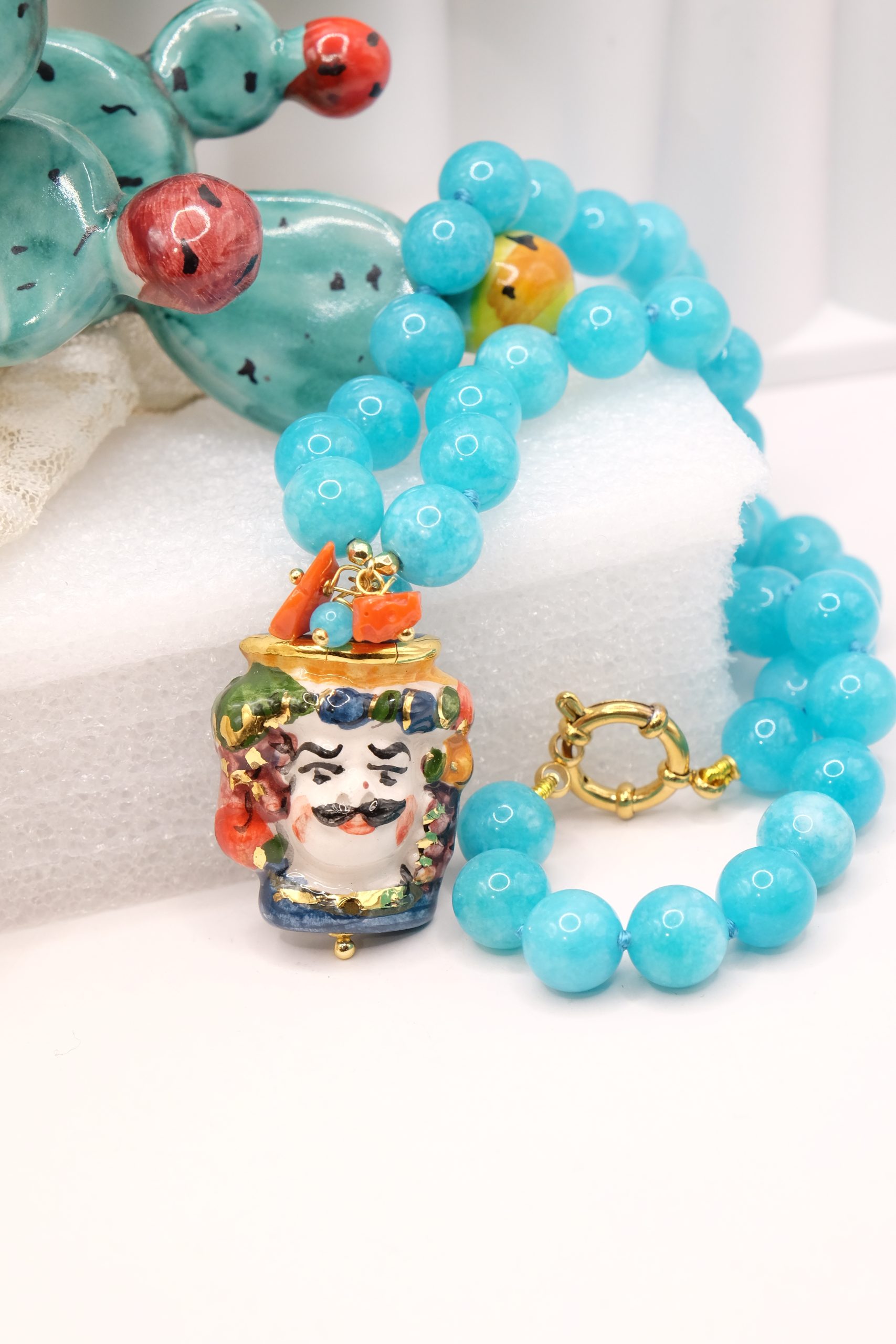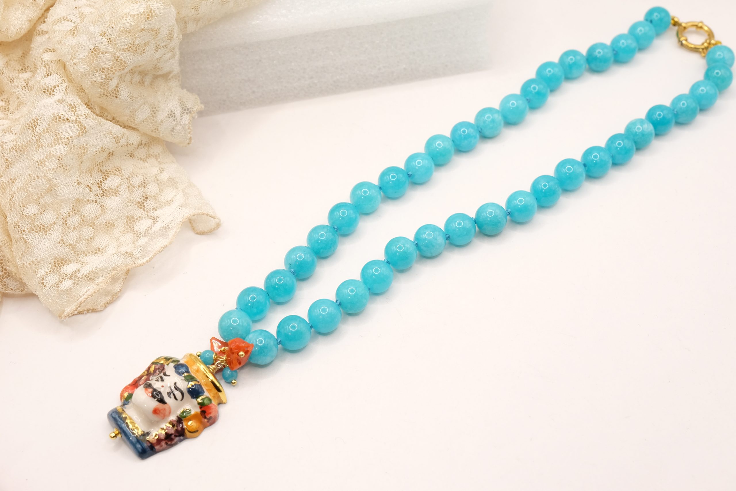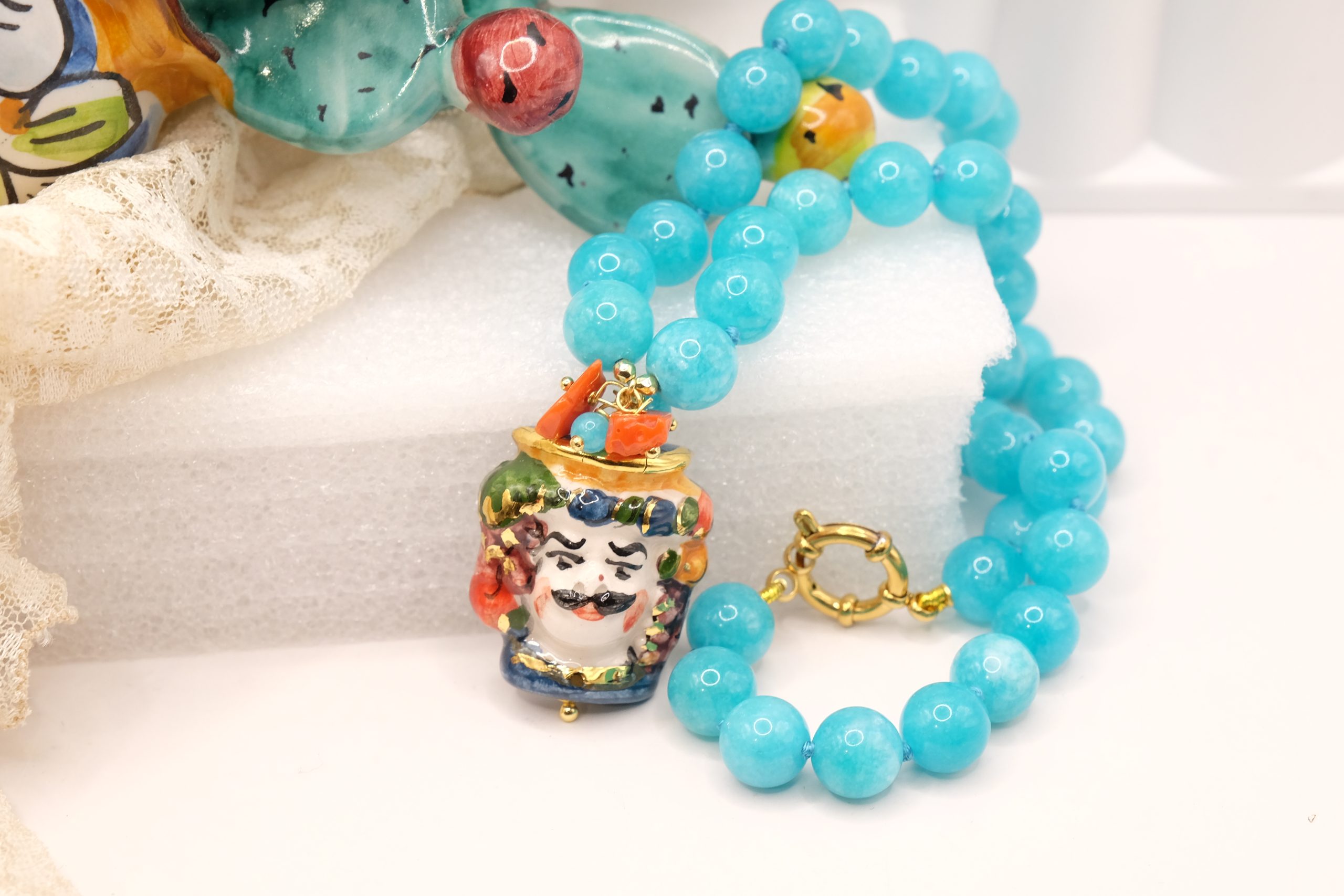 Necklace made entirely by hand, with 10 mm Tiffany green natural jade choker and Moor's Head pendant in Caltagirone ceramic hand-decorated with pure gold, enriched with natural coral