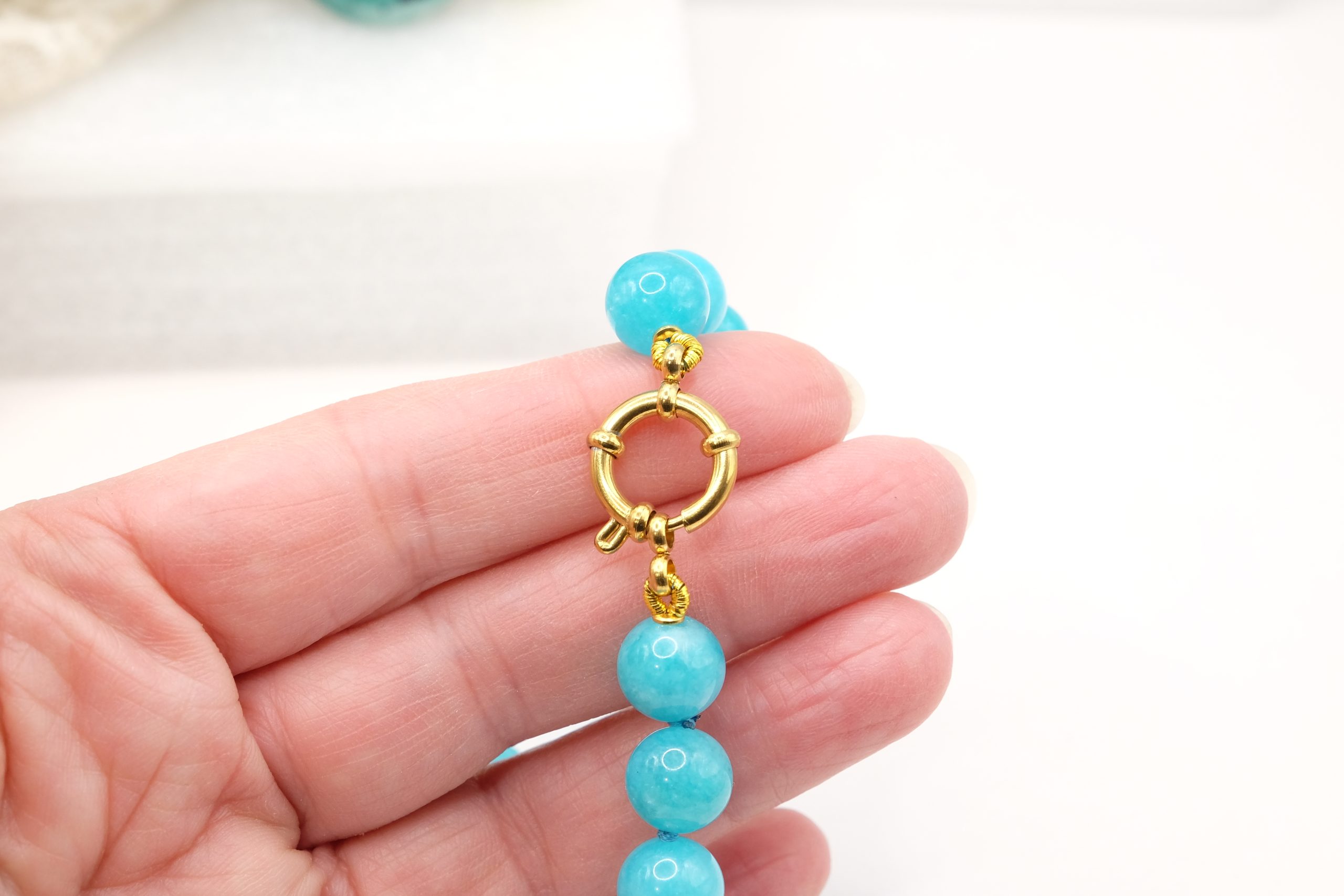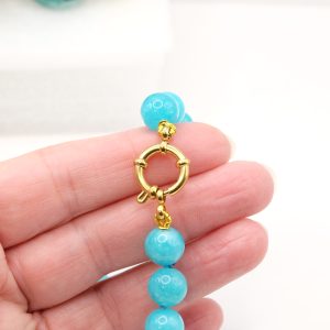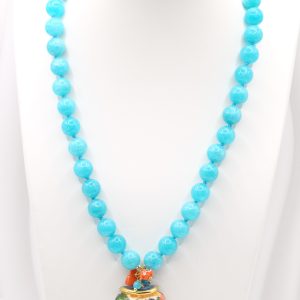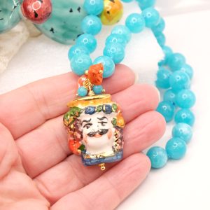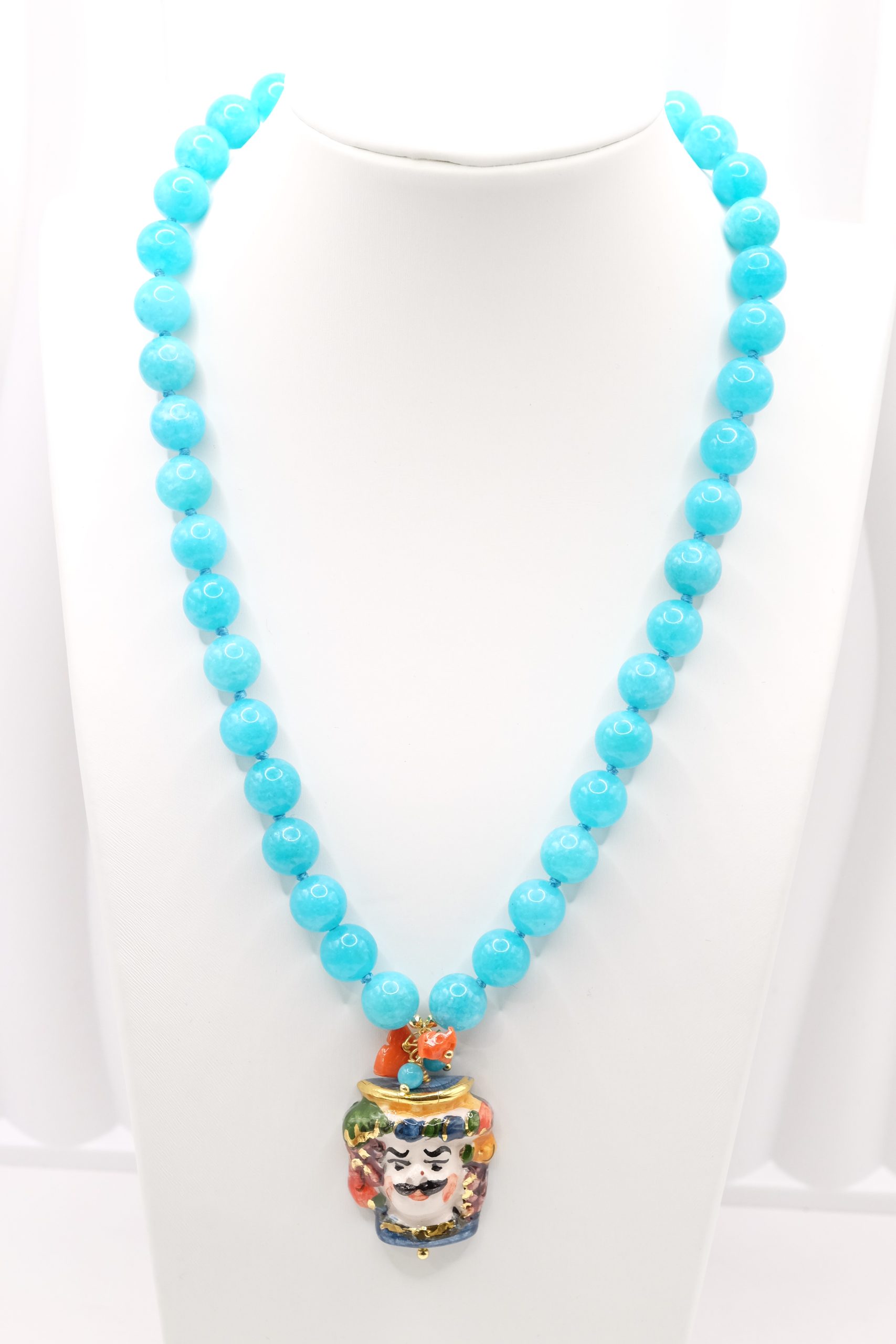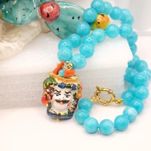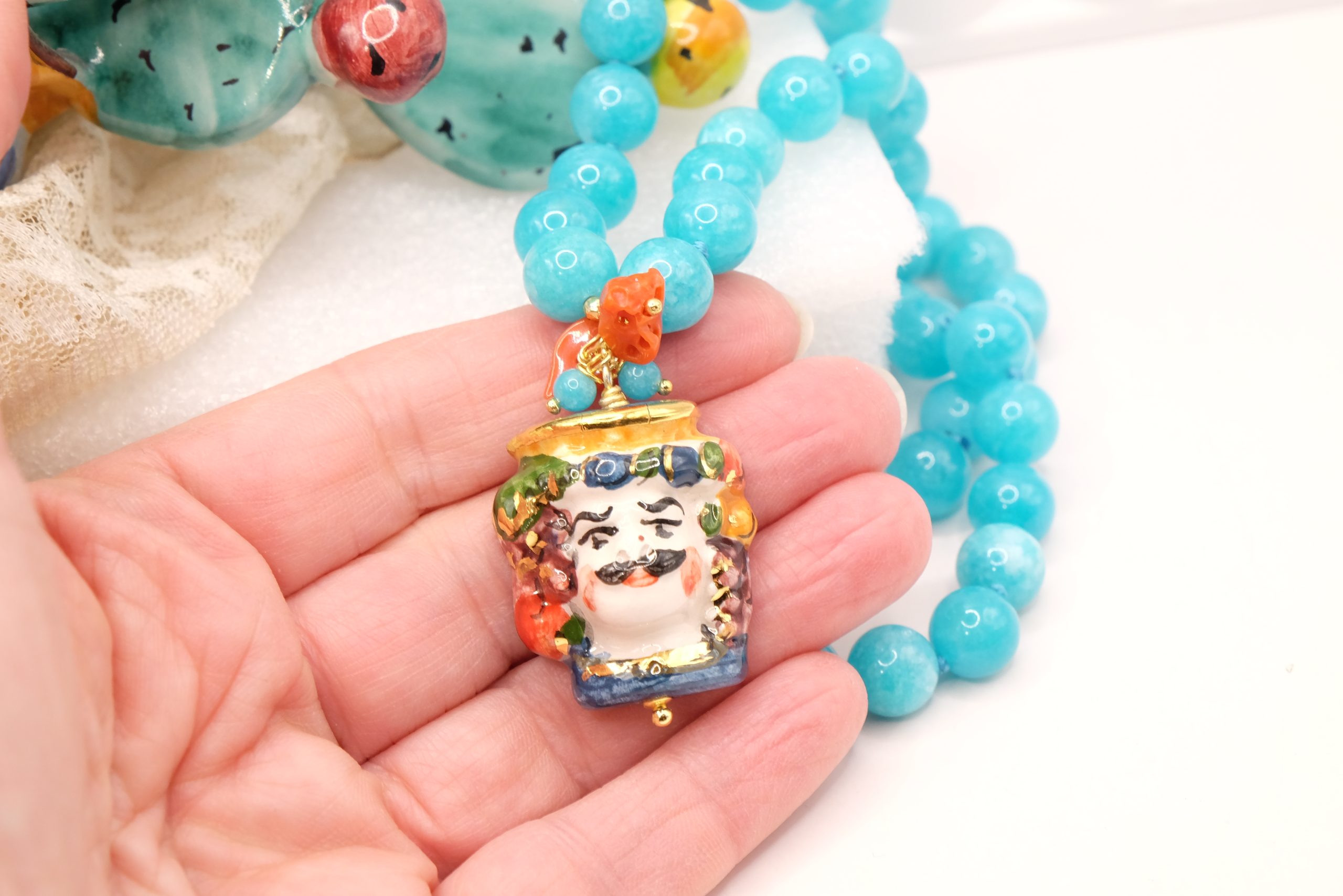 Necklace made entirely by hand, with 10 mm Tiffany green natural jade choker and Moor's Head pendant in Caltagirone ceramic hand-decorated with pure gold, enriched with natural coral