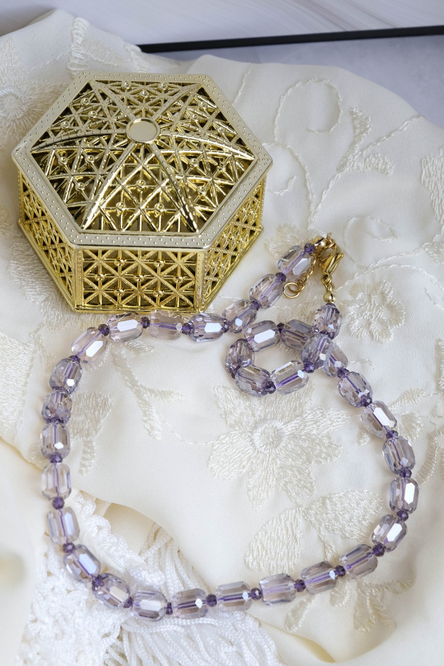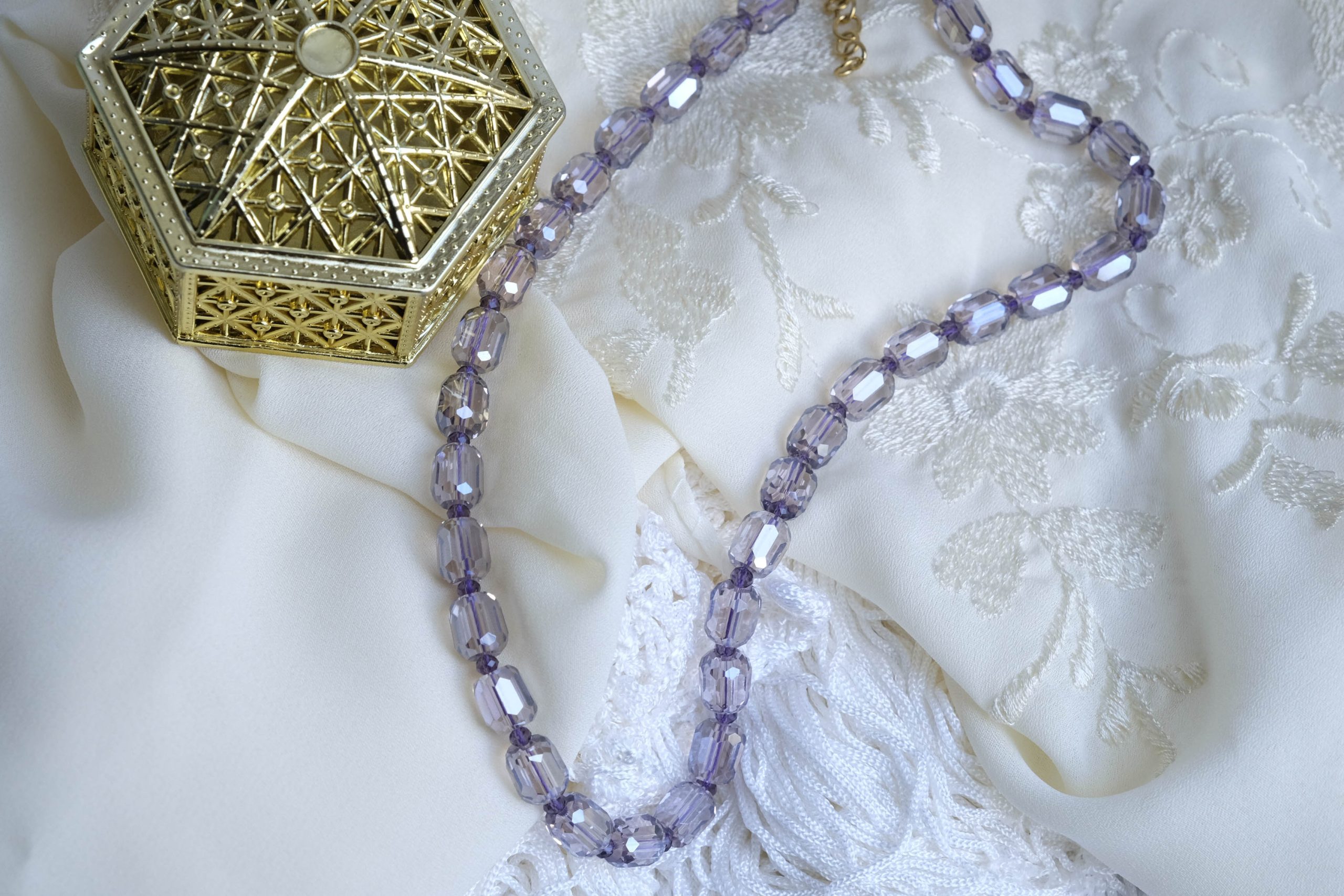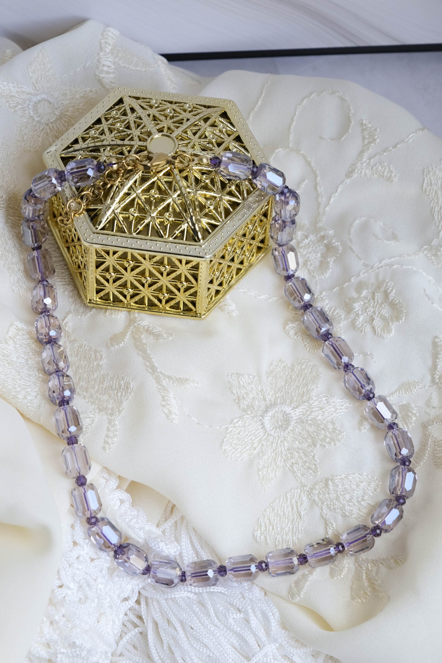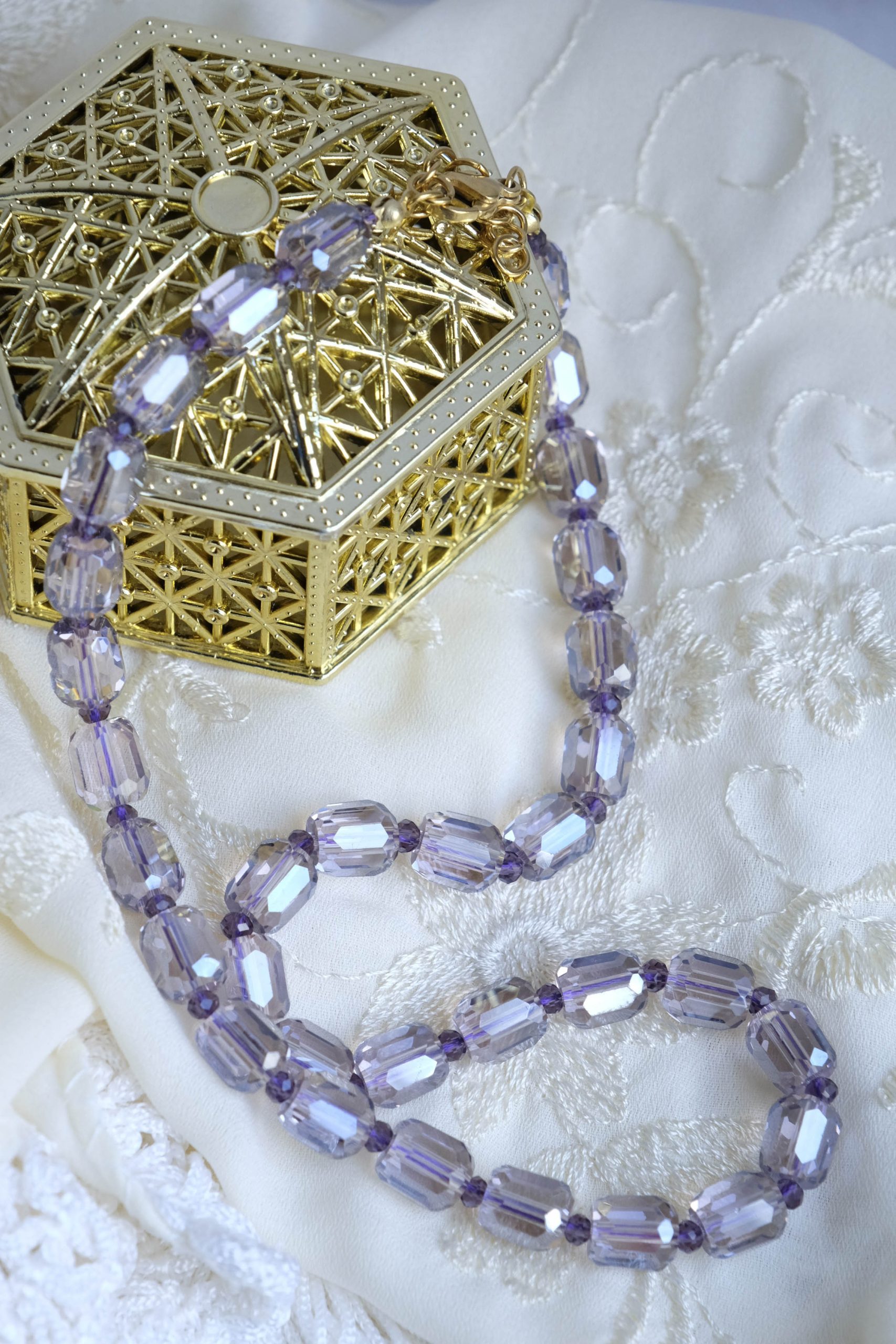 Material: Faceted crystals that catch the light from every angle.