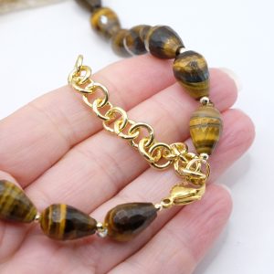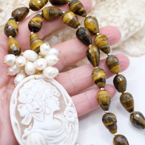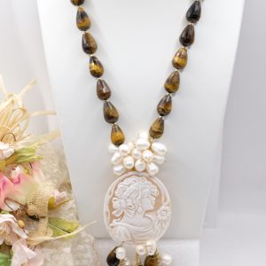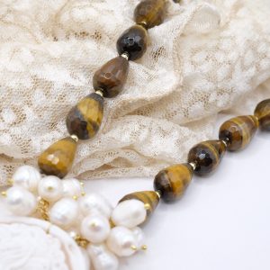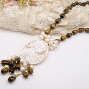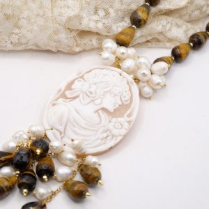 Collana Gocce Occhio di Tigre Perle e Cammeo di Torre del Greco a Y