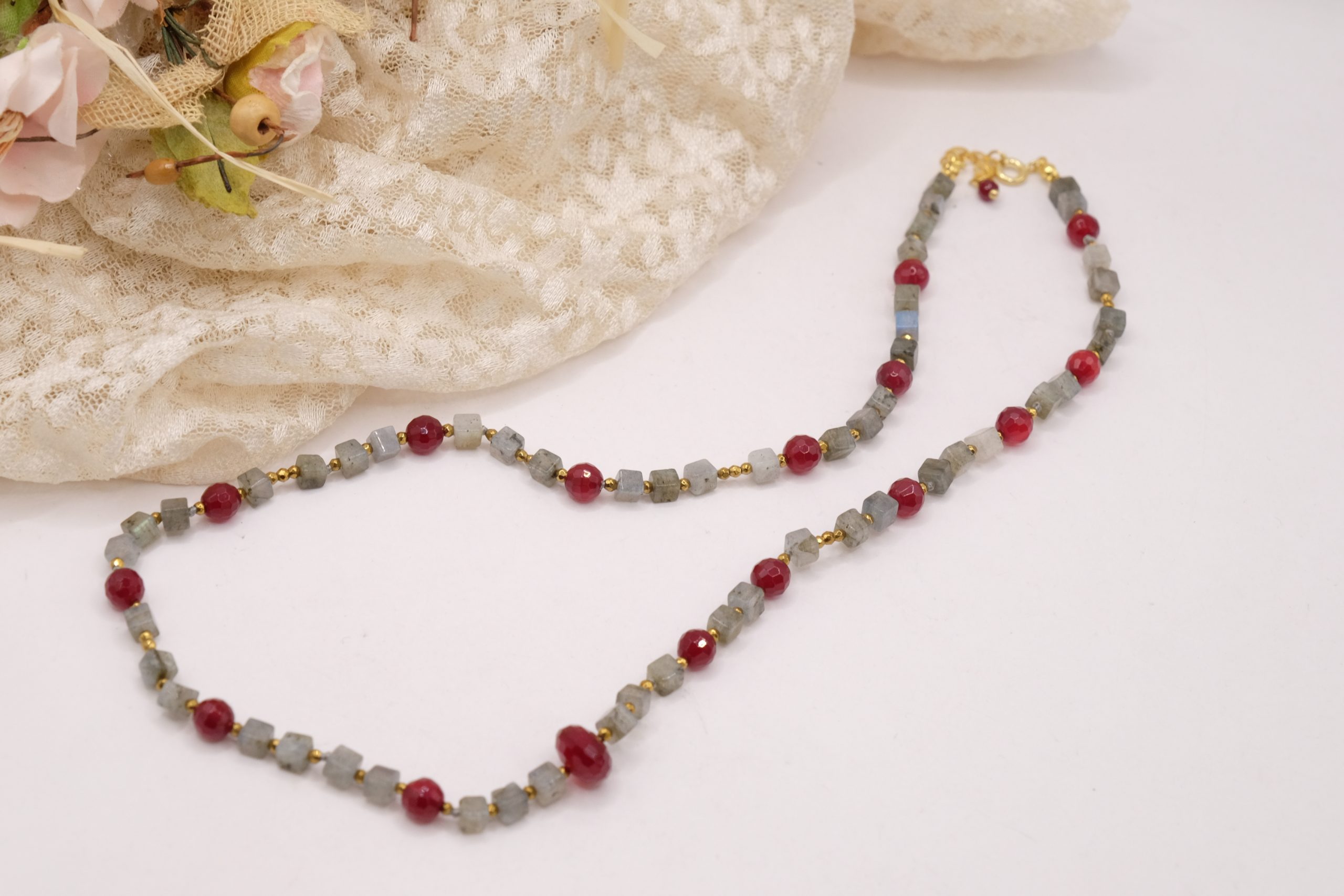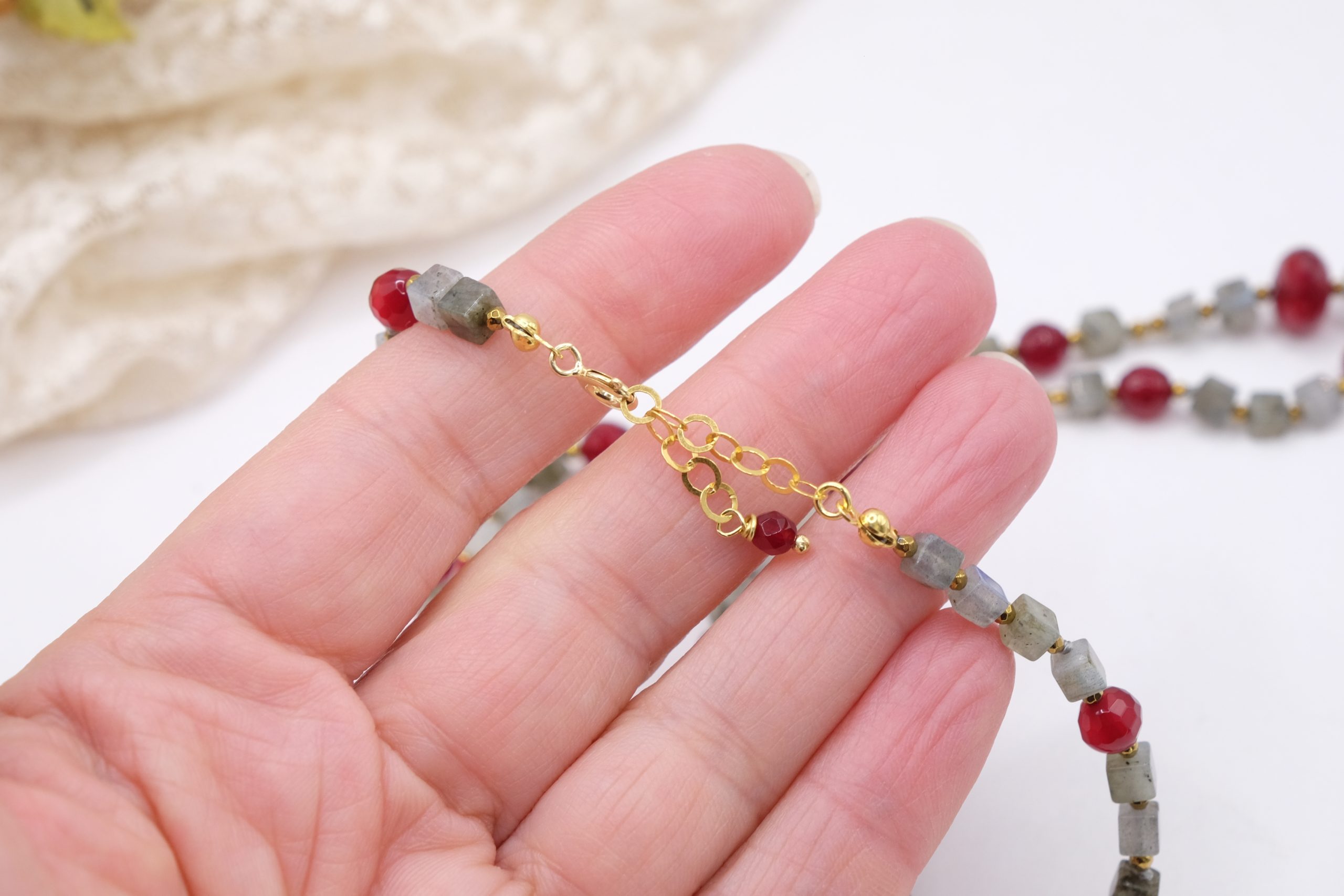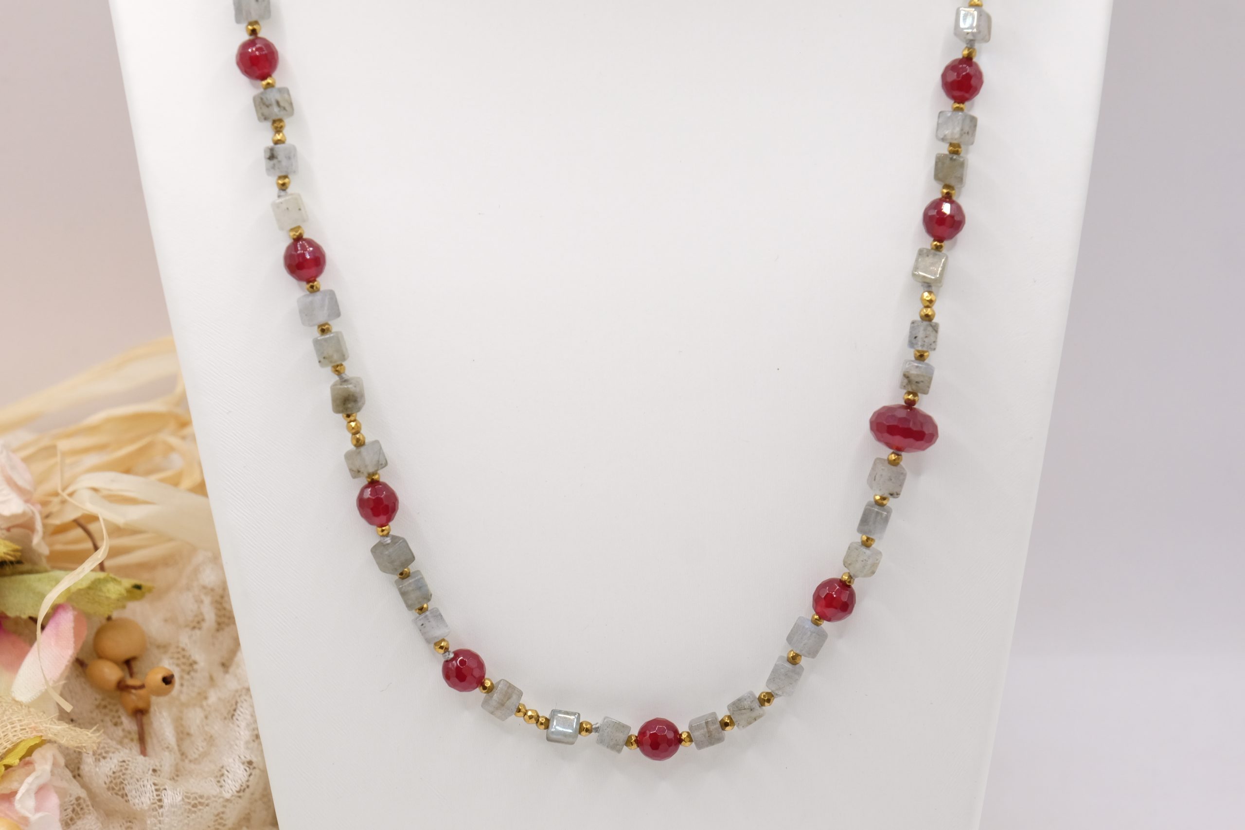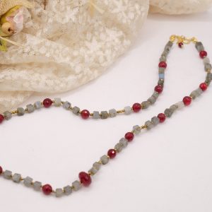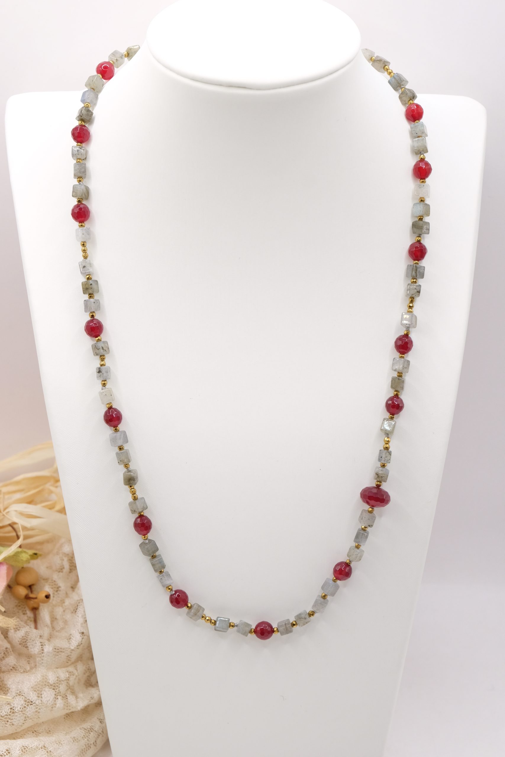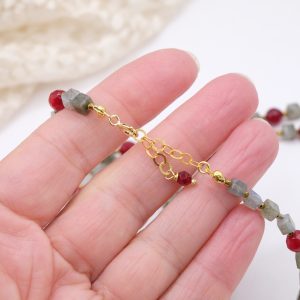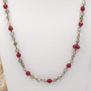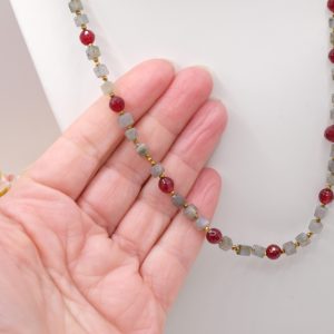 Add a touch of elegance and charm to your look with this elegant labradorite, burgundy jade, and gold hematite necklace. Gold-plated 925 silver clasp.