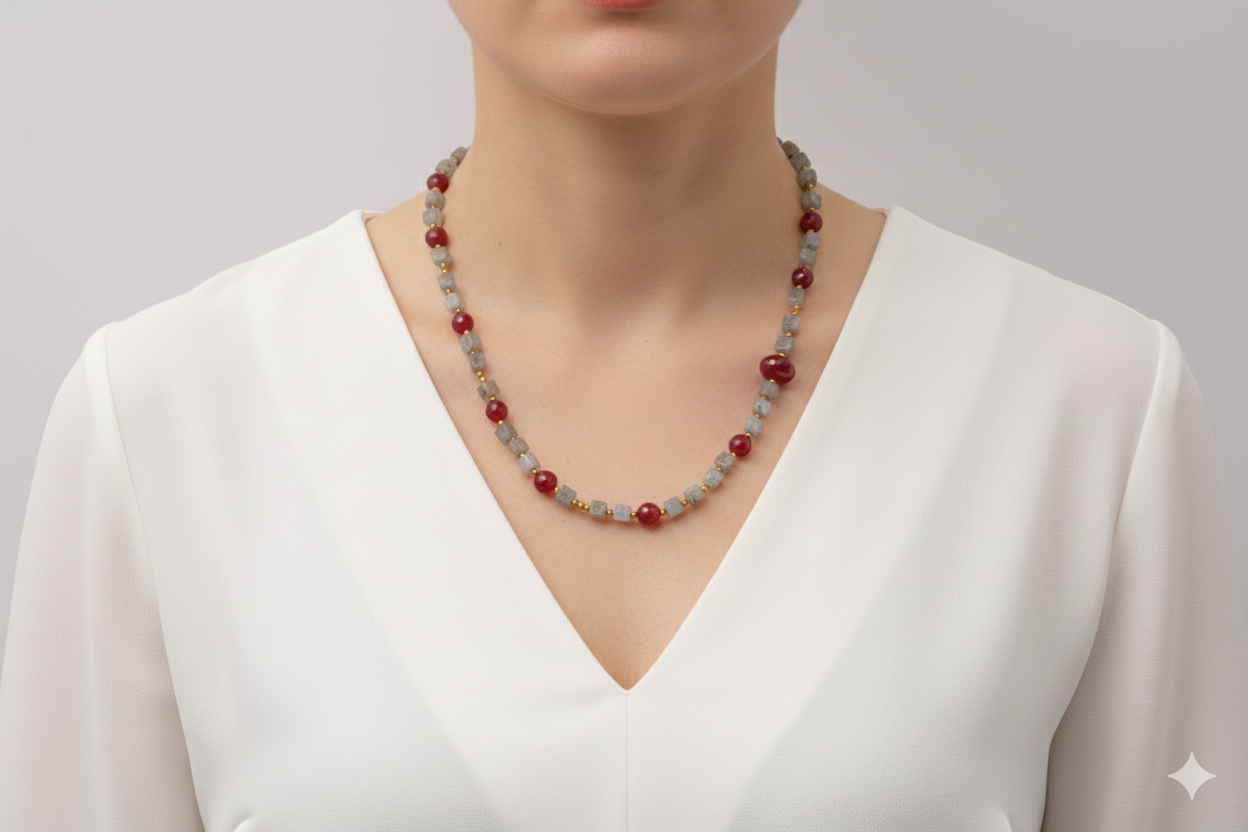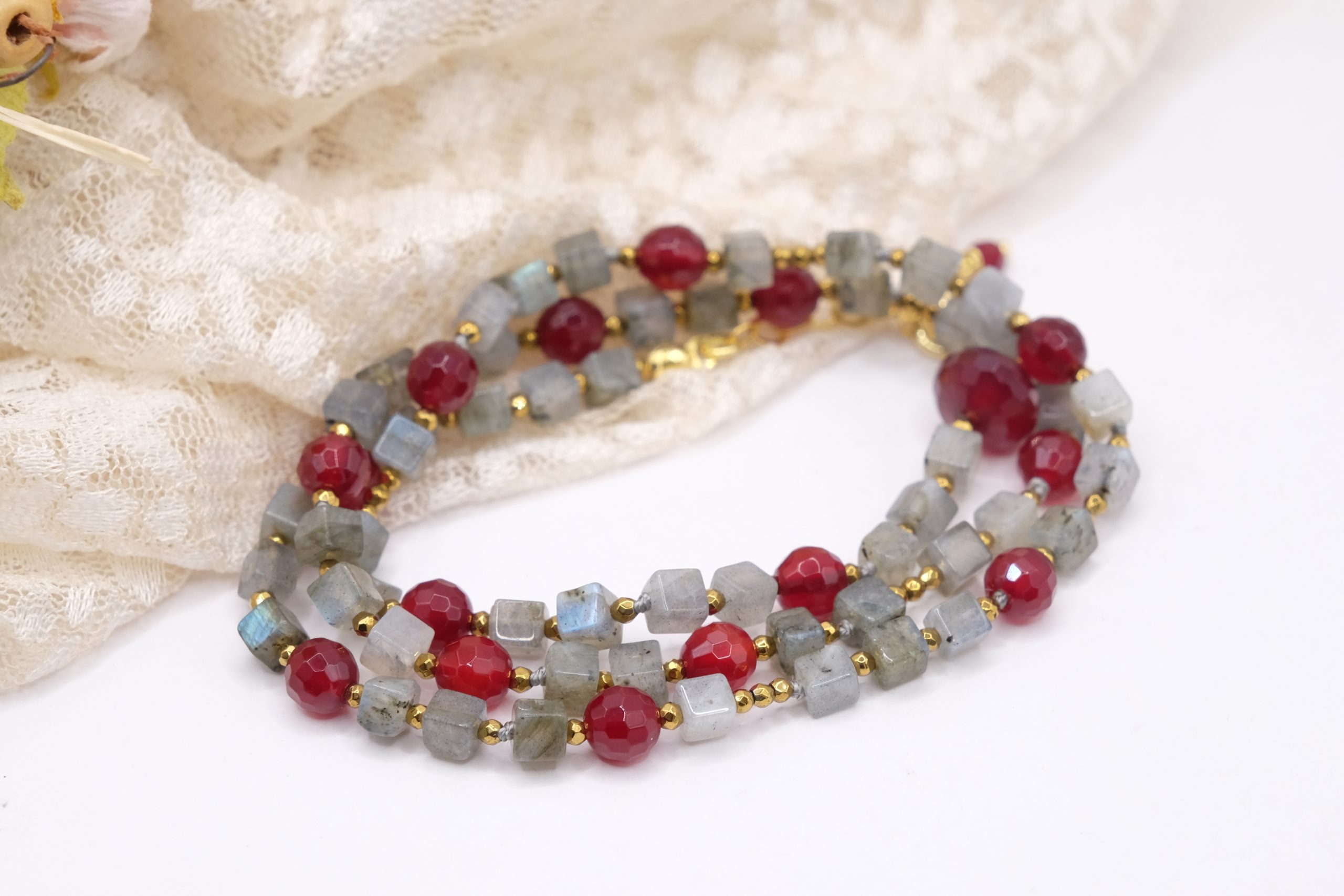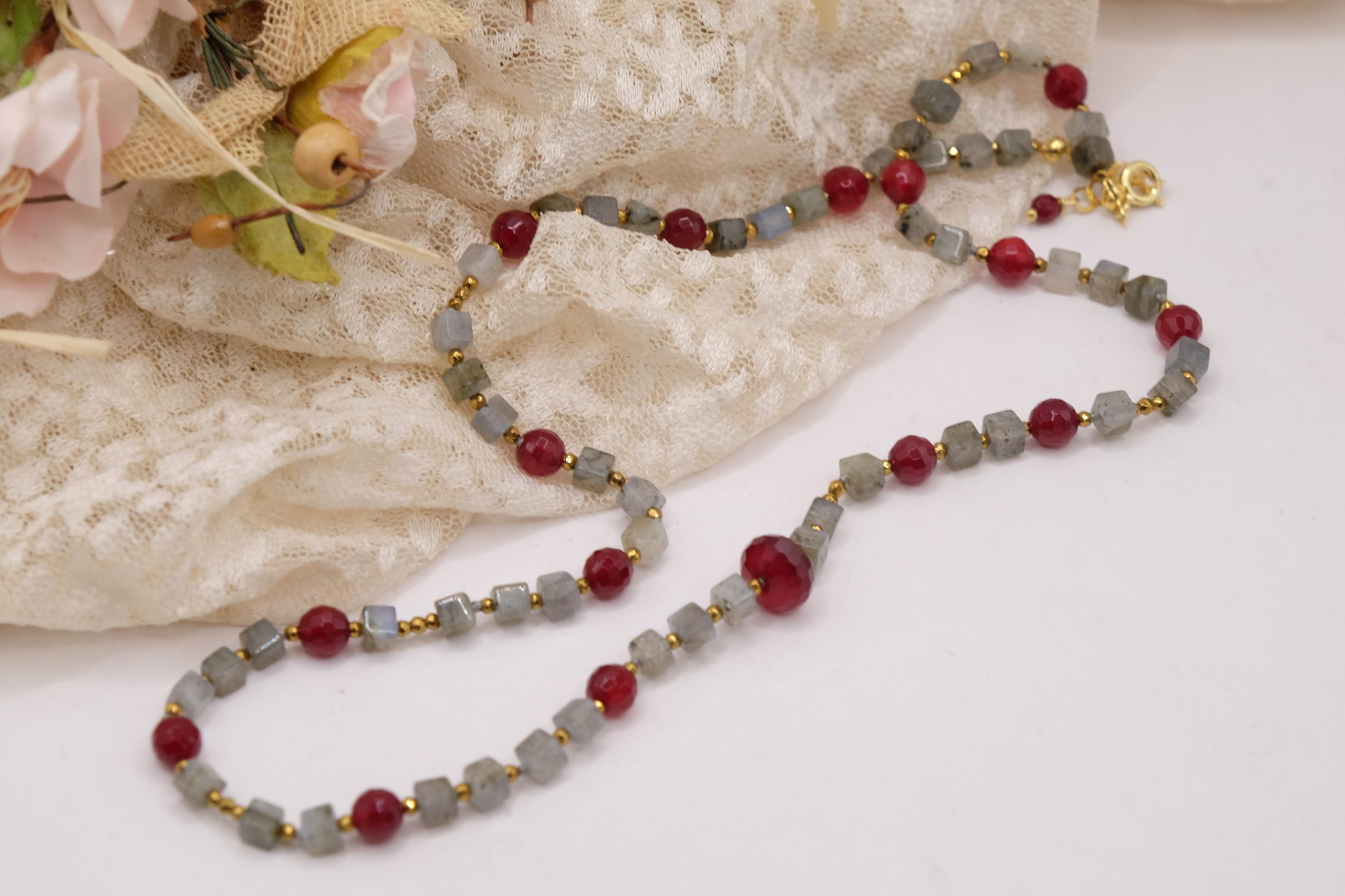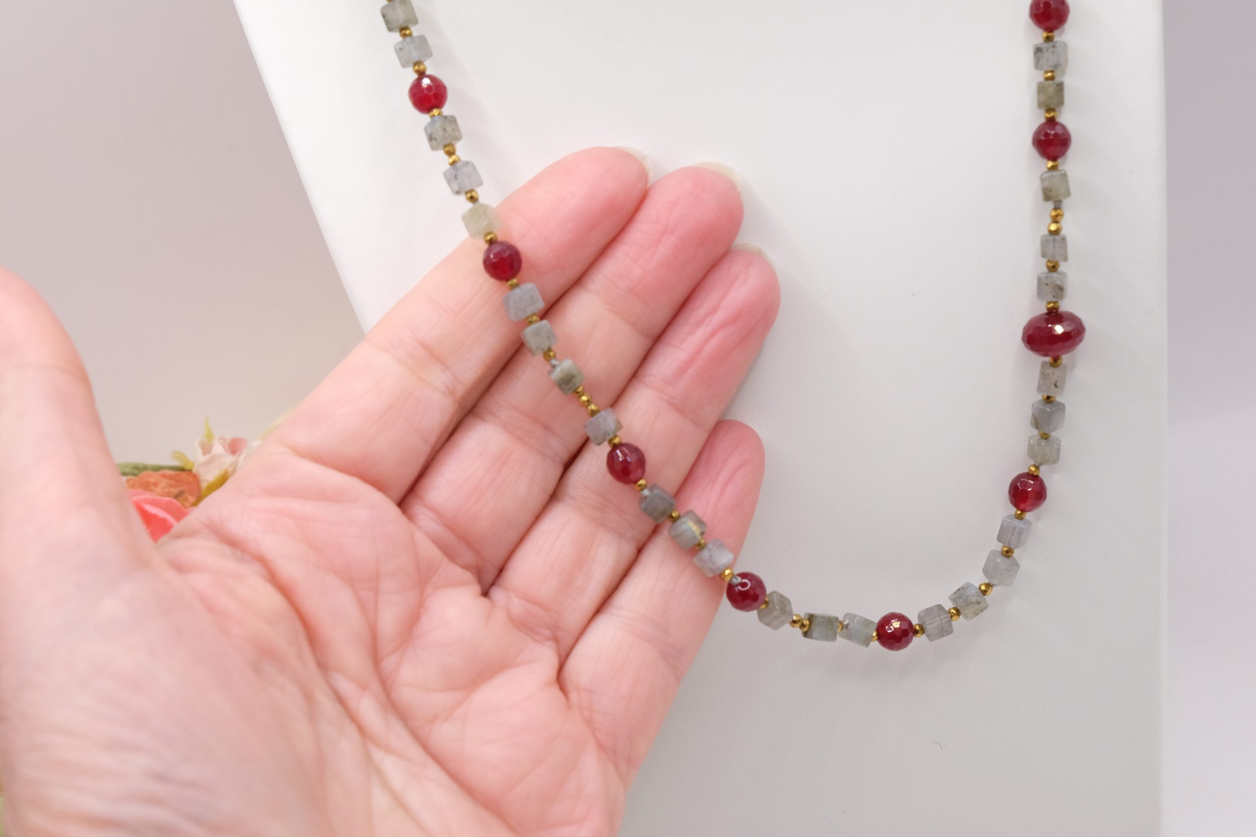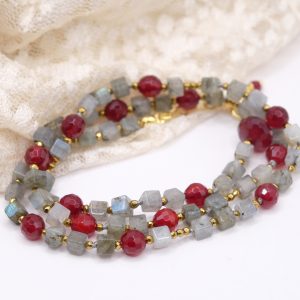 Add a touch of elegance and charm to your look with this elegant labradorite, burgundy jade, and gold hematite necklace. Gold-plated 925 silver clasp.