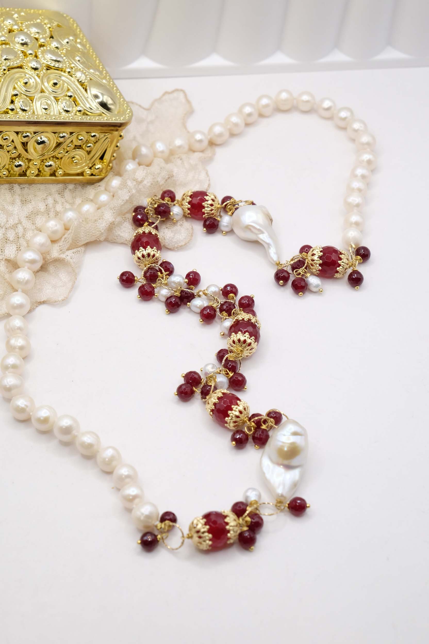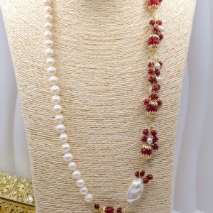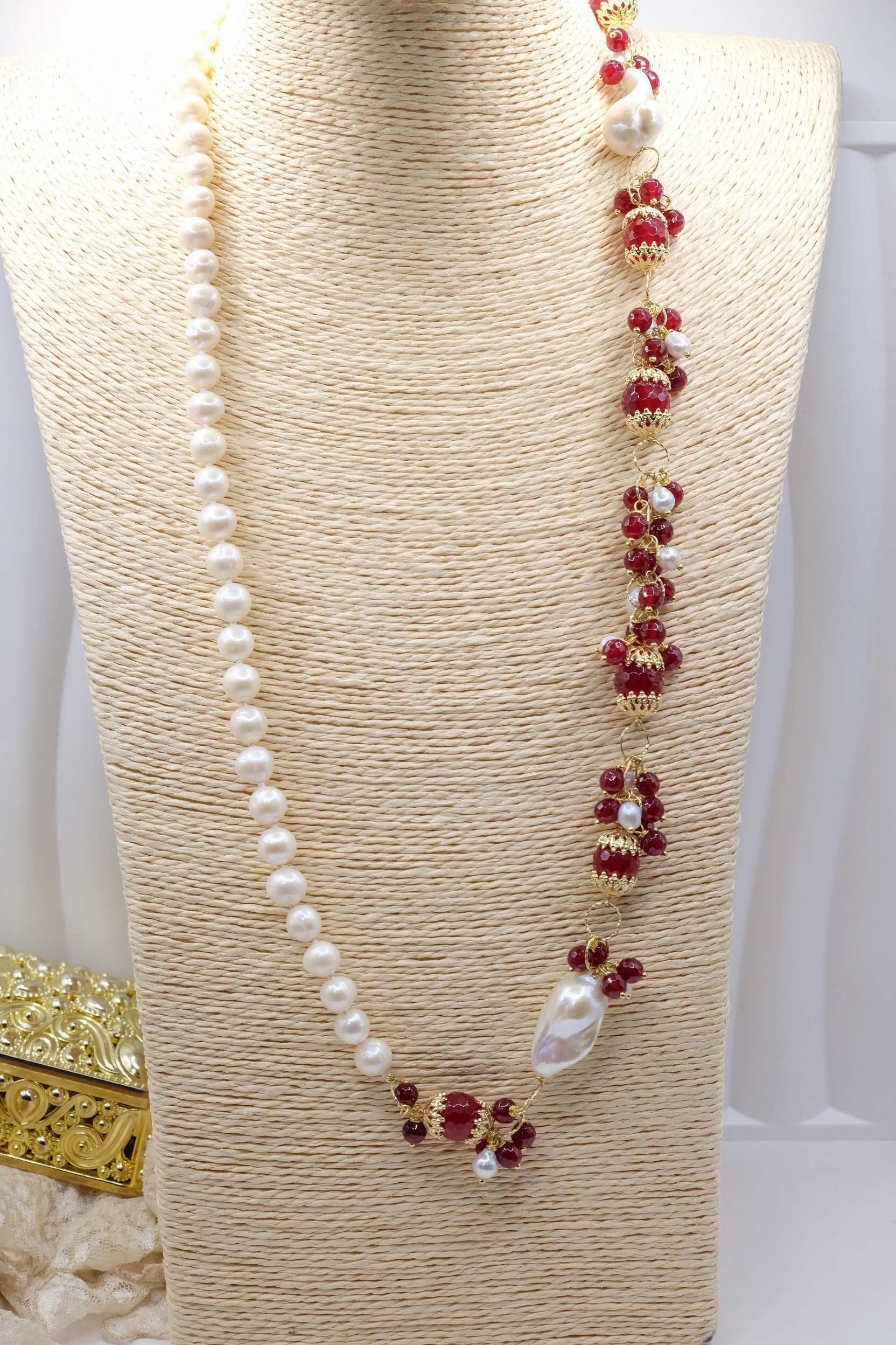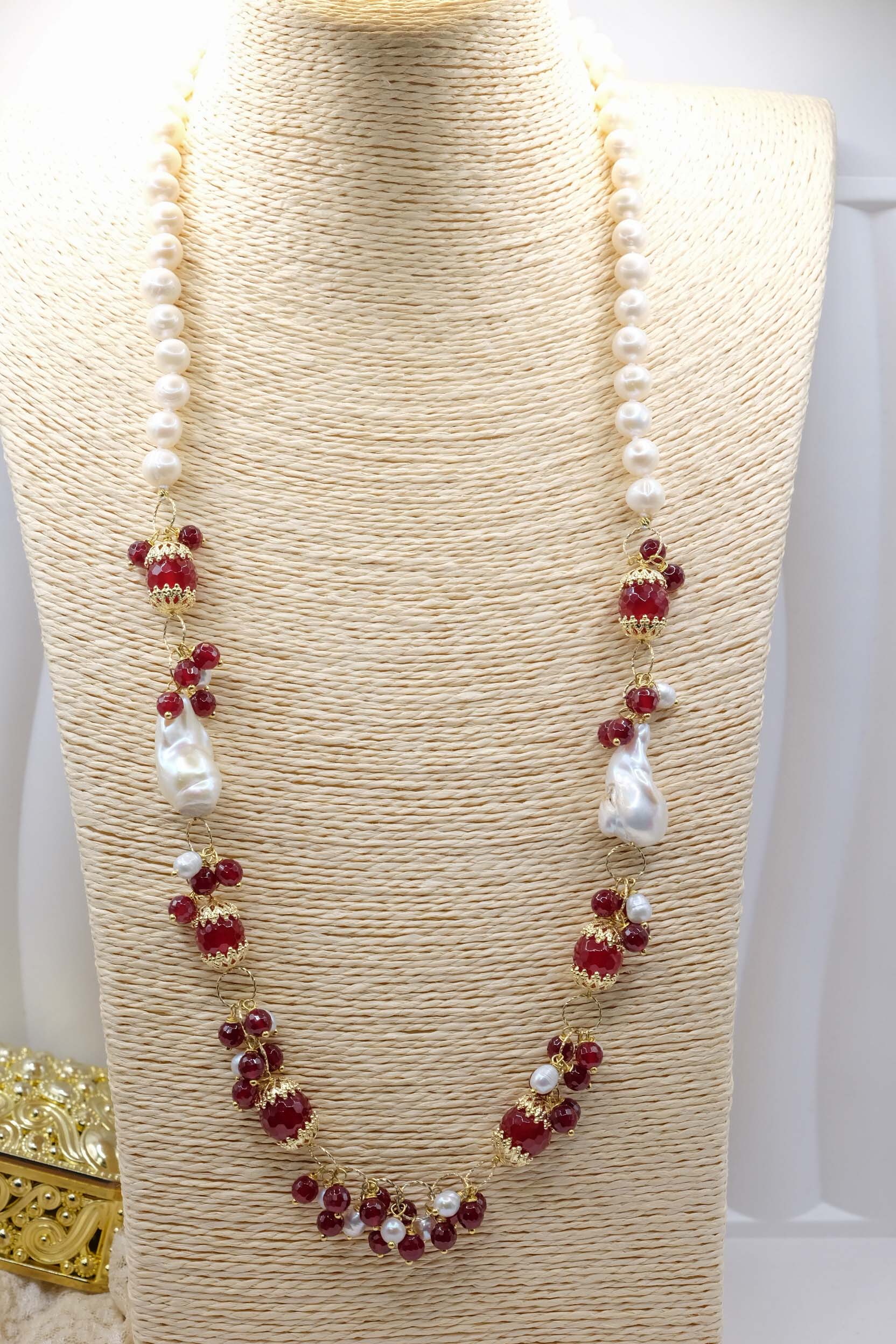 Versatile collana per le clienti super chic, molto lunga ben 74 cm, realizzata per metà da perle naturali da 9/10 mm di ottima qualità e grappoli di giada borgogna e perle