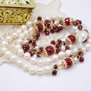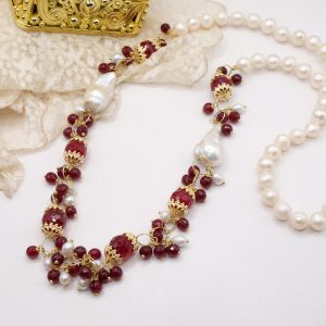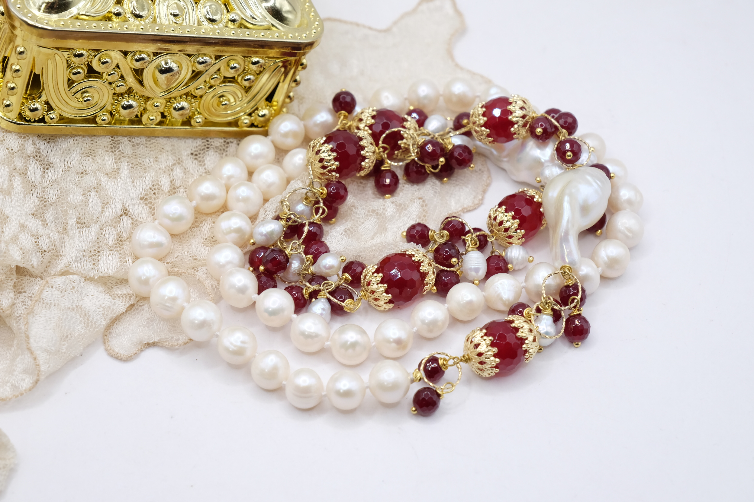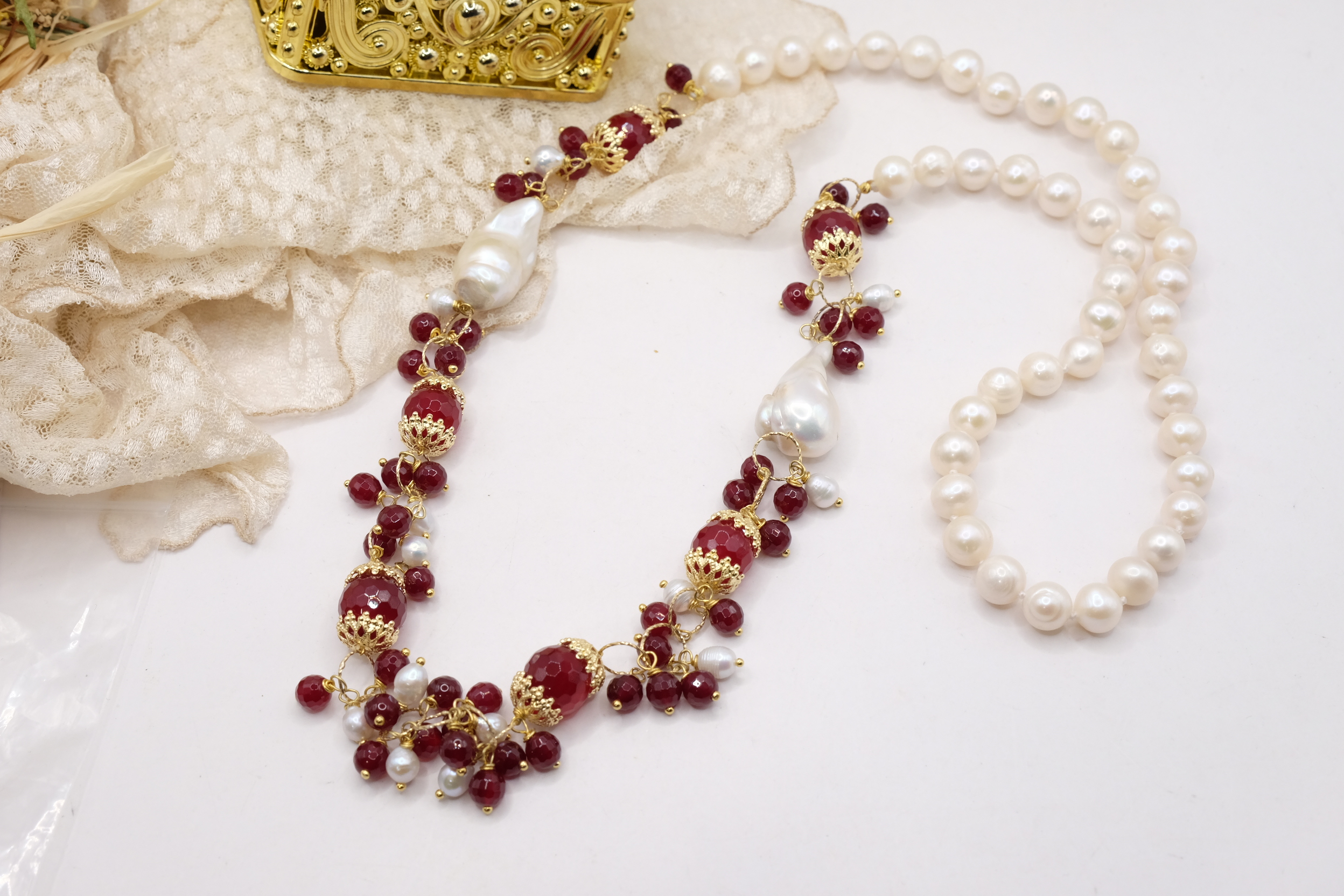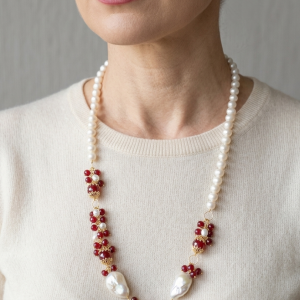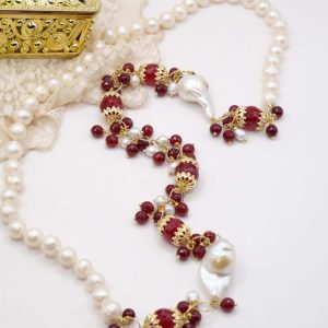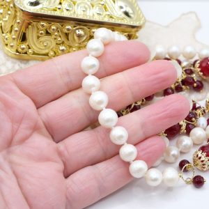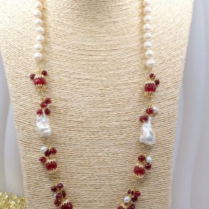 Versatile collana per le clienti super chic, molto lunga ben 74 cm, realizzata per metà da perle naturali da 9/10 mm di ottima qualità e grappoli di giada borgogna e perle