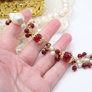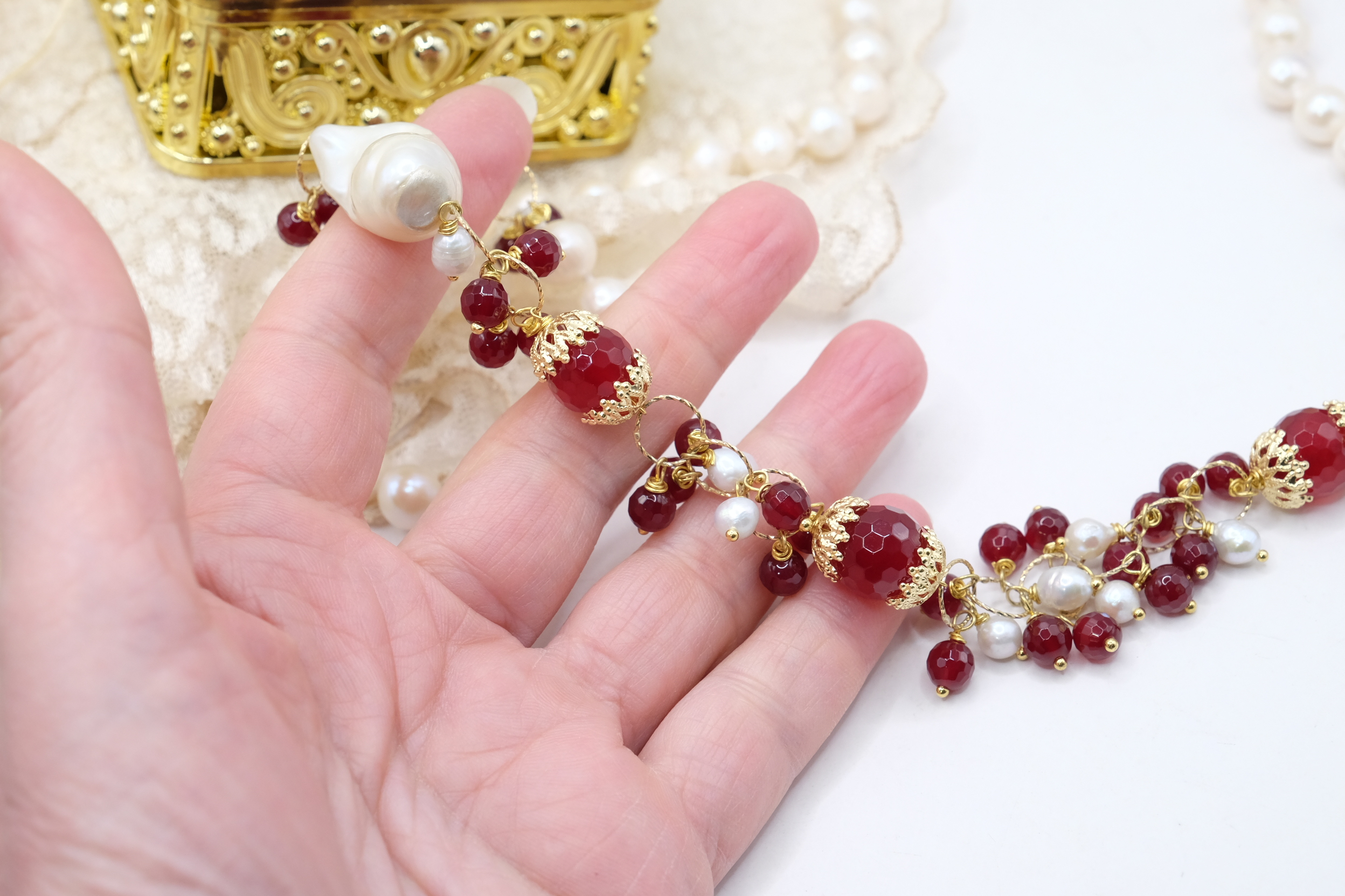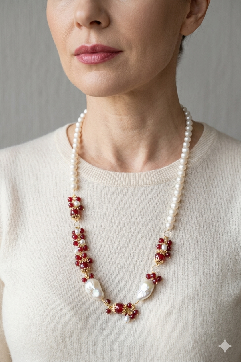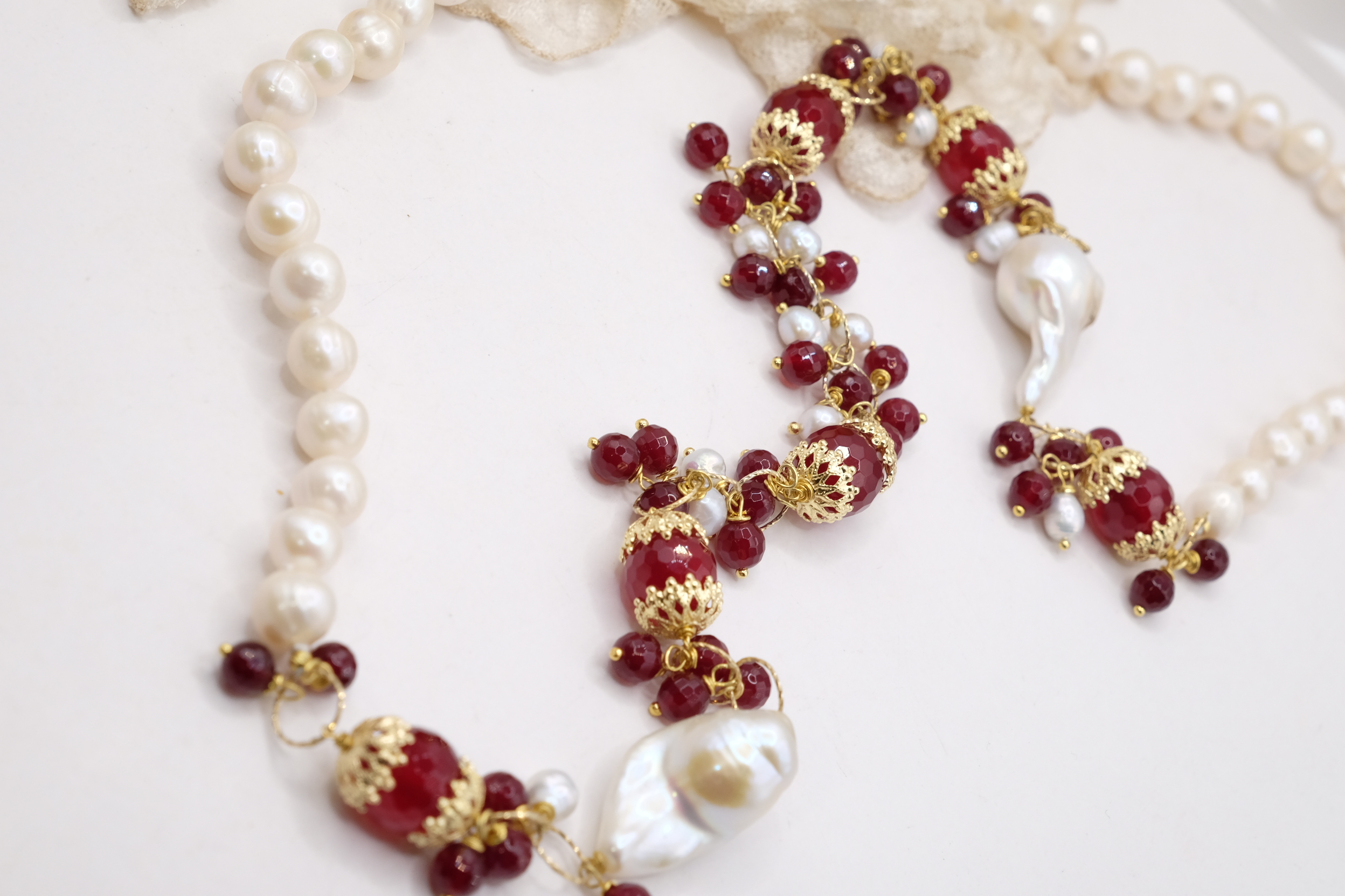 Long Pearl Necklace with Burgundy Jade Clusters and Silver