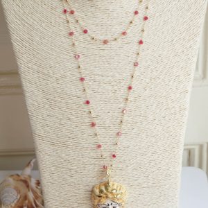 Precious necklace, entirely handmade, with long steel chain with red crystals