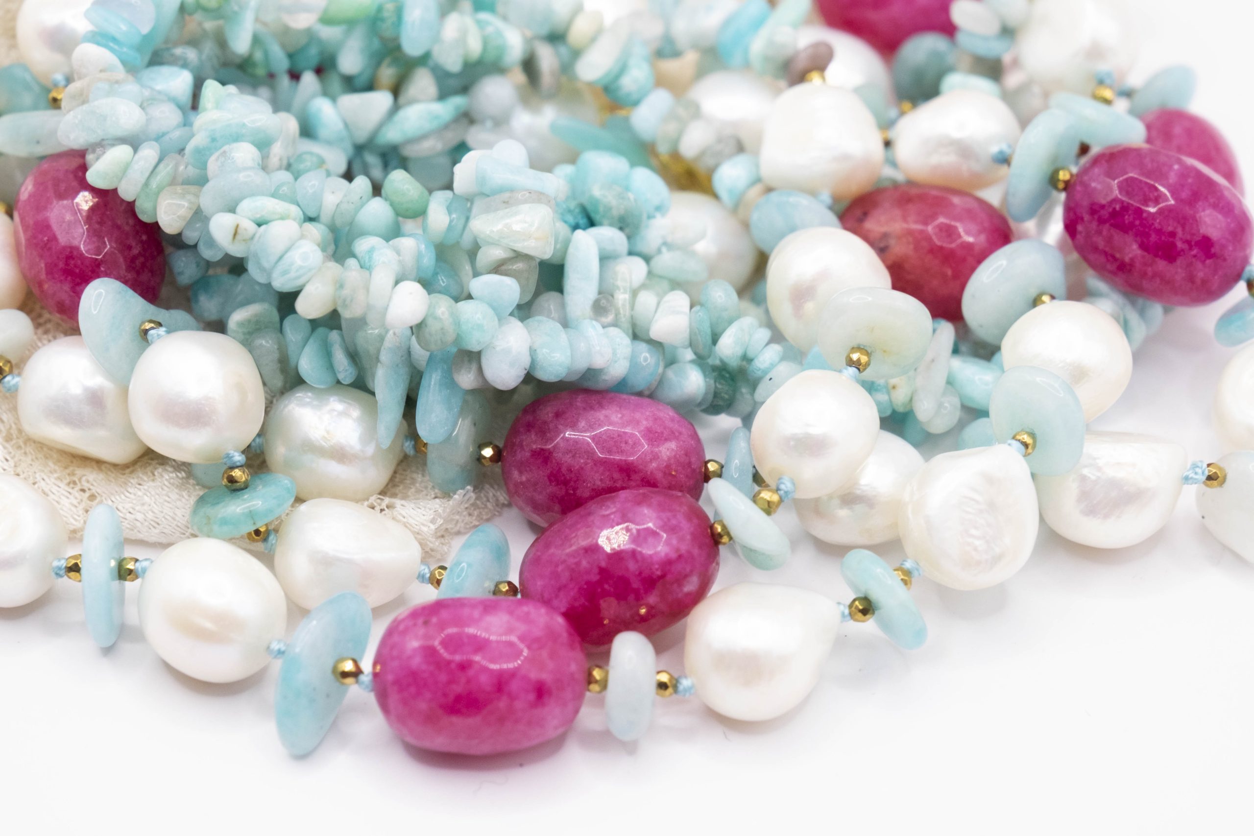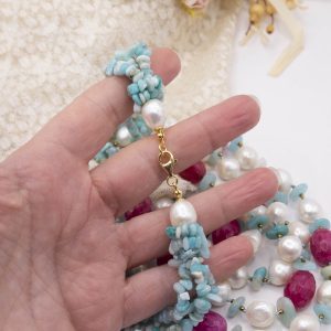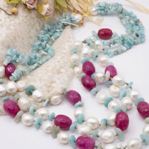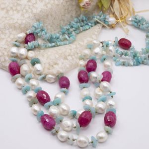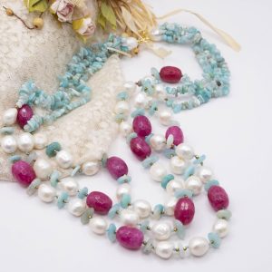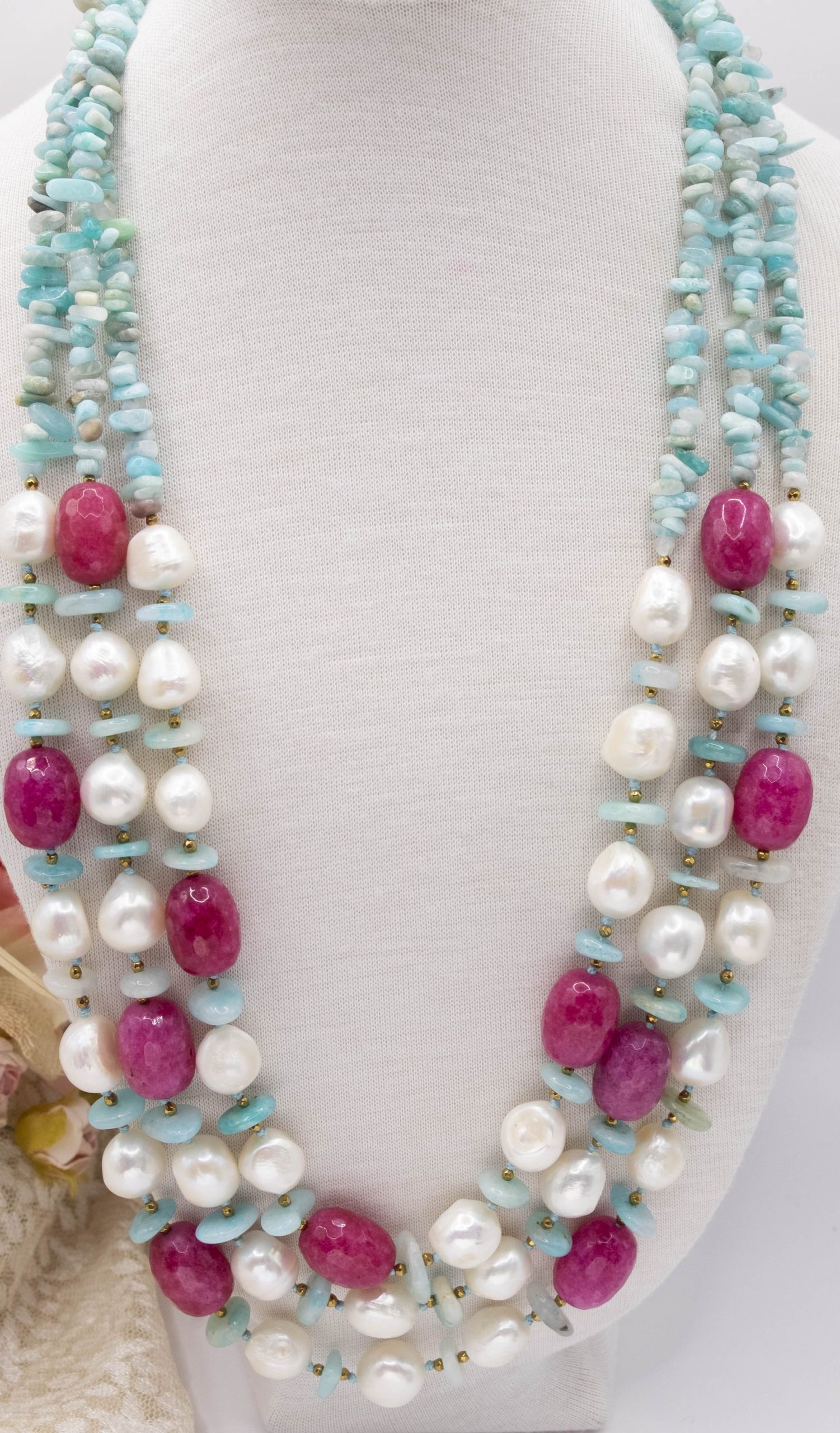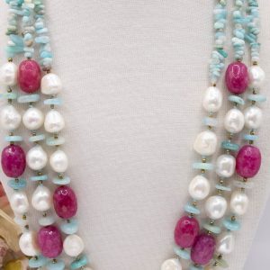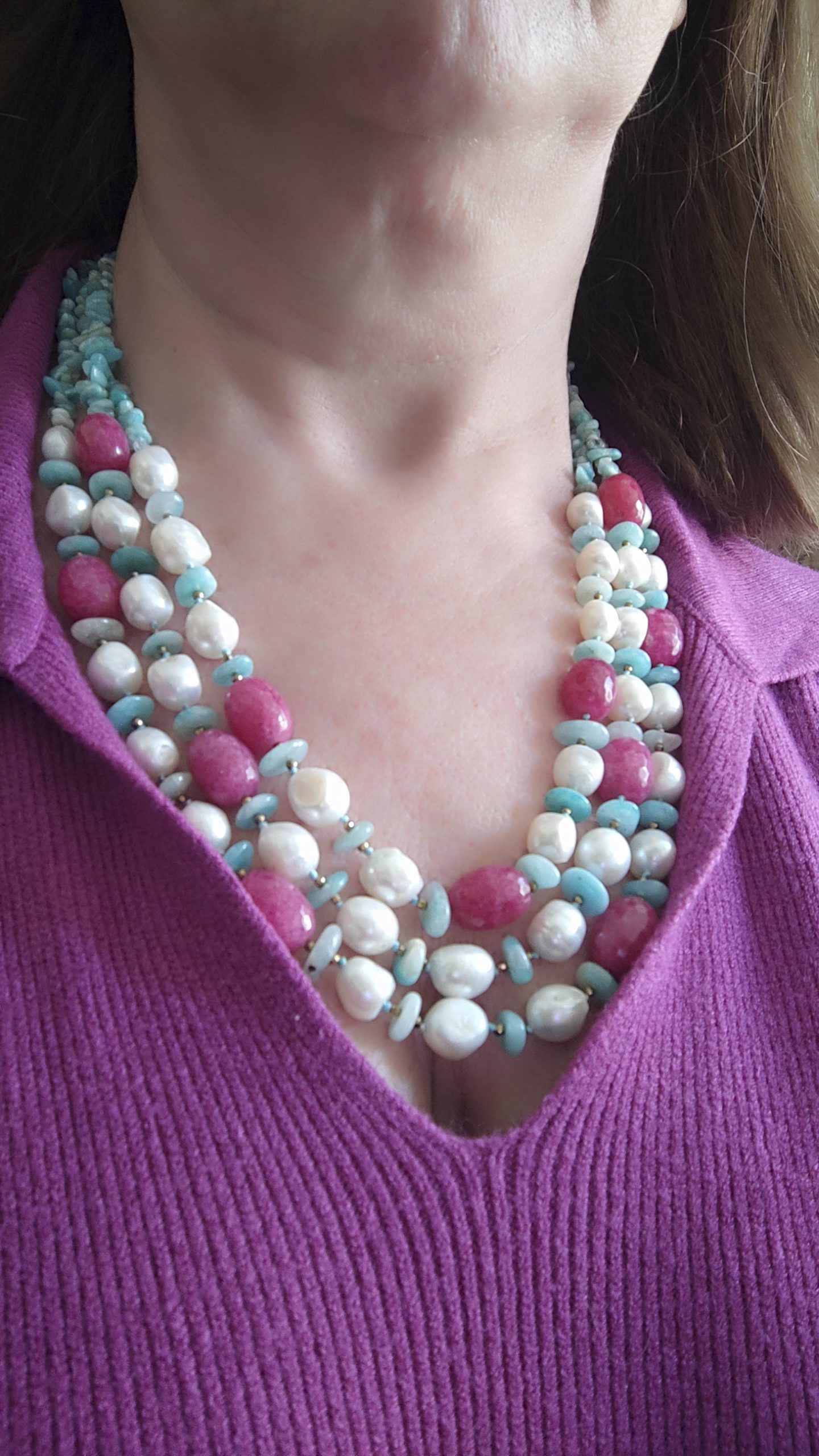 3-row necklace of natural amazonite, fuchsia jade, hematite and natural baroque pearls.