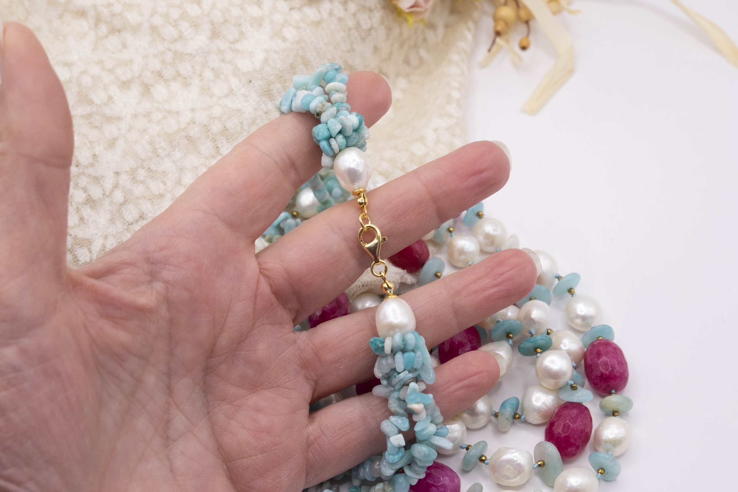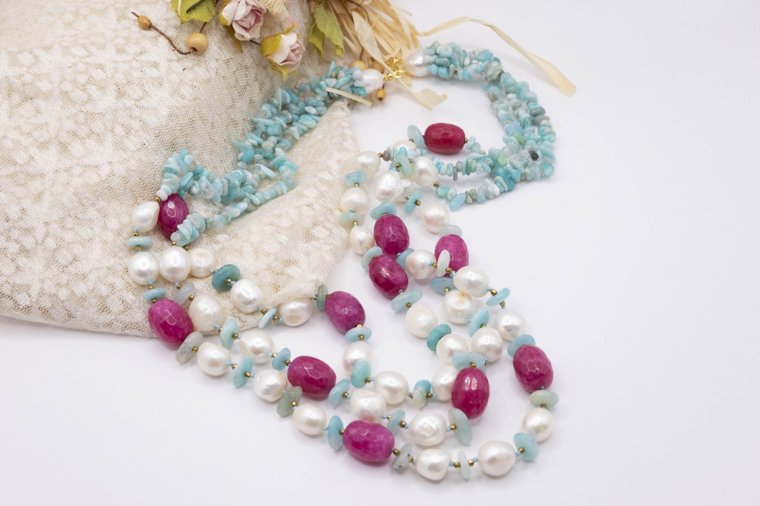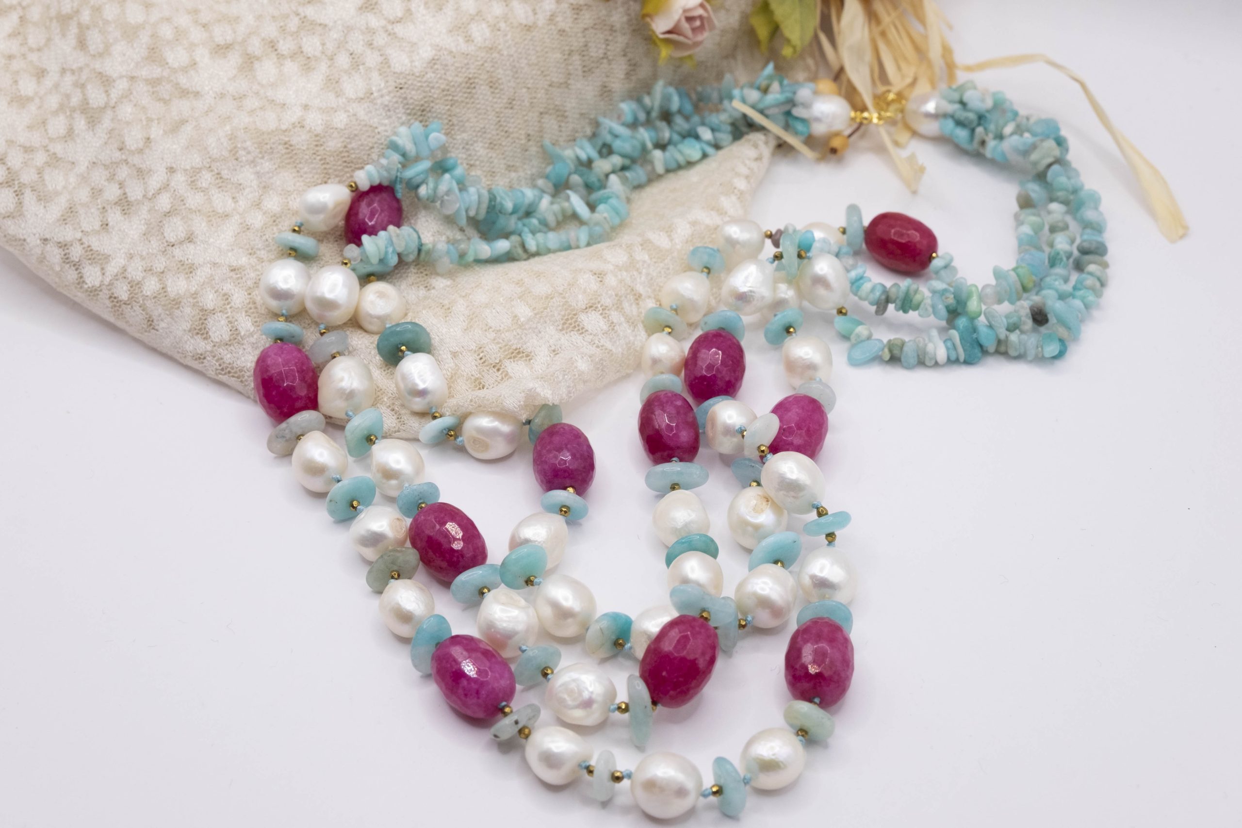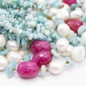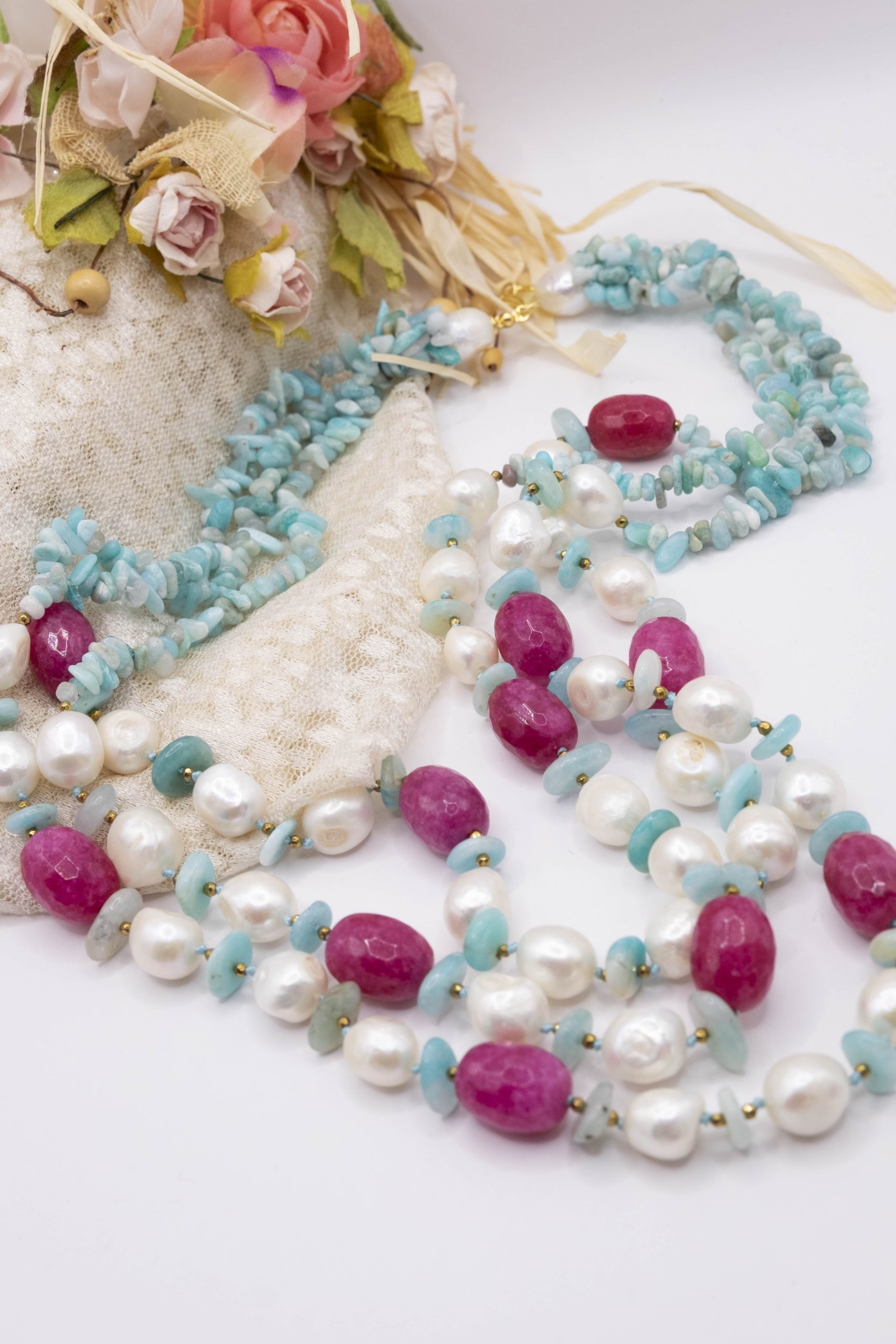 3-row necklace of natural amazonite, fuchsia jade, hematite and natural baroque pearls.
