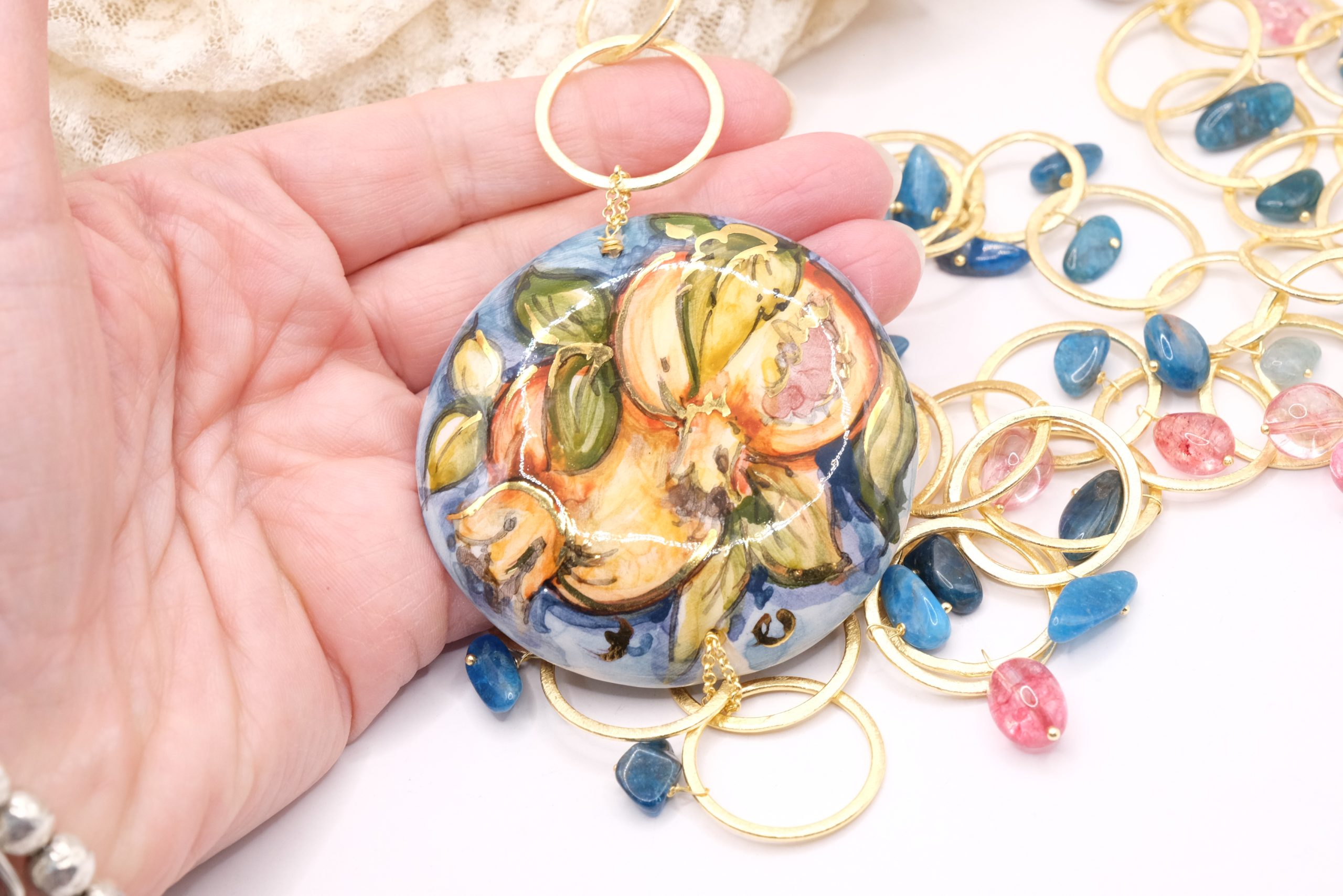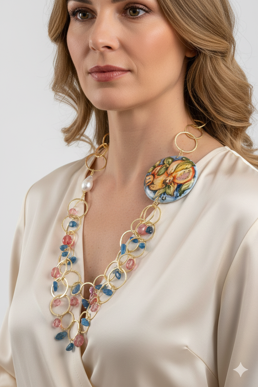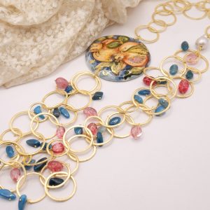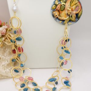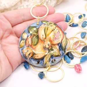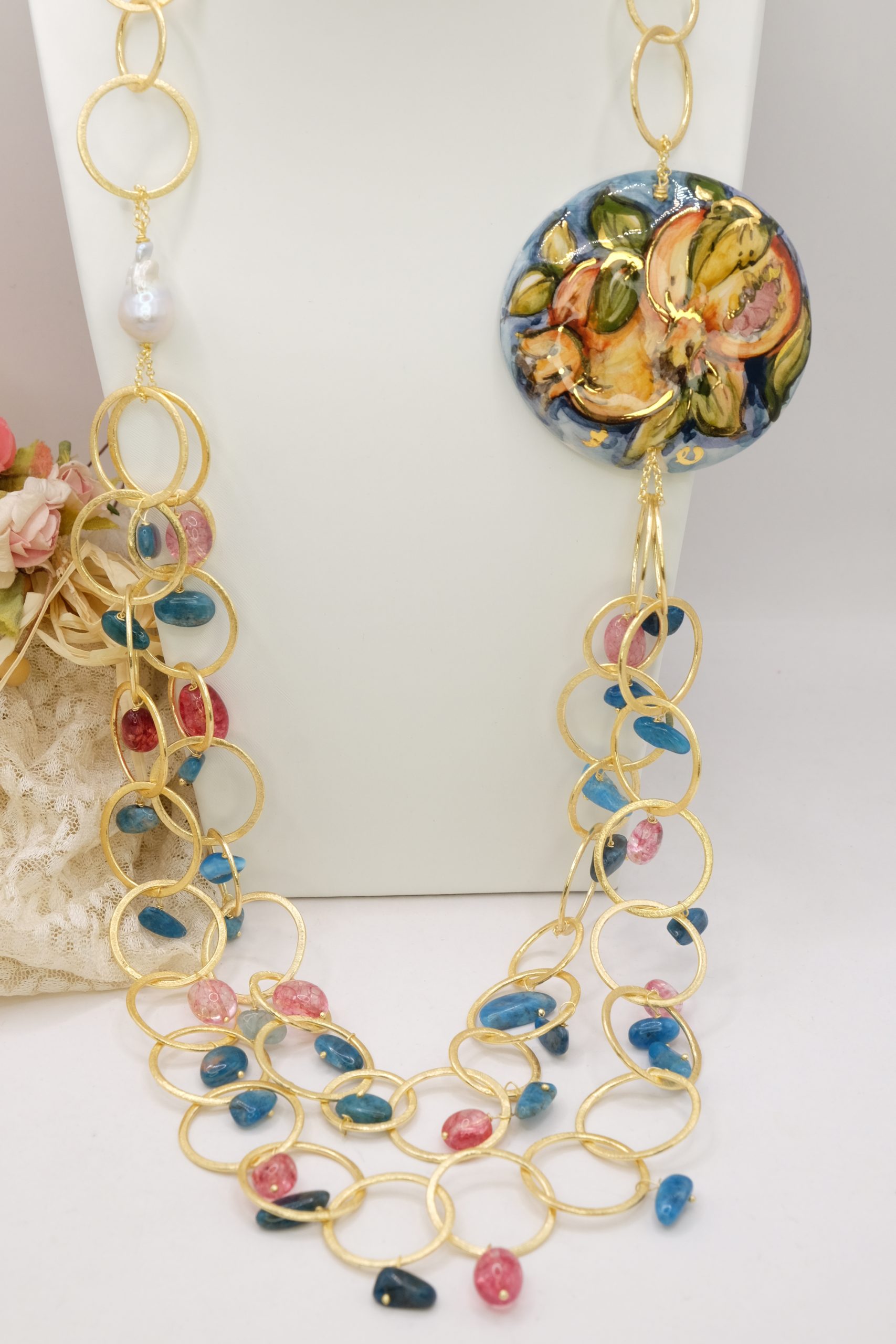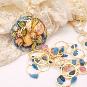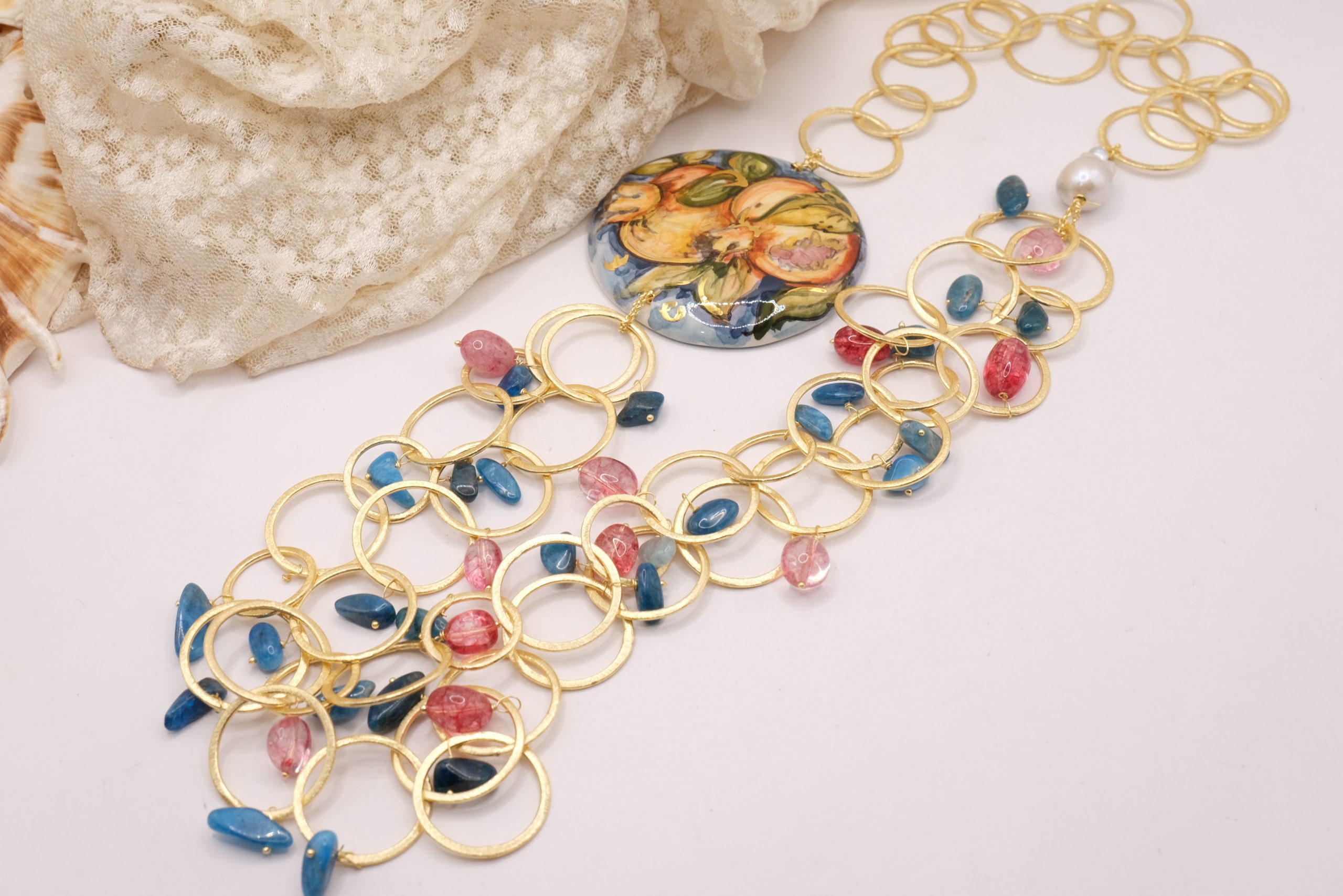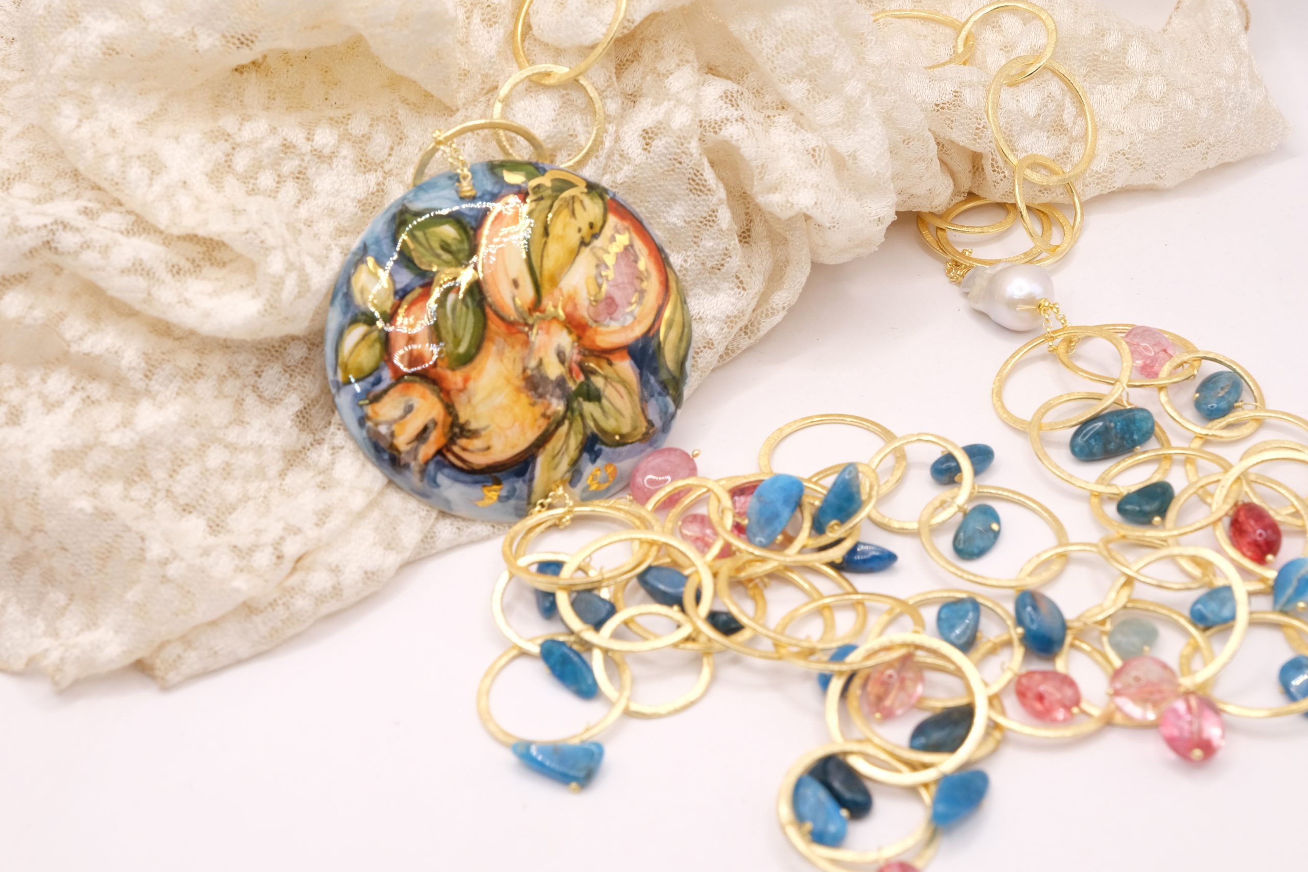 entirely handmade, with a Caltagirone ceramic plate, finely hand-decorated with pure gold and many pendants in blue and red tourmalines and a baroque pearl on the side