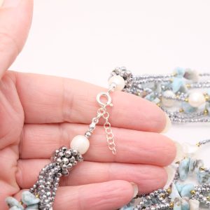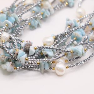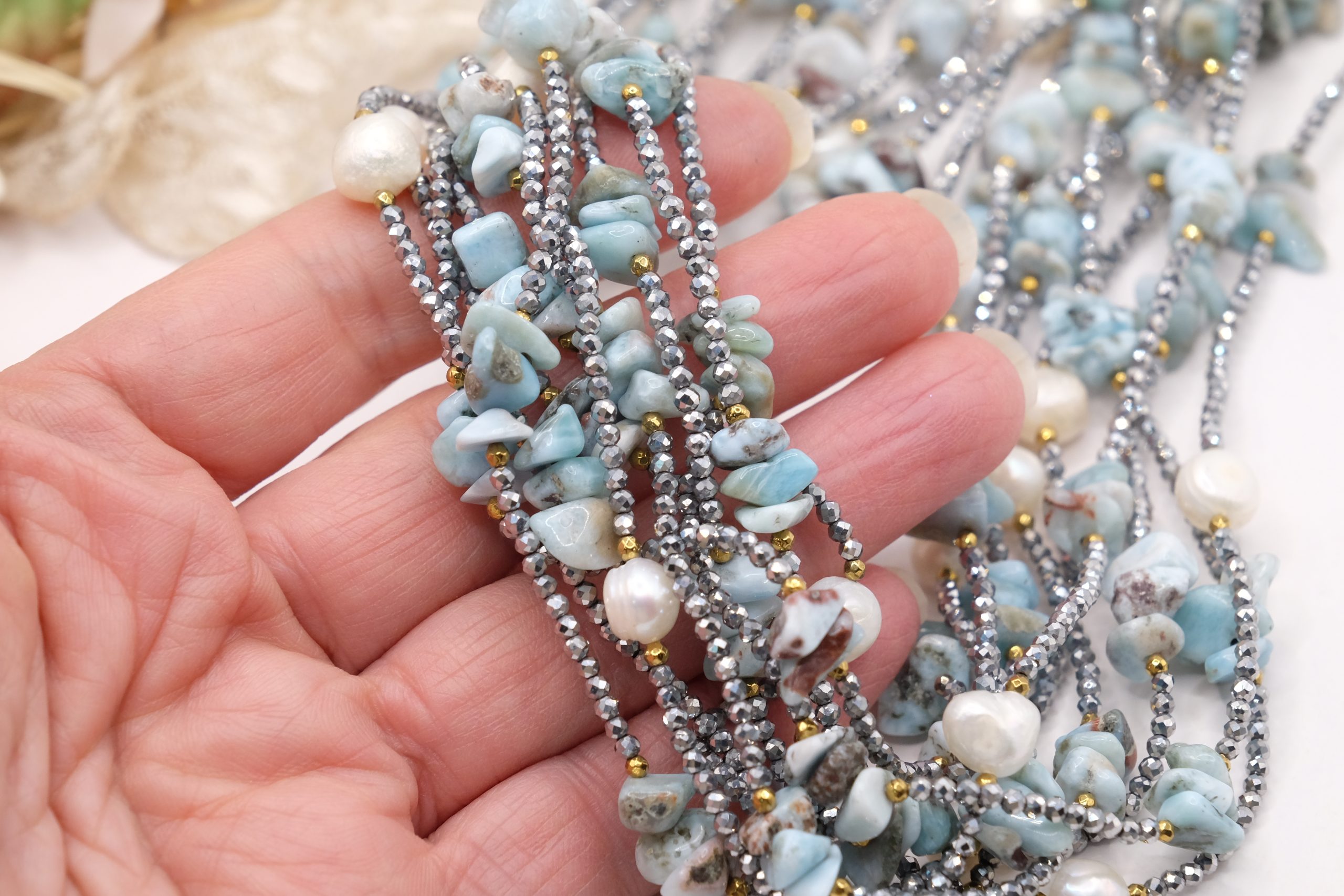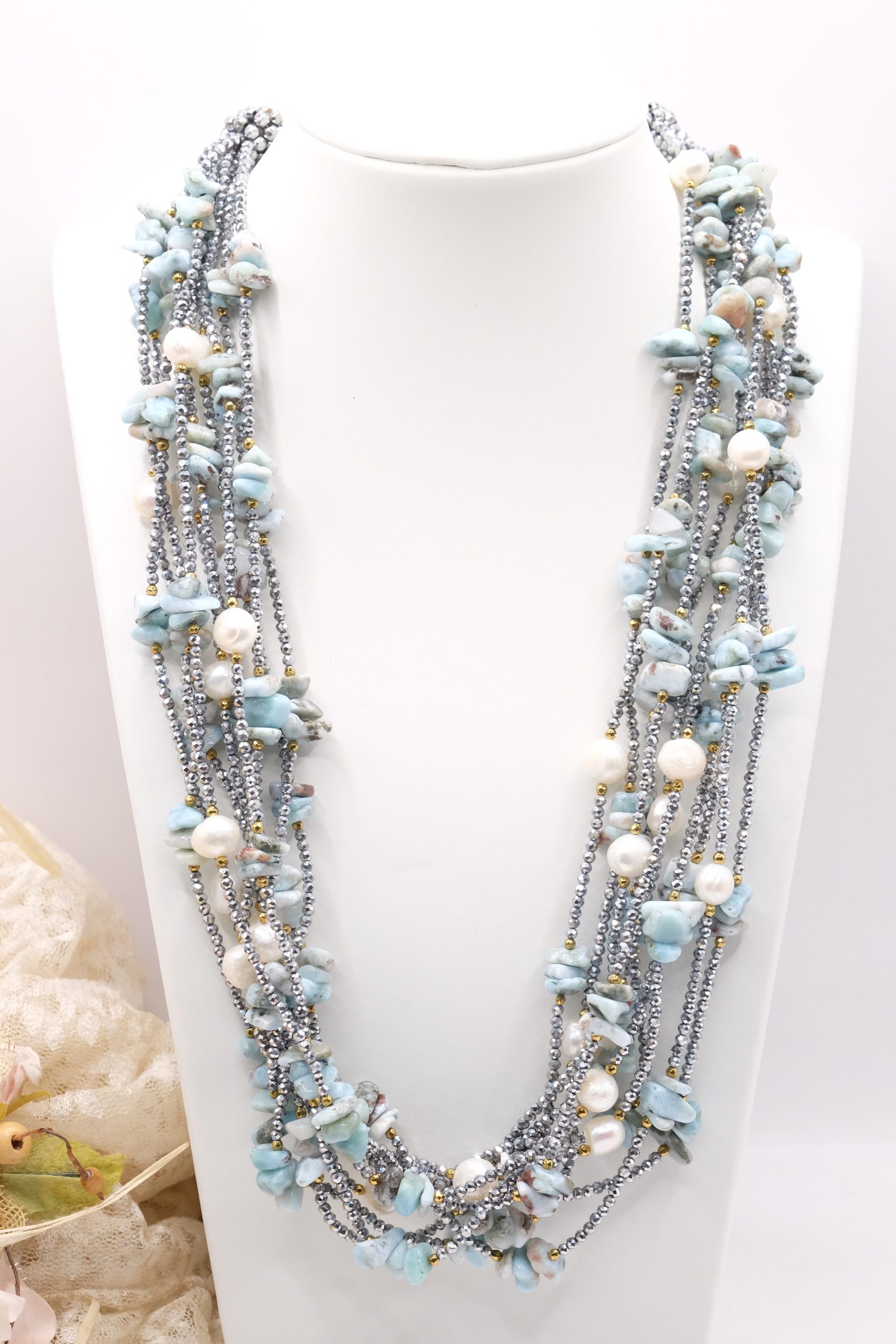 Multi-strand Larimar Pearl Zircon Necklace 925 Silver