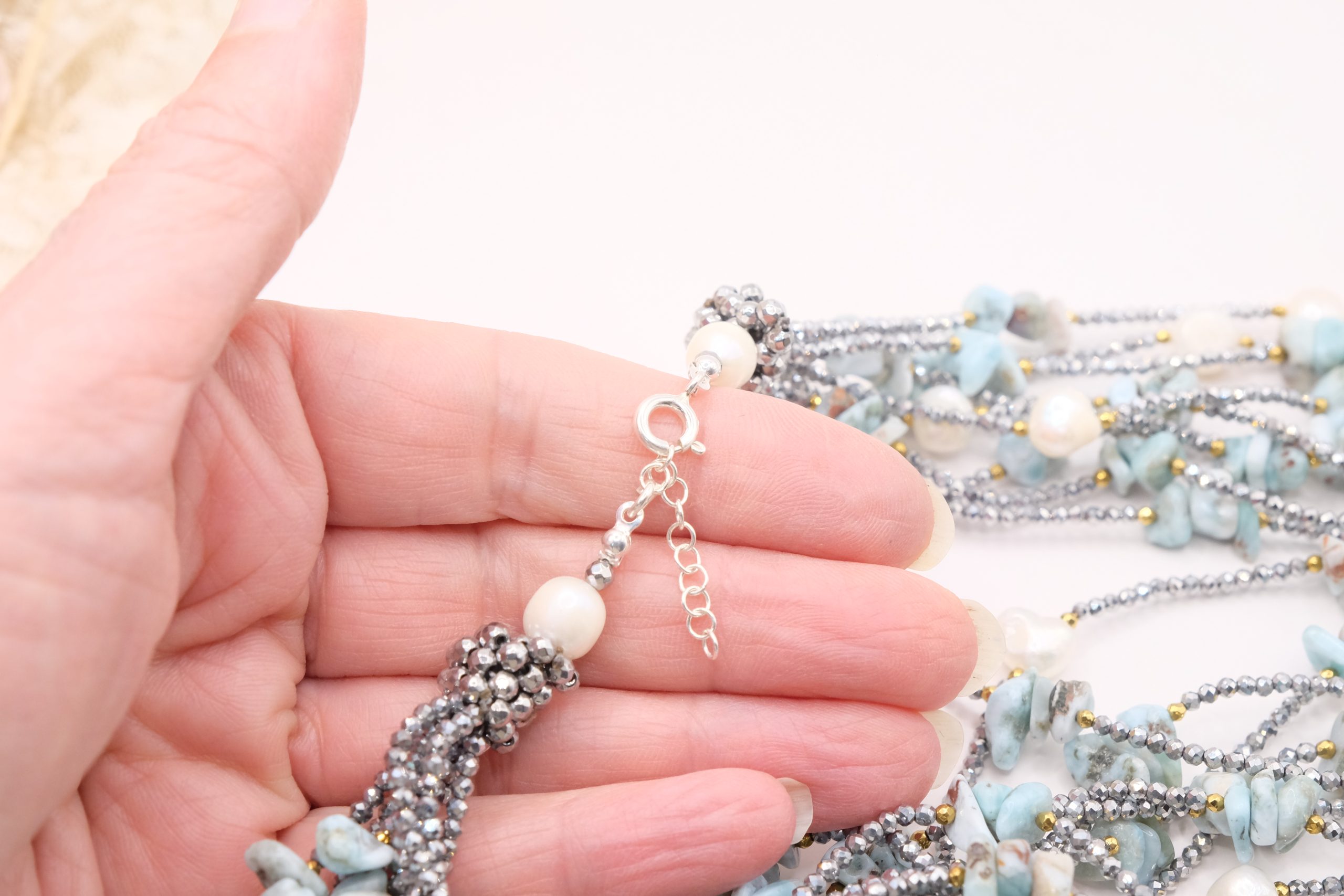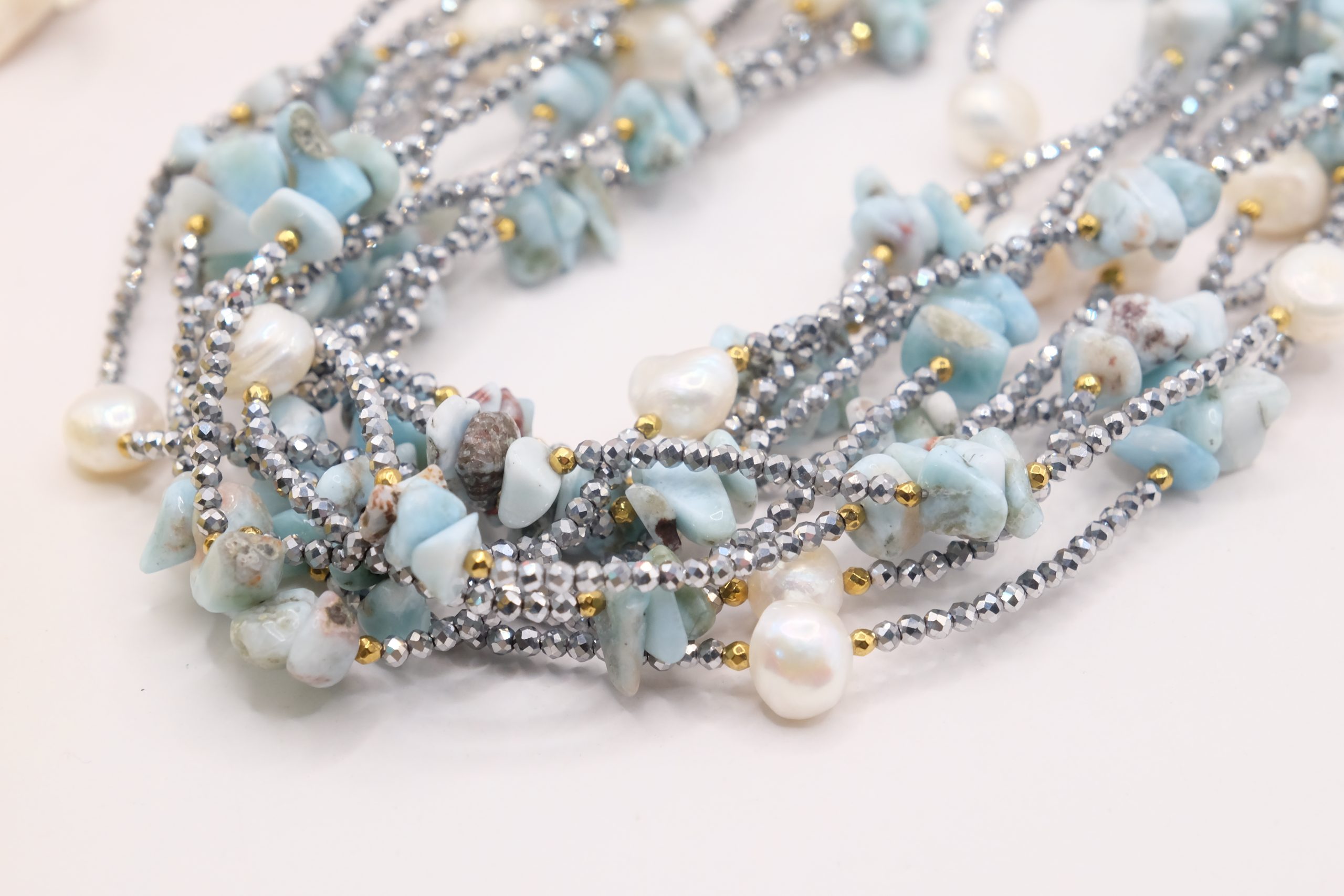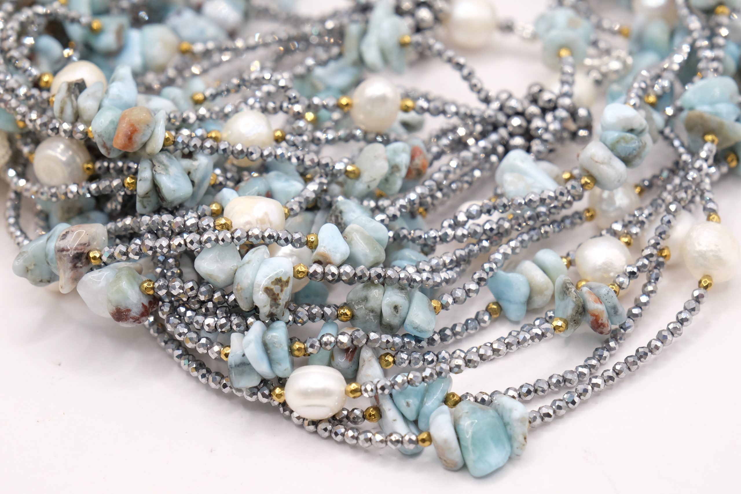 Stunning and elegant handcrafted multi-strand necklace (10 strands) in high quality silver zirconia alternating with larimar and natural pearls