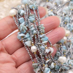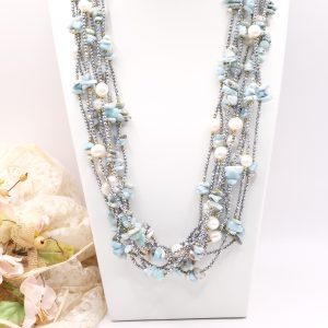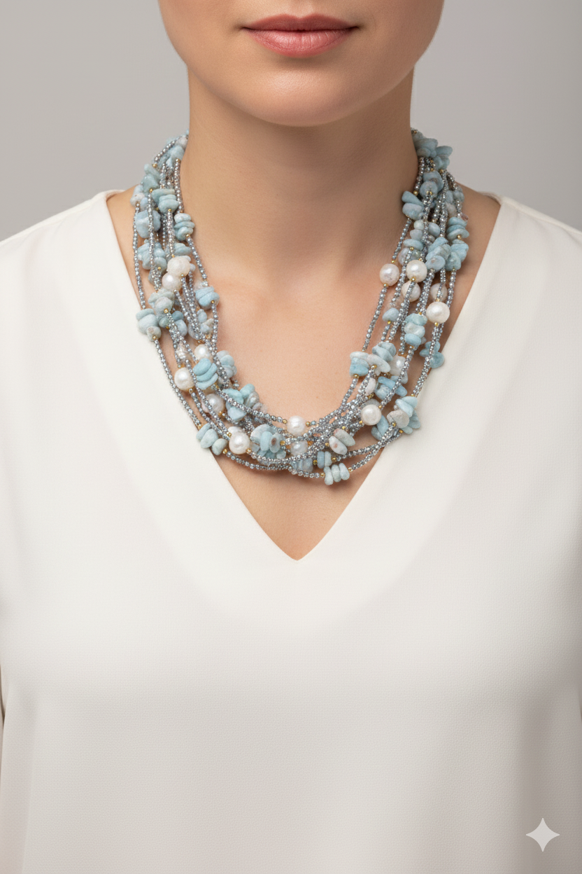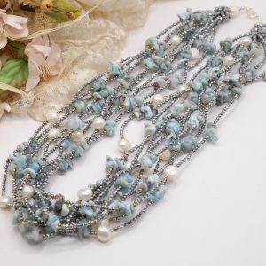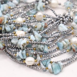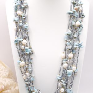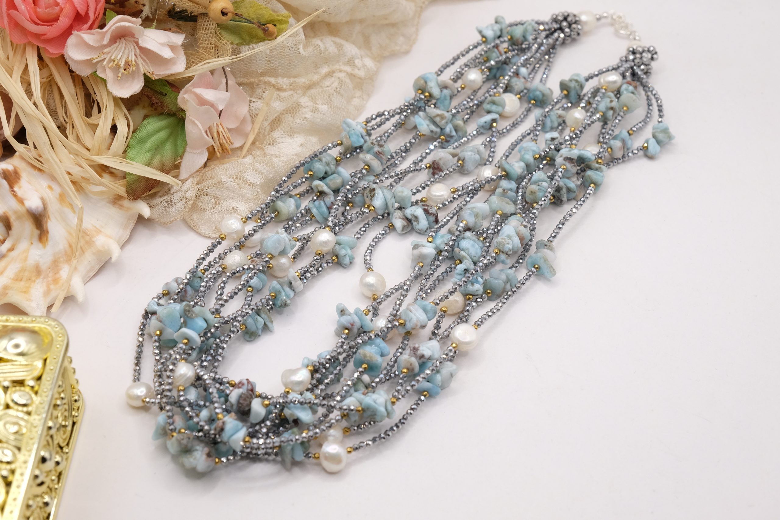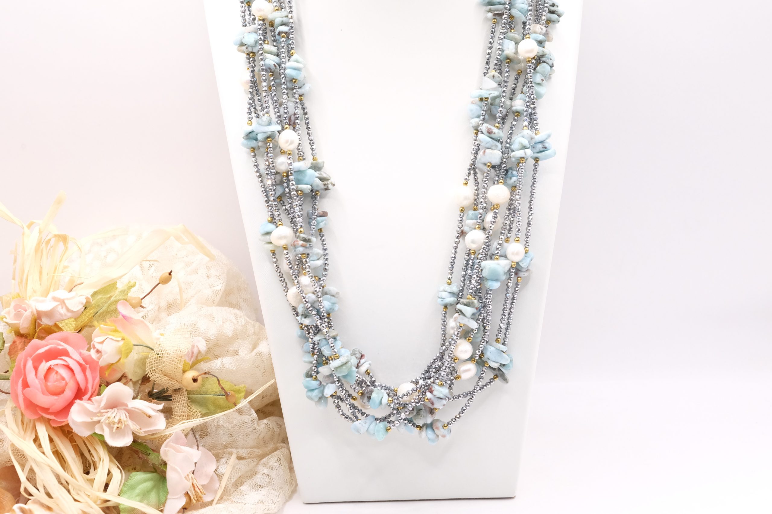 Stunning and elegant handcrafted multi-strand necklace (10 strands) in high quality silver zirconia alternating with larimar and natural pearls