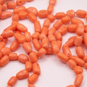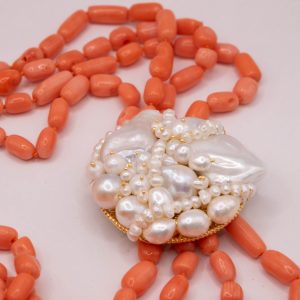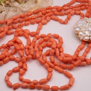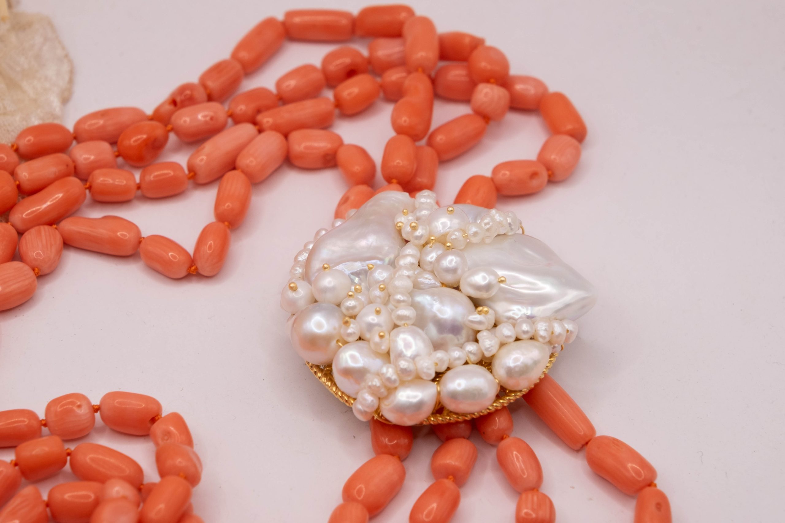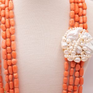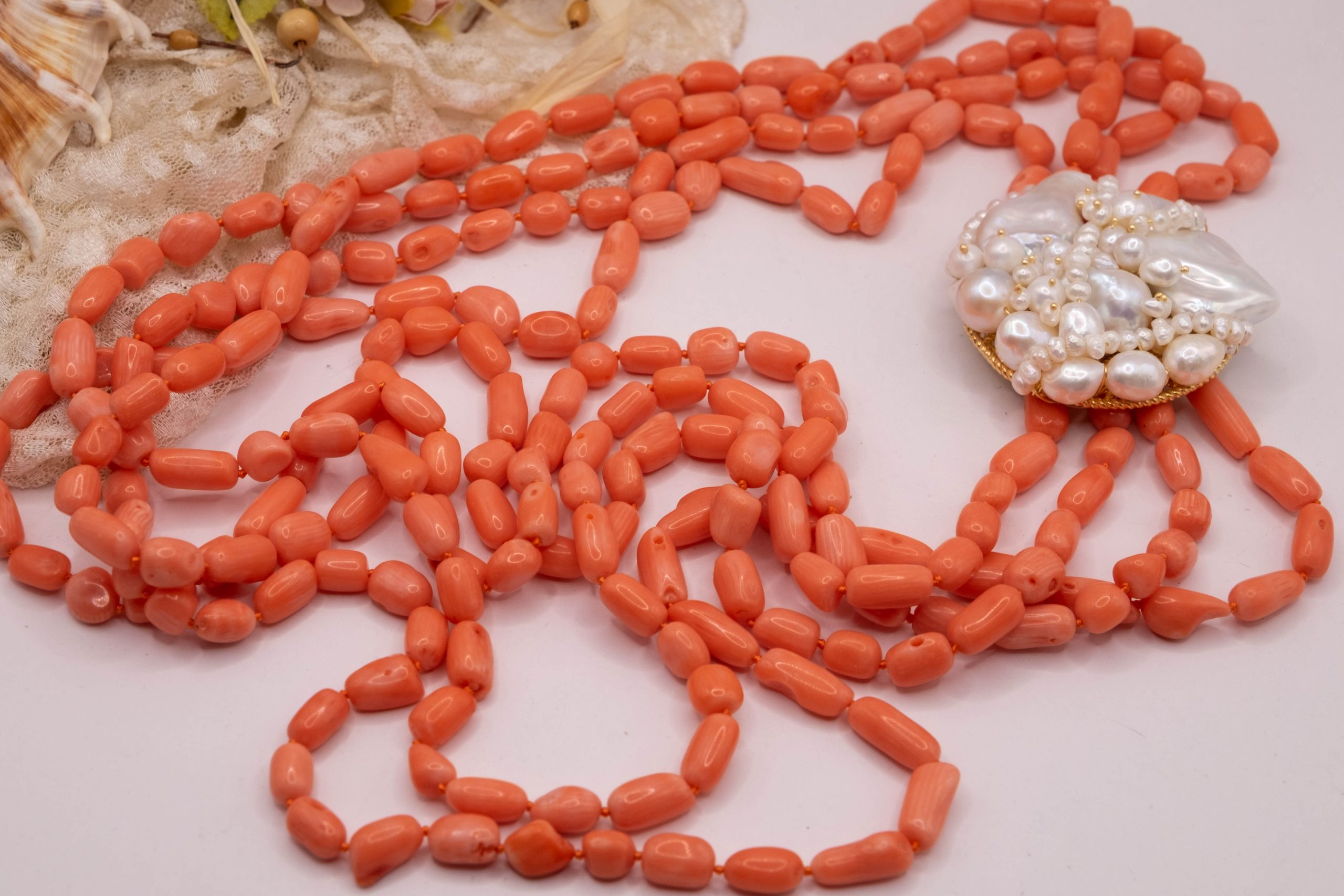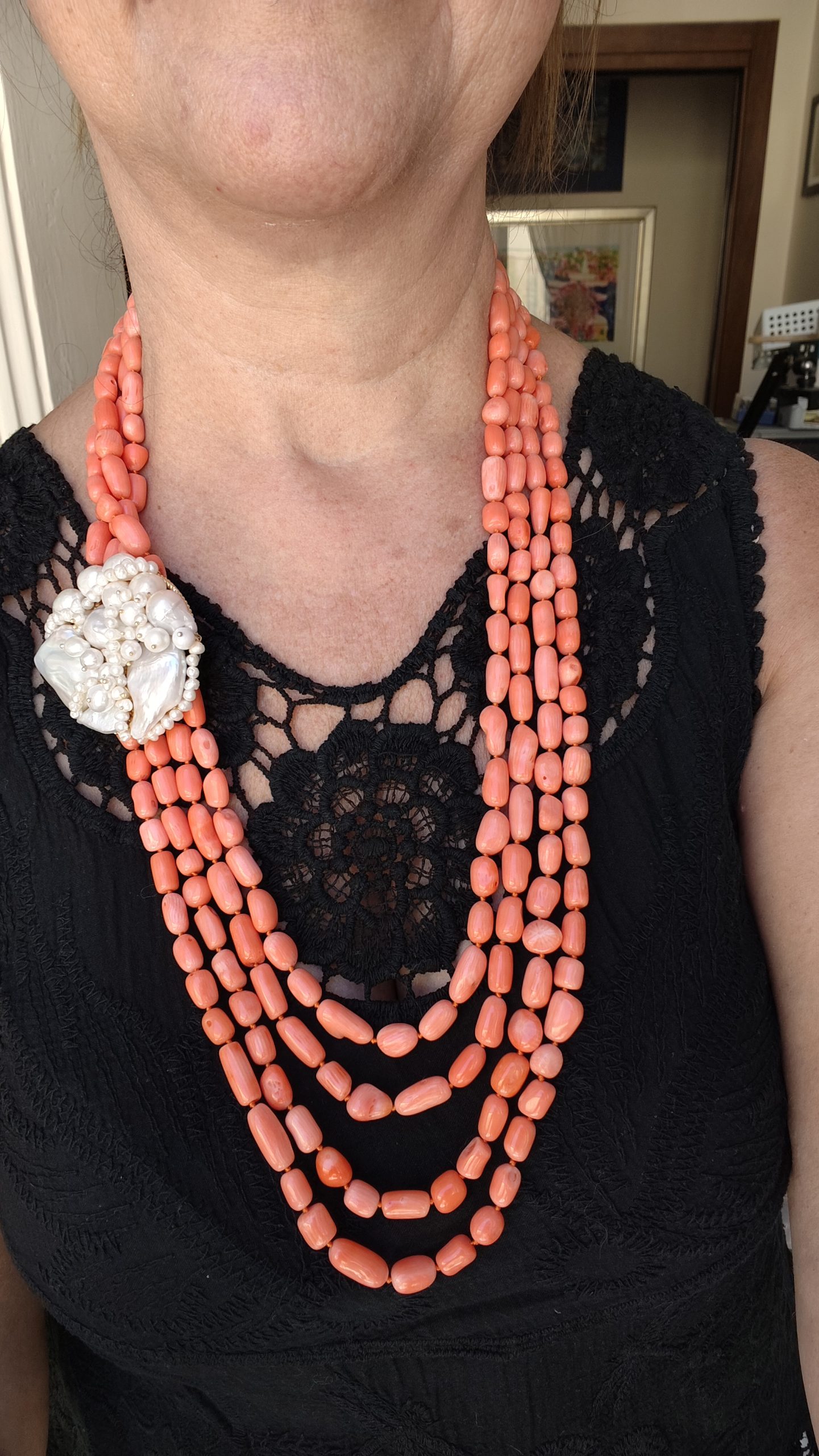 Long Multi-Strand Necklace with Bamboo Coral, Salmon Pink and Pearls