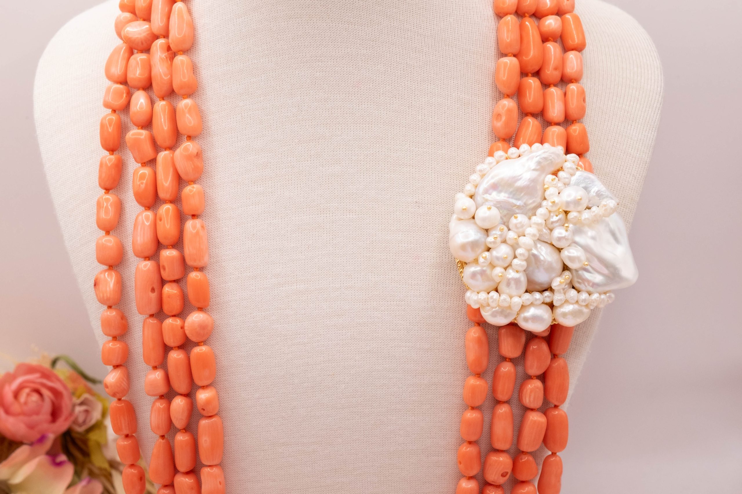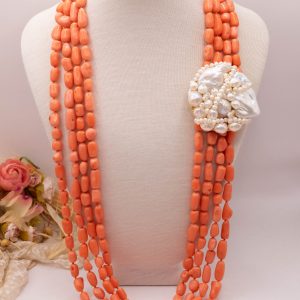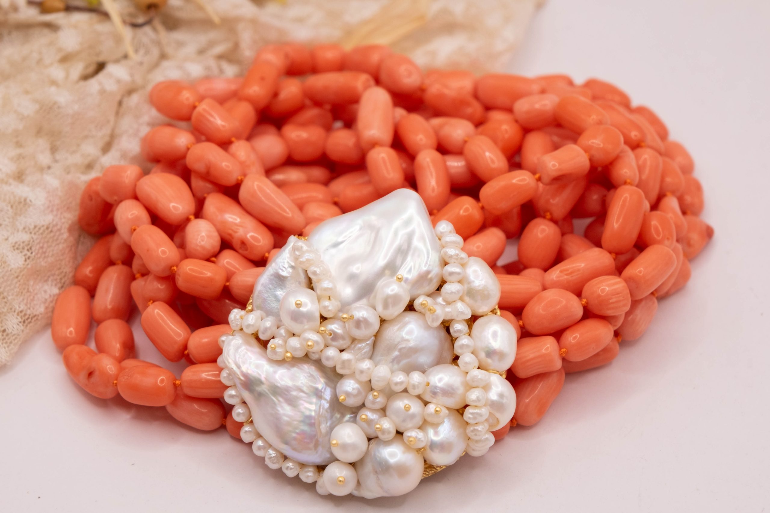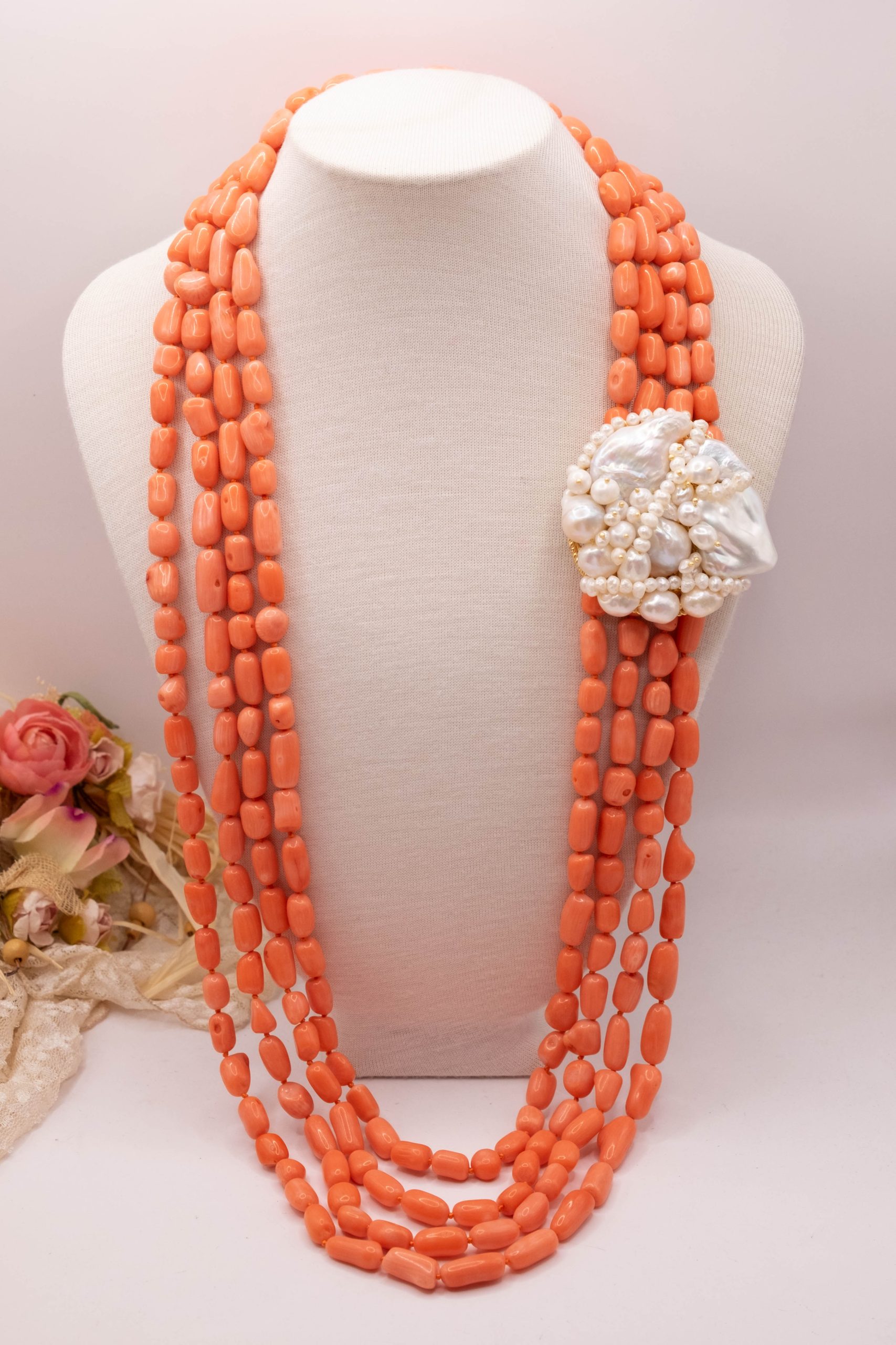 Beautiful and stunning 6cm long salmon pink bamboo coral 4-row necklace, hand-woven with luminous natural pearls.