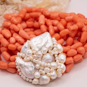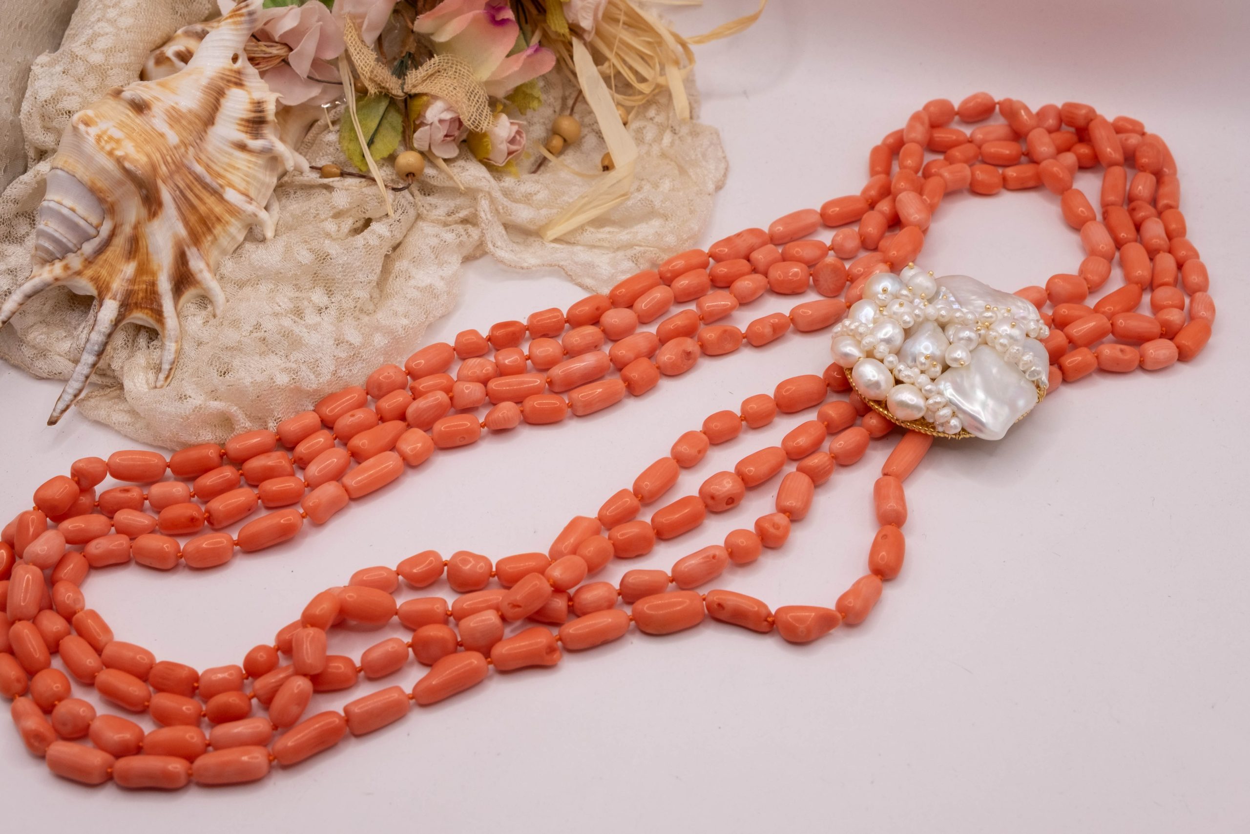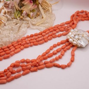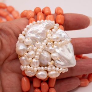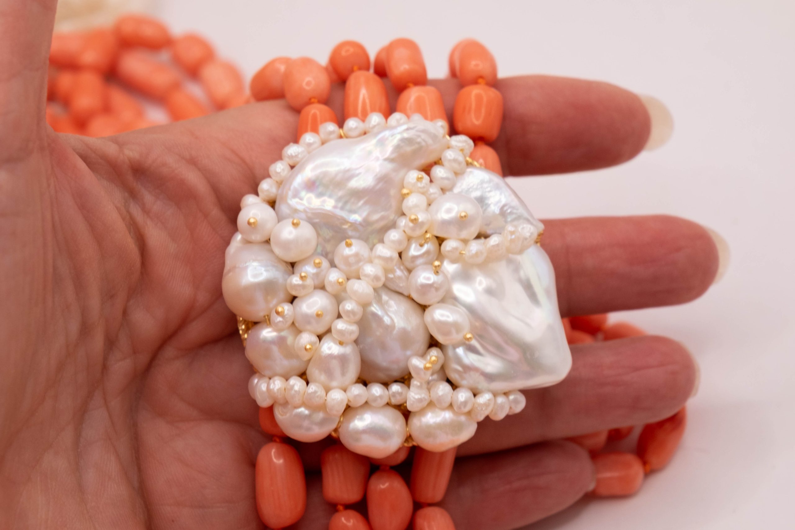 Beautiful and stunning 6cm long salmon pink bamboo coral 4-row necklace, hand-woven with luminous natural pearls.