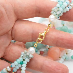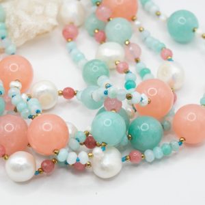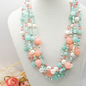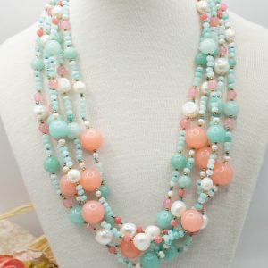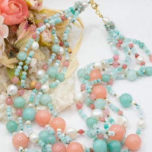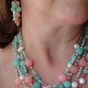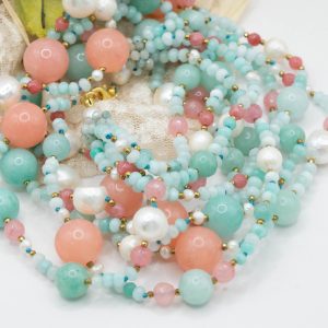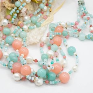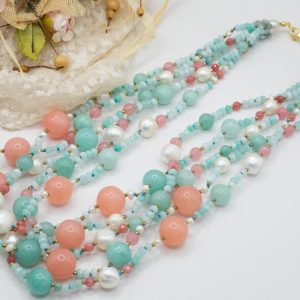 Necklace for "pastel" customers with 5 rows of natural stones: Strawberry Pink Jade, Amazonite and Pearls, for a combination of colors refined and feminine, perfect for enhancing your look with sophisticated and classy colors.