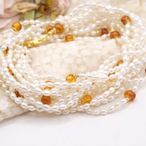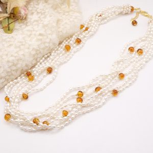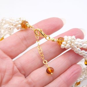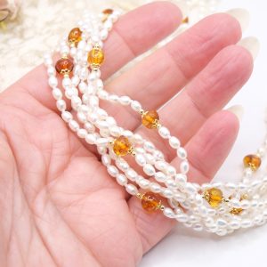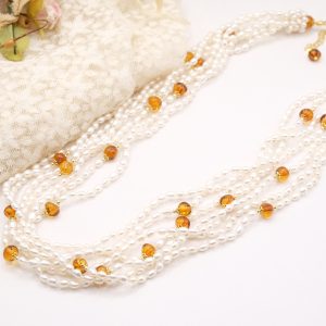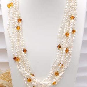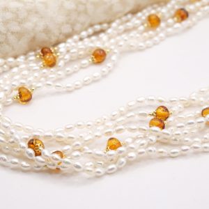 Add a touch of elegance and charm to your look with this elegant 7-strand multi-strand necklace in superlative, luminous micropearls and honey Baltic amber.