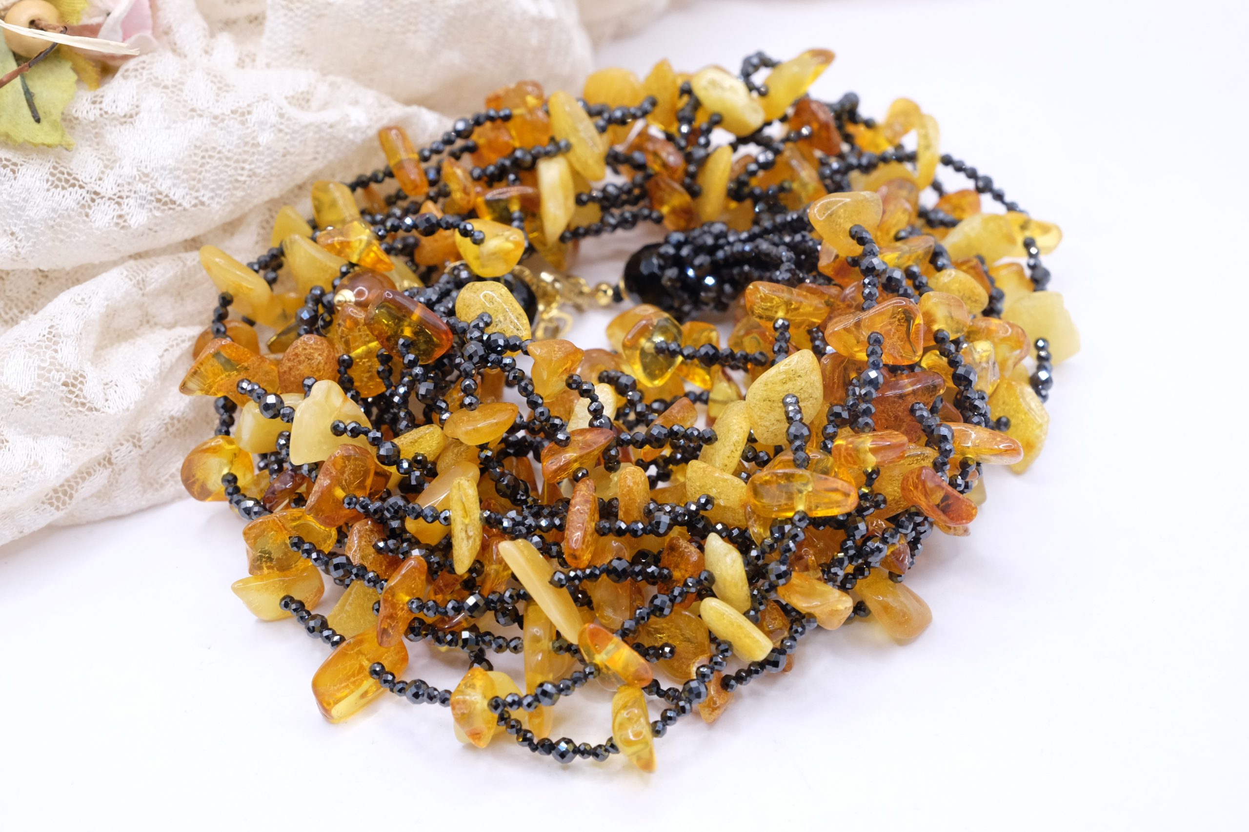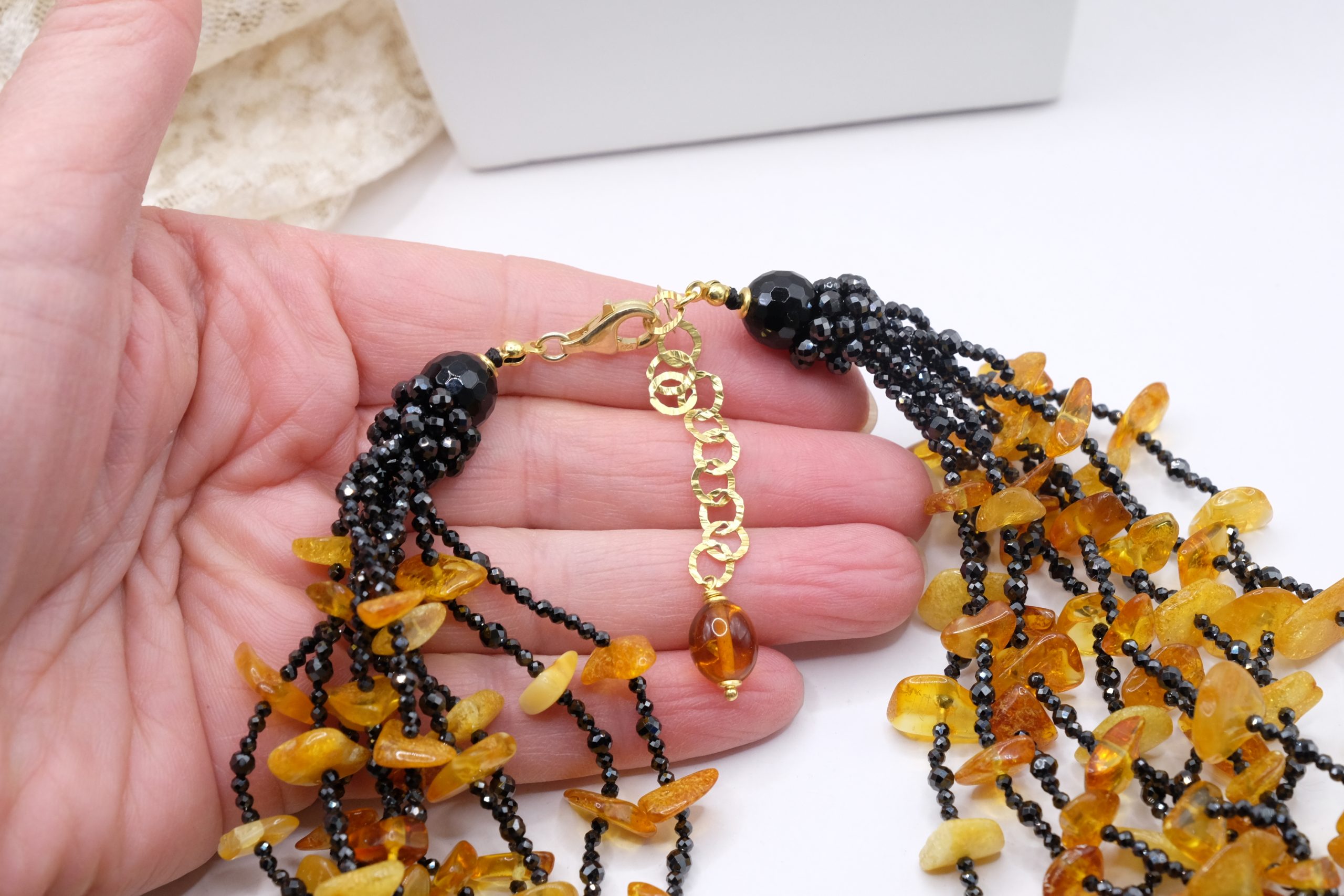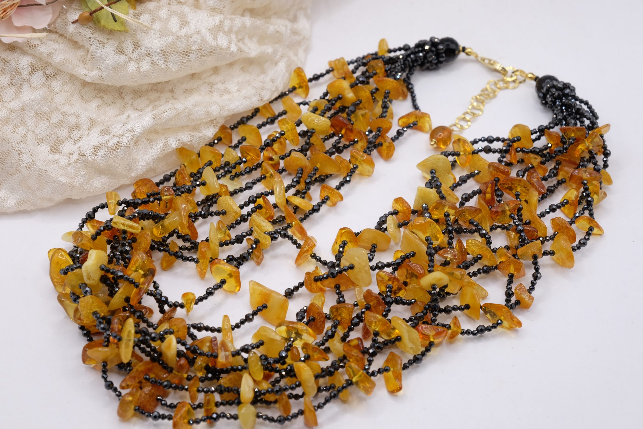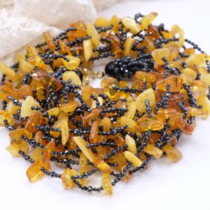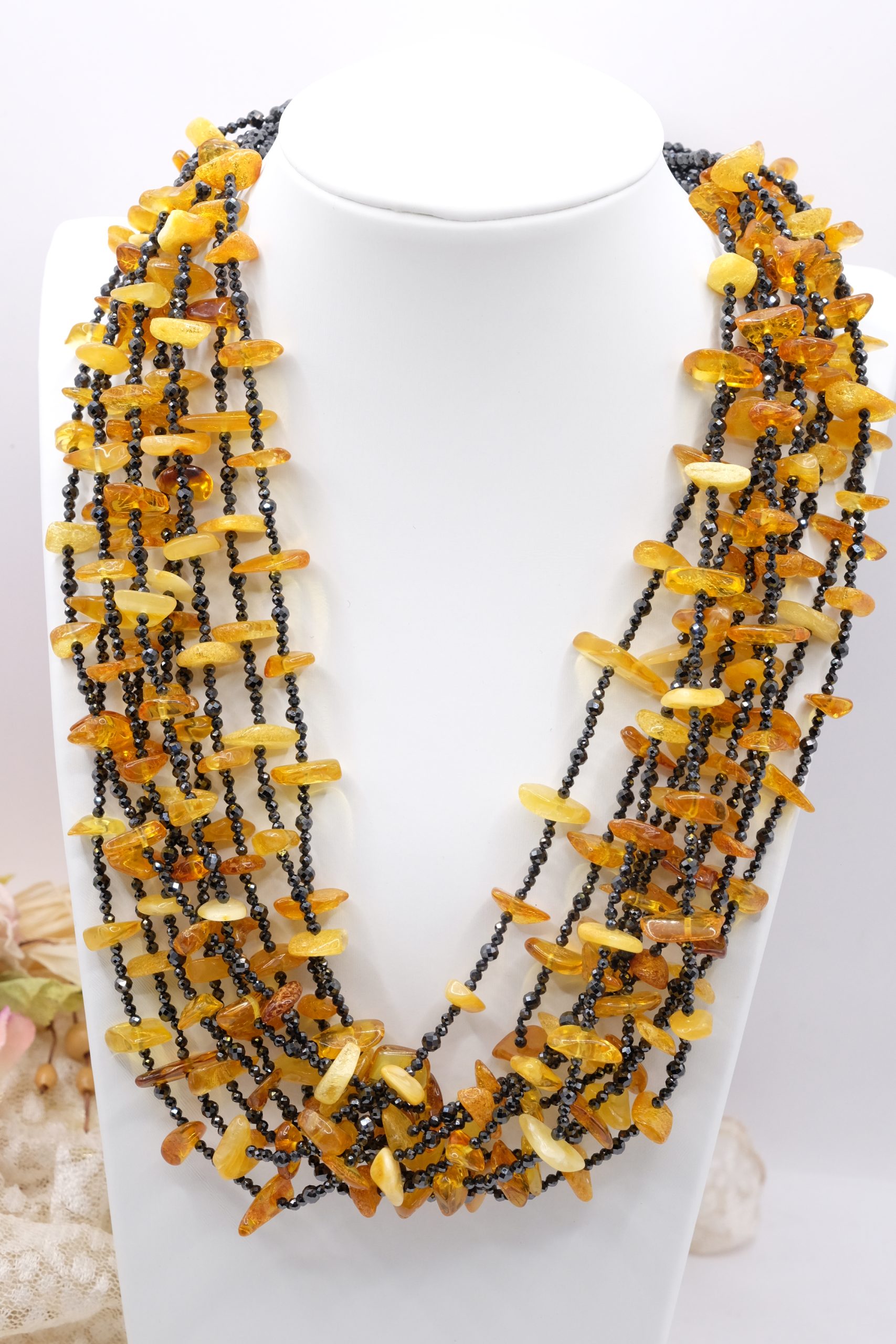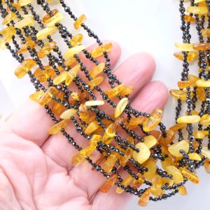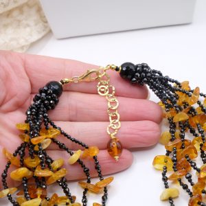 Multi-strand Necklace with Natural Black Zircons and Amber in 925 Silver